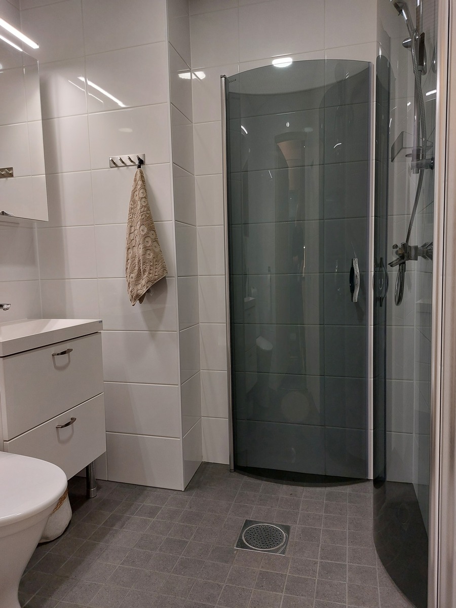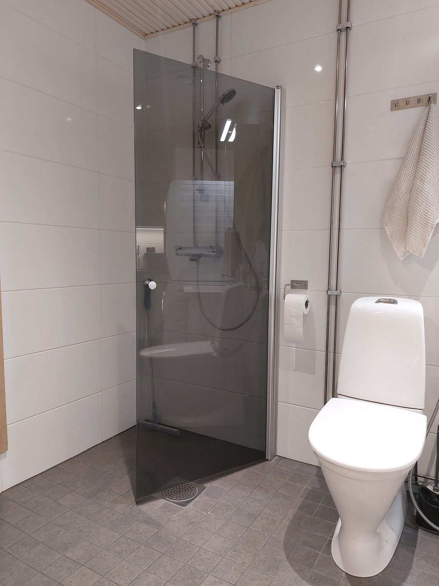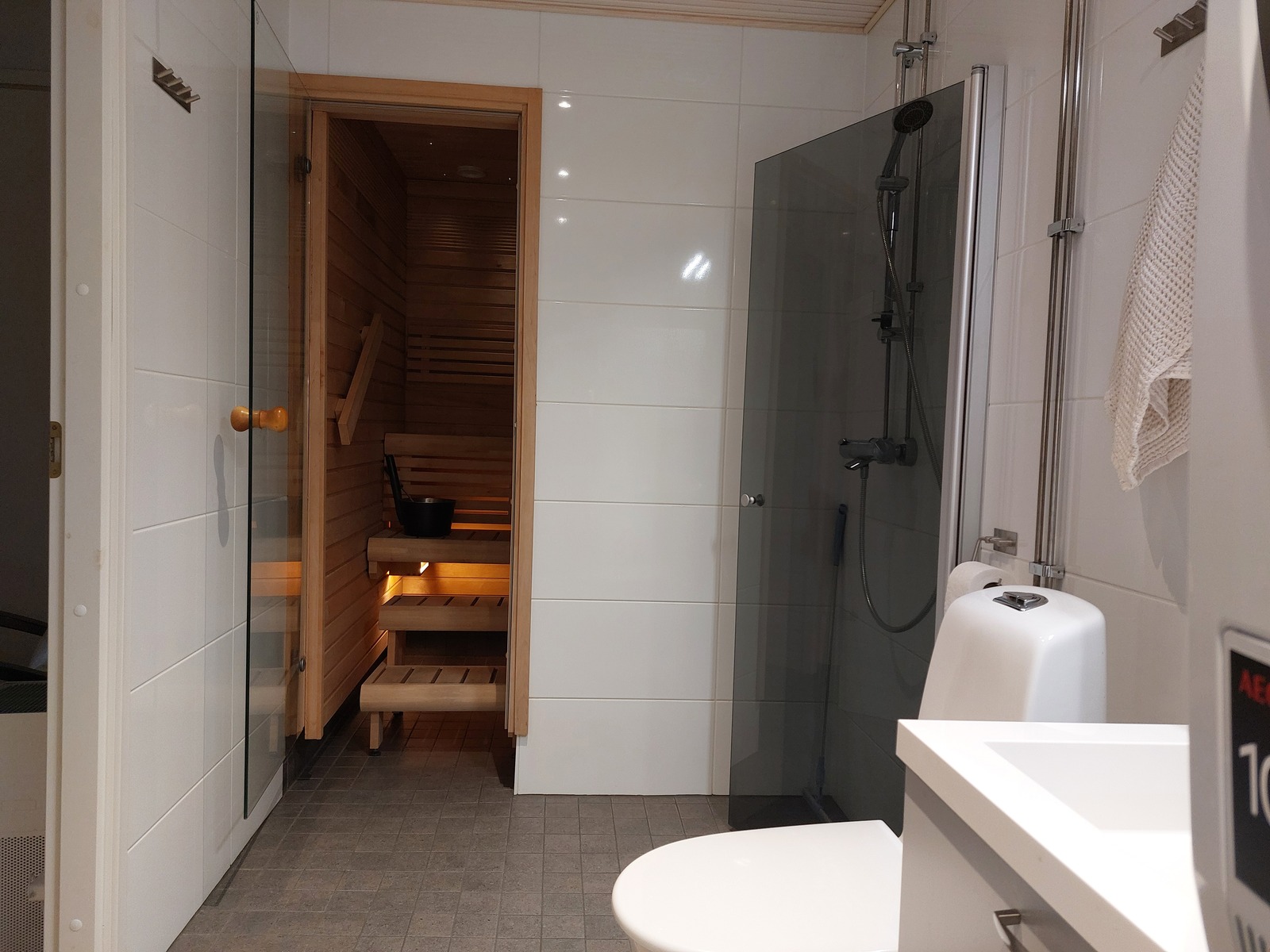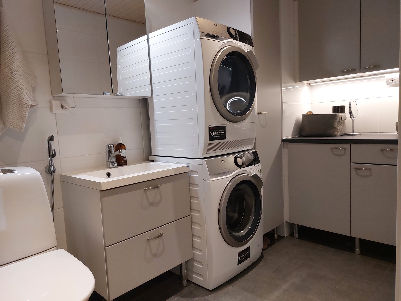 pesukoneliitäntä, suihku, peilikaappi, kiinteät valaisimet