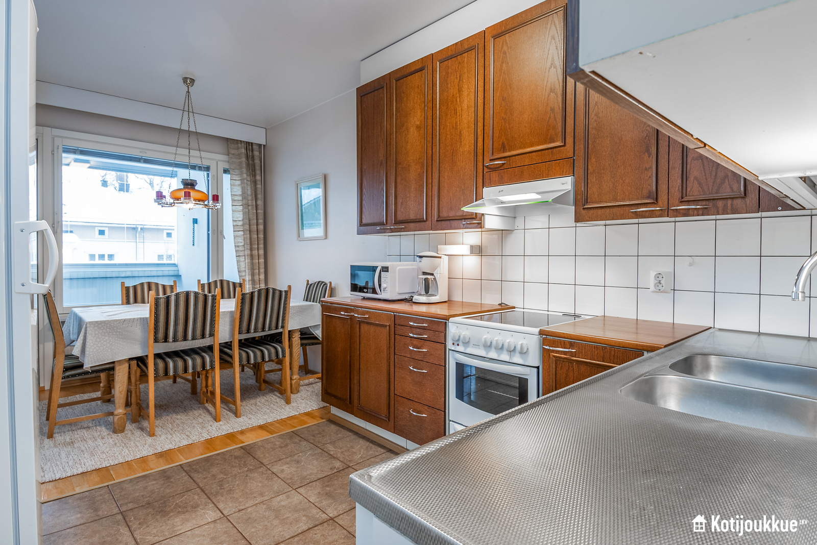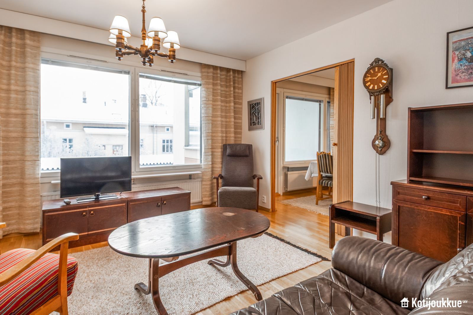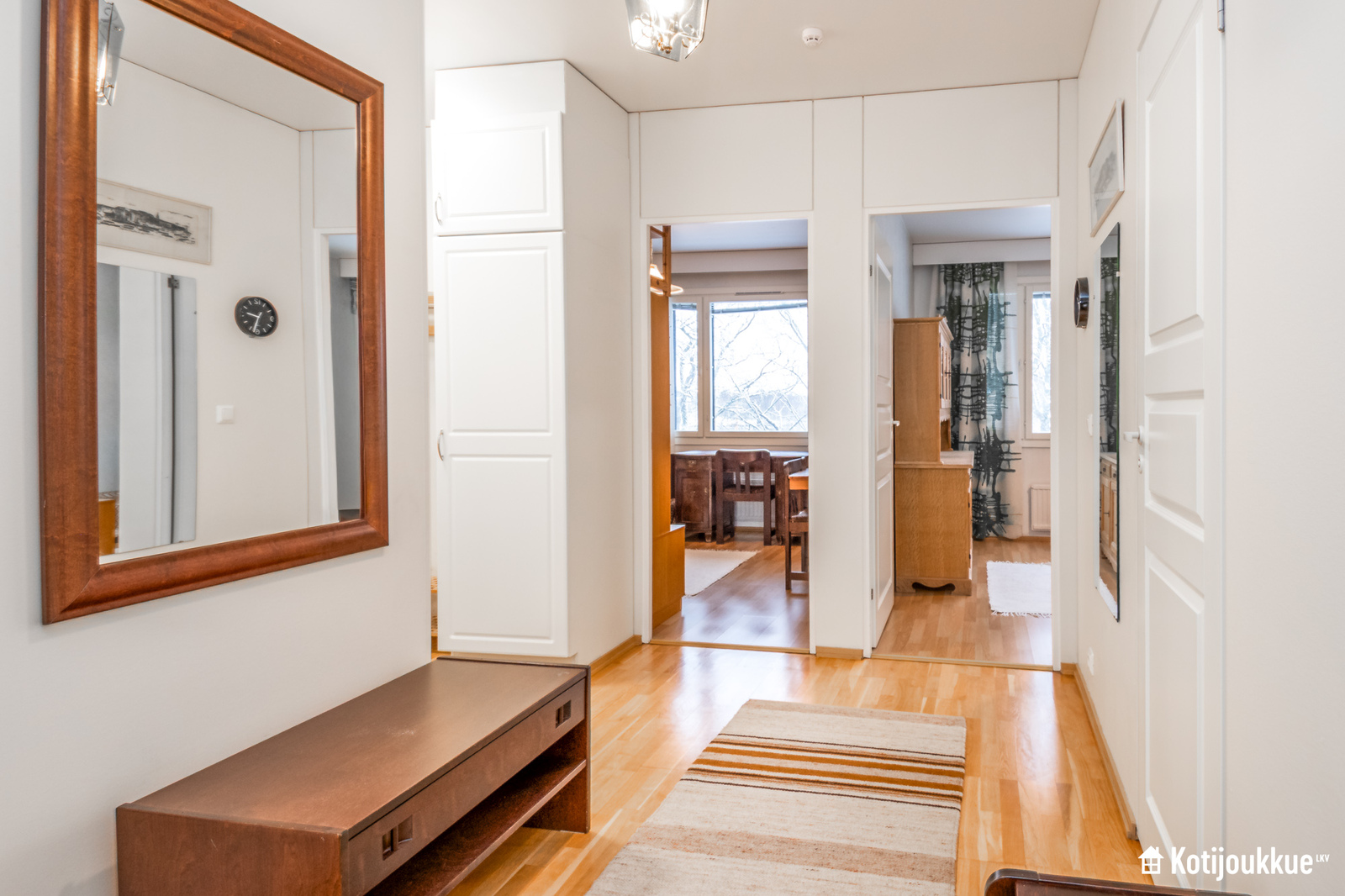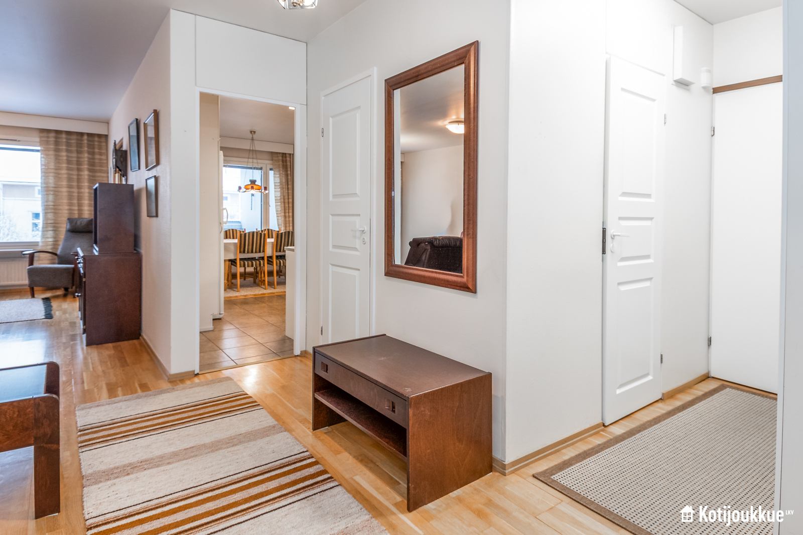Tämä asunto omaa todella toimivan ja tilavan pohjaratkaisun. Olohuone yhdistyy ruokailutilan kautta suoraan keittiöön ja isot ikkunat tekevät tilasta todella valoisan. Hyvän kokoiset makuuhuoneet säilytystiloineen ja kodissa on varsin tilava kylpyhuone yhdistettynä omaan saunaan. Säilytystarpeet on huomioitu huoneiston useiden kaapistojen sekä vaatehuoneen muodossa.
