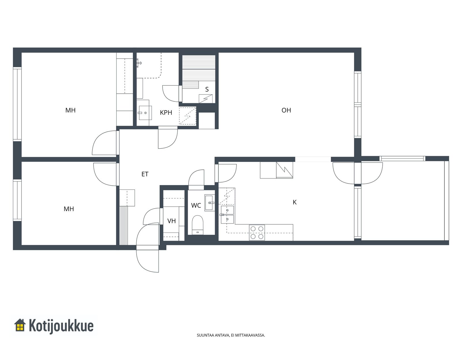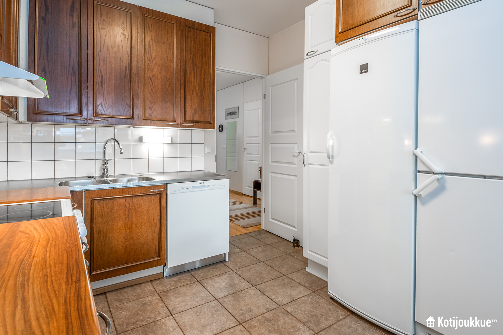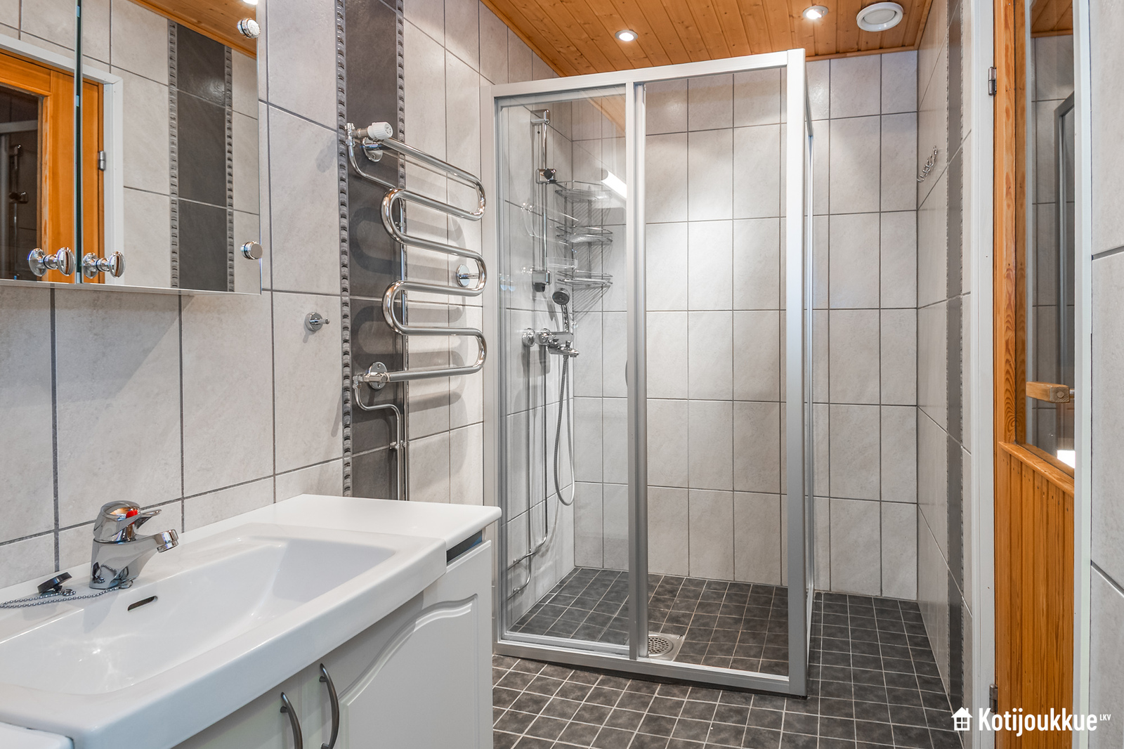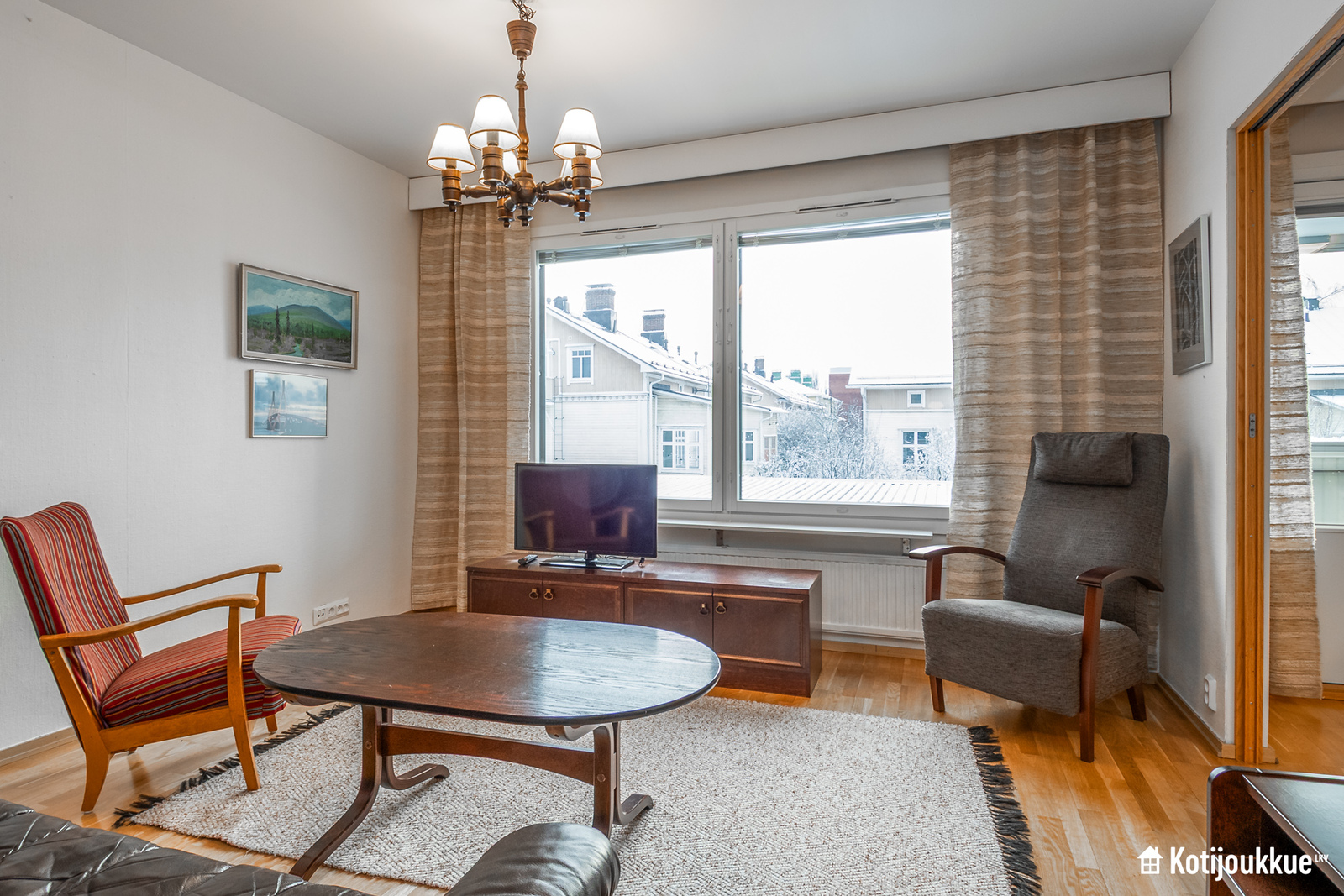 Tämä asunto omaa todella toimivan ja tilavan pohjaratkaisun. Olohuone yhdistyy ruokailutilan kautta suoraan keittiöön ja isot ikkunat tekevät tilasta todella valoisan. Hyvän kokoiset makuuhuoneet säilytystiloineen ja kodissa on varsin tilava kylpyhuone yhdistettynä omaan saunaan. Säilytystarpeet on huomioitu huoneiston useiden kaapistojen sekä vaatehuoneen muodossa.