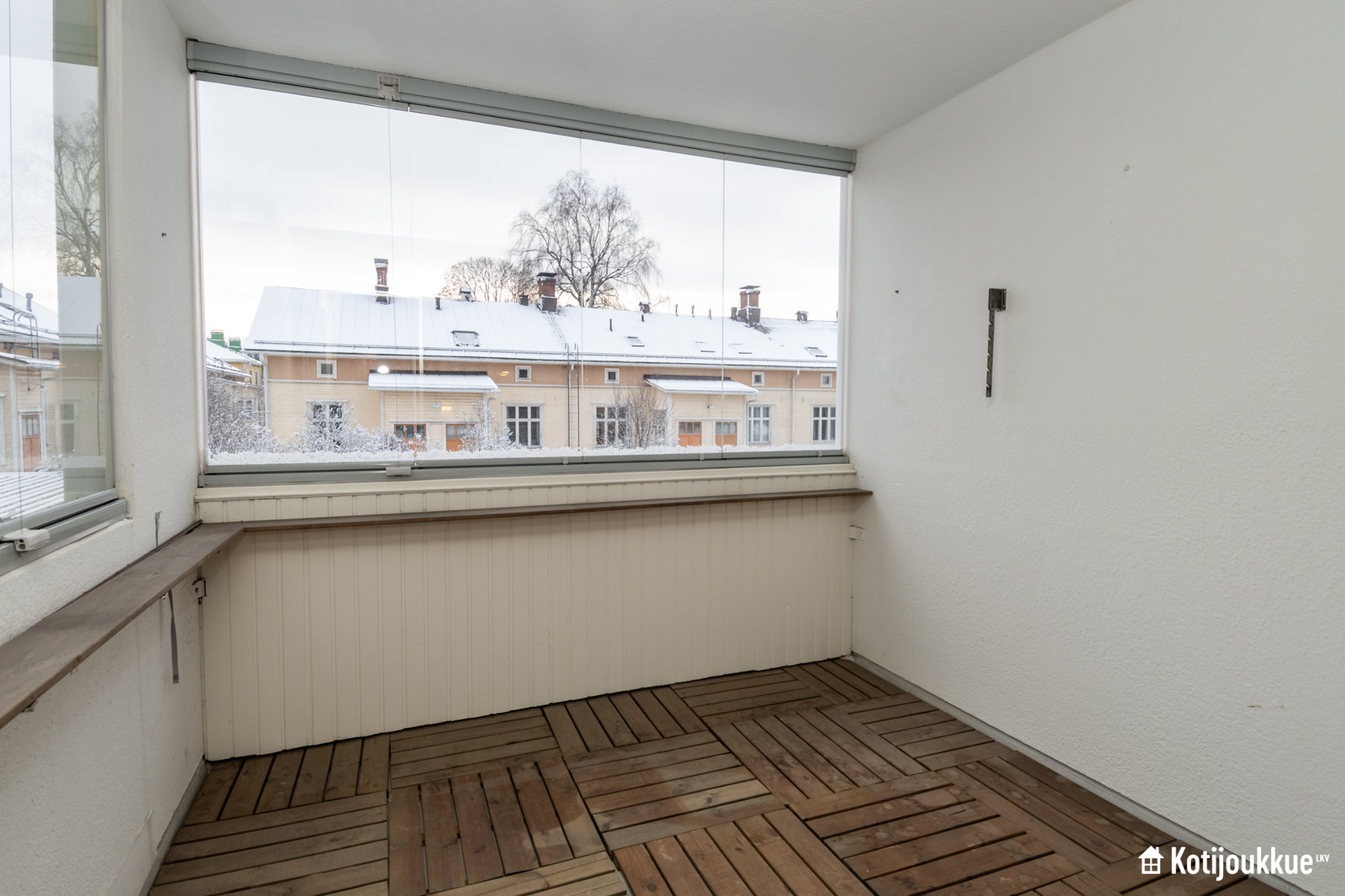 Kirsikkana kakun päällä on todella suuri lasitettu parveke, jota voi hyödyntää lisähuoneena aikaisesta keväästä pitkälle syksyyn saakka.