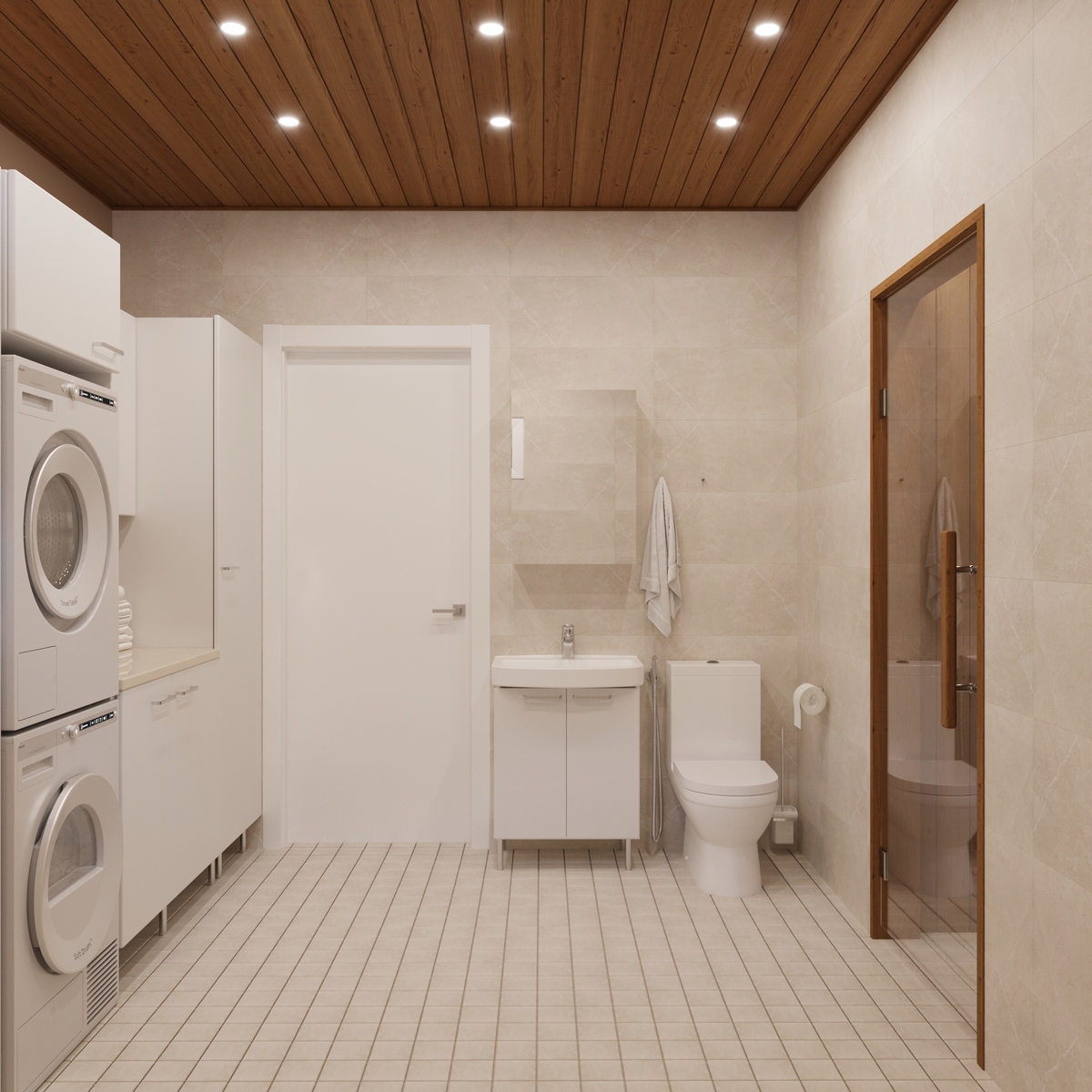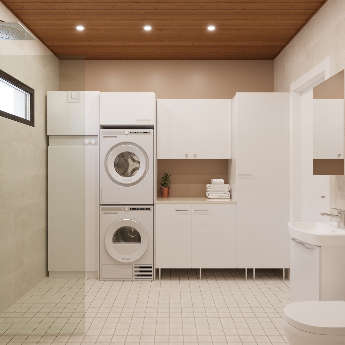 Kodinhoitohuone kylpyhuoneen yhteydessä.