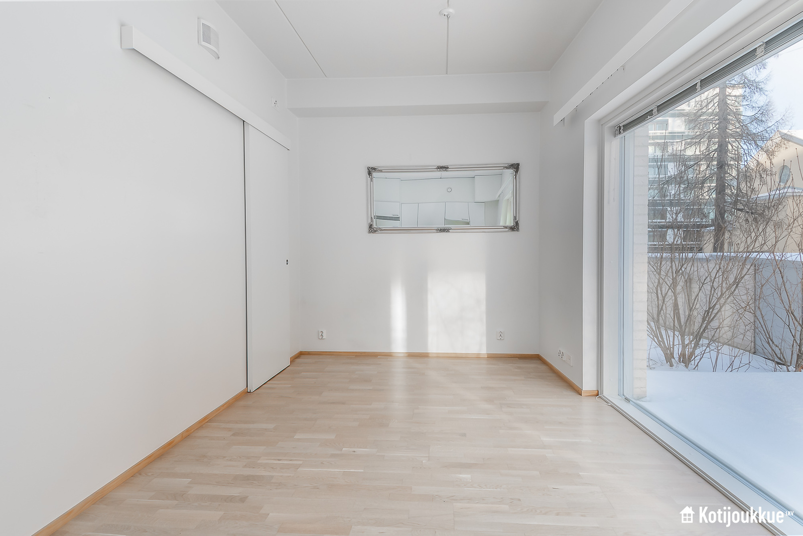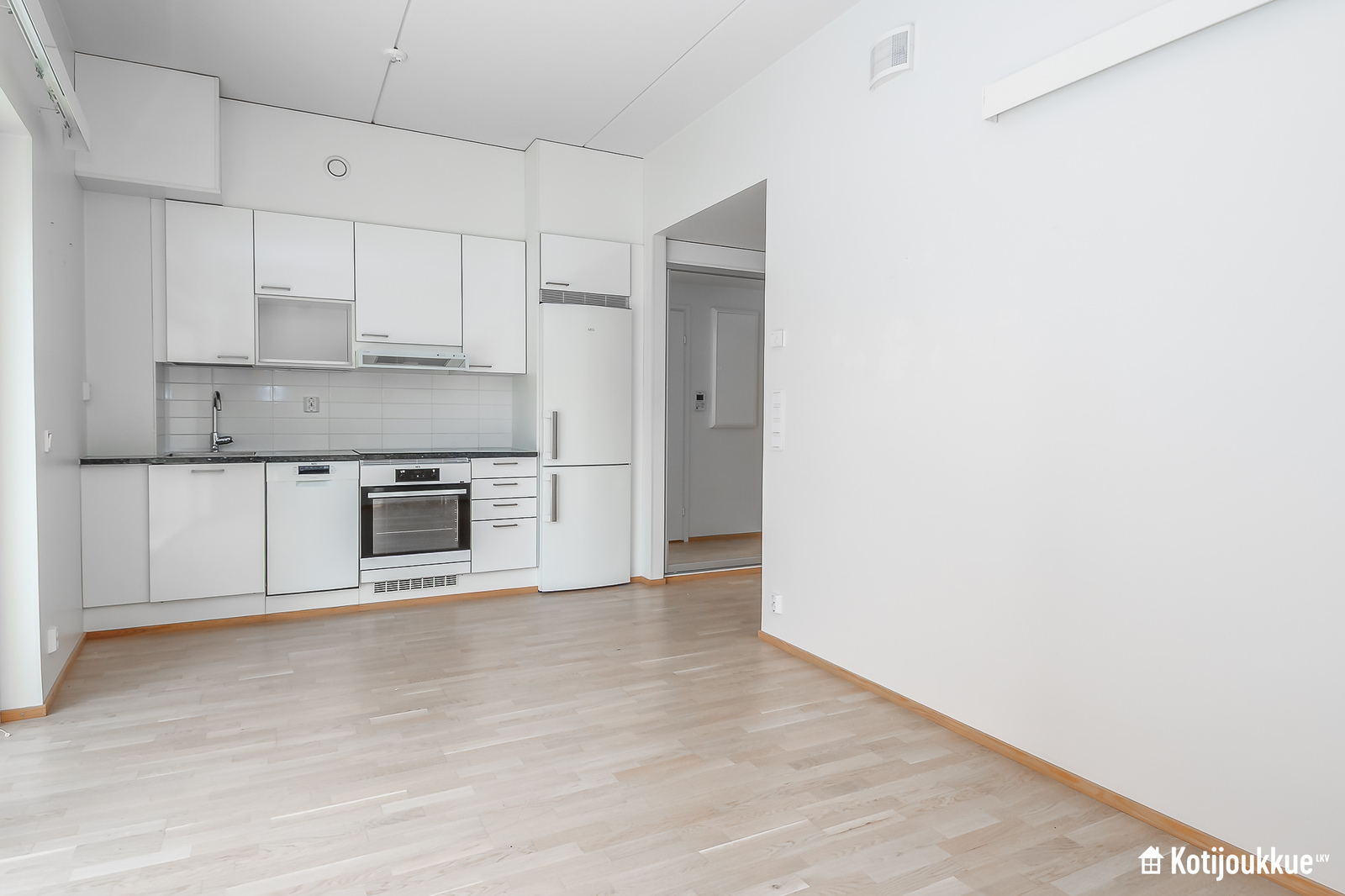 Keittiö on varusteltu laadukkain kodinkonein ja tyylikäs vaalea ilme tuo ilmavuutta ja raikkautta. Huoneessa on hyvin tilaa pienelle ruokailuryhmälle, sängylle ja oleskelutilan kalusteille. Säilytystilaa löytyy eteisen suurista kaapistoista ja nykyaikaisesta kylpyhuoneesta löytyy tietysti pesukoneliitäntä.