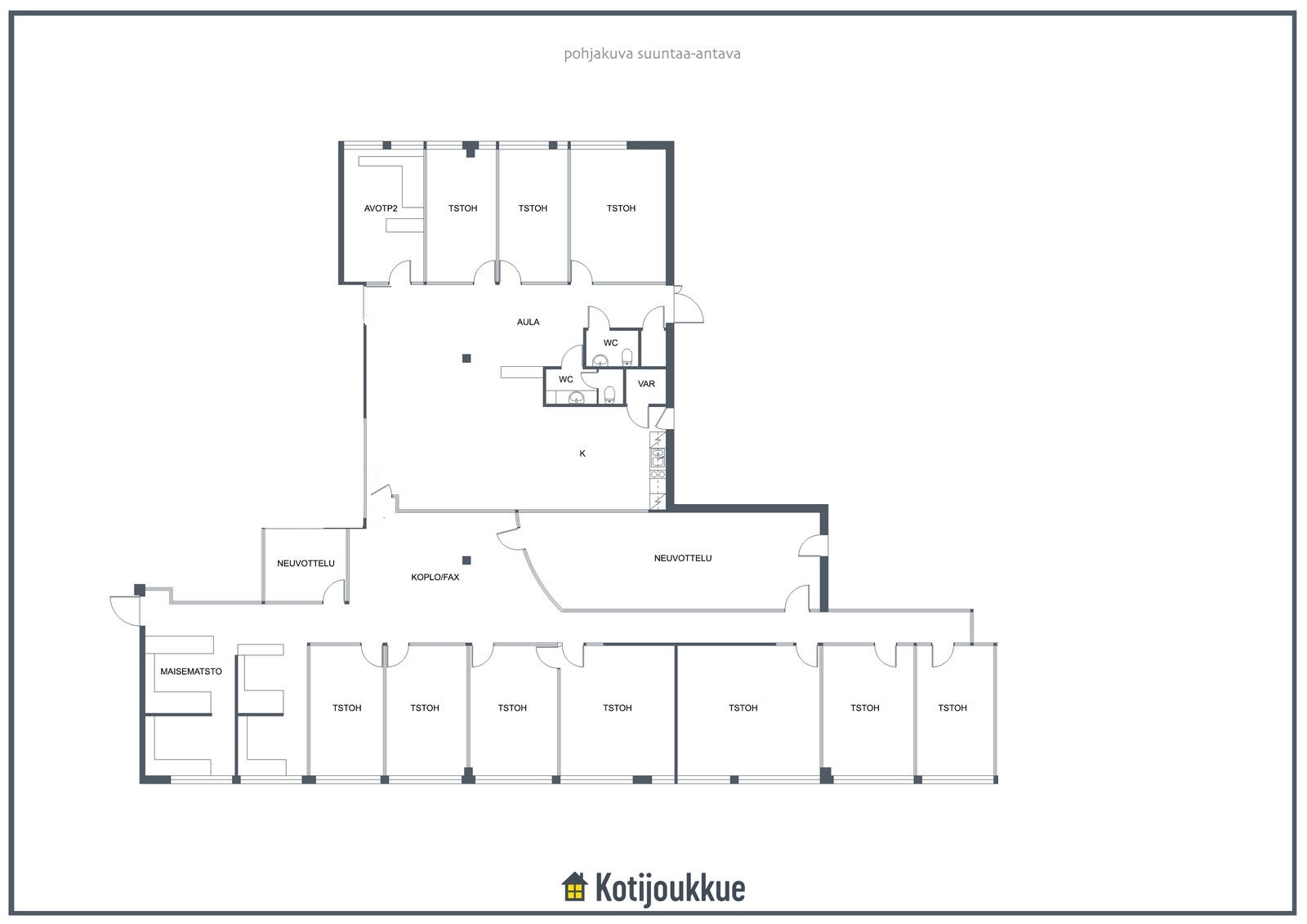Tila tarjoaa modernit ja viihtyisät työolosuhteet, jotka soveltuvat erinomaisesti toimisto-, asiantuntija-, koulutus-, valmennus- tai palvelukäyttöön. Pohjaratkaisu on selkeä, toimiva ja hyvin muokattavissa eri tarpeisiin. Kokonaisuus sisältää useita toimistohuoneita, neuvottelutiloja, avaraa aula- ja yhteistilaa sekä toimivat sosiaali- ja keittiötilat.