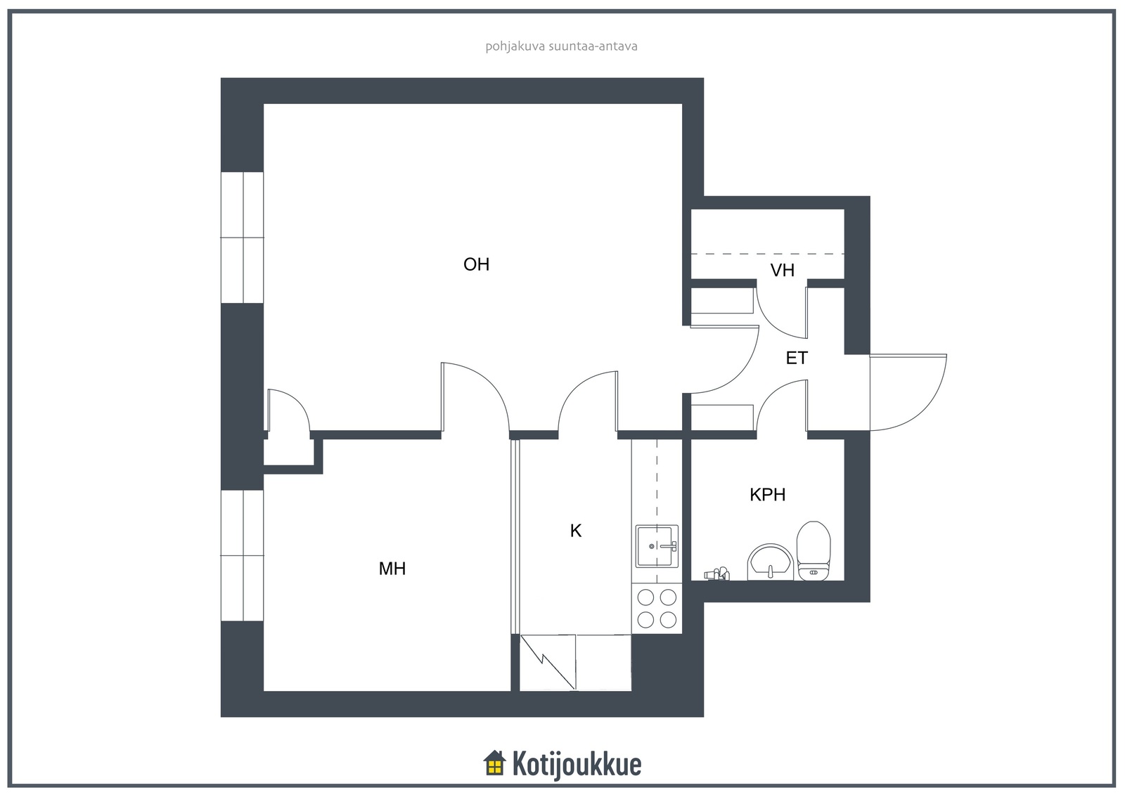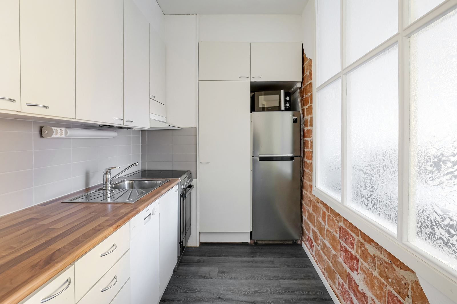 Eteisestä löytyy paljon säilytystilaa sekä siistikuntoinen kylpyhuone, joka on saanut uudet pinnat putkiremontin yhteydessä 2011. Valoisa sekä avara olohuoneen ja ruokailutilan yhdistelmä on tämän kodin sydän ja siellä riittää reilusti tilaa oleskeluun. Siistikuntoisessa, kompaktissa, mutta toimivassa keittokomerosta löytyy kaikki tarpeellinen ja valoa sinne on tuomassa suurikokoinen ikkuna. Makuuhuone on mukavan kokoinen ja tilan puolesta sinne sopii myös pieni työpiste.