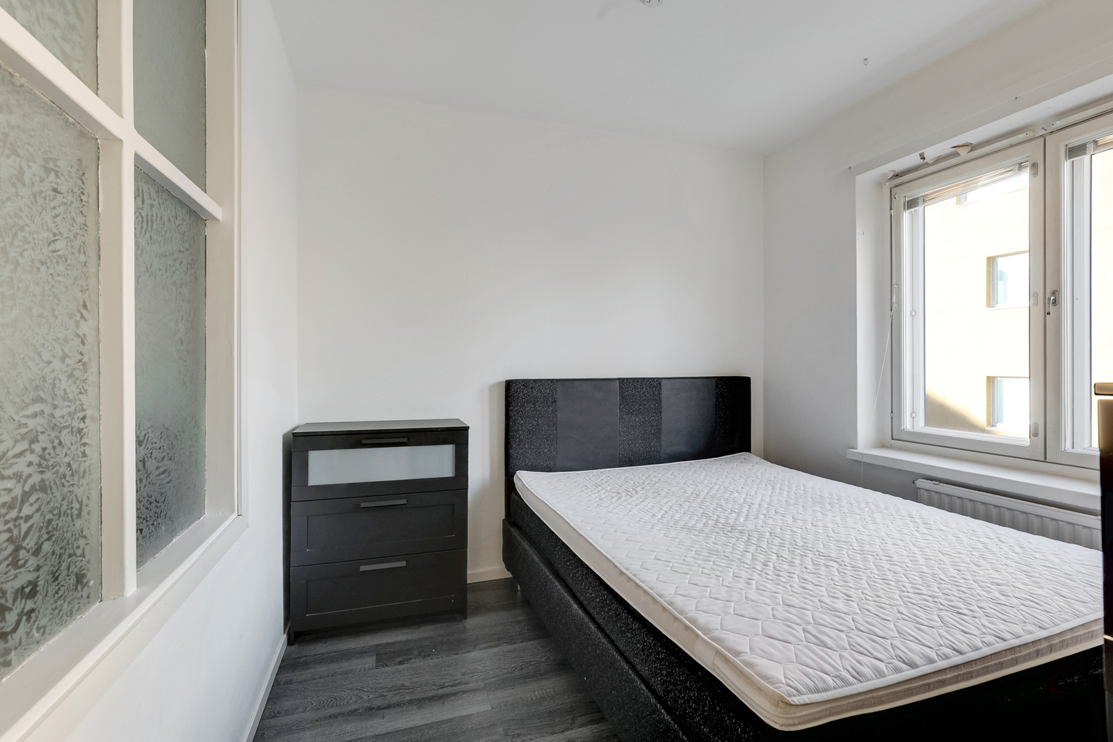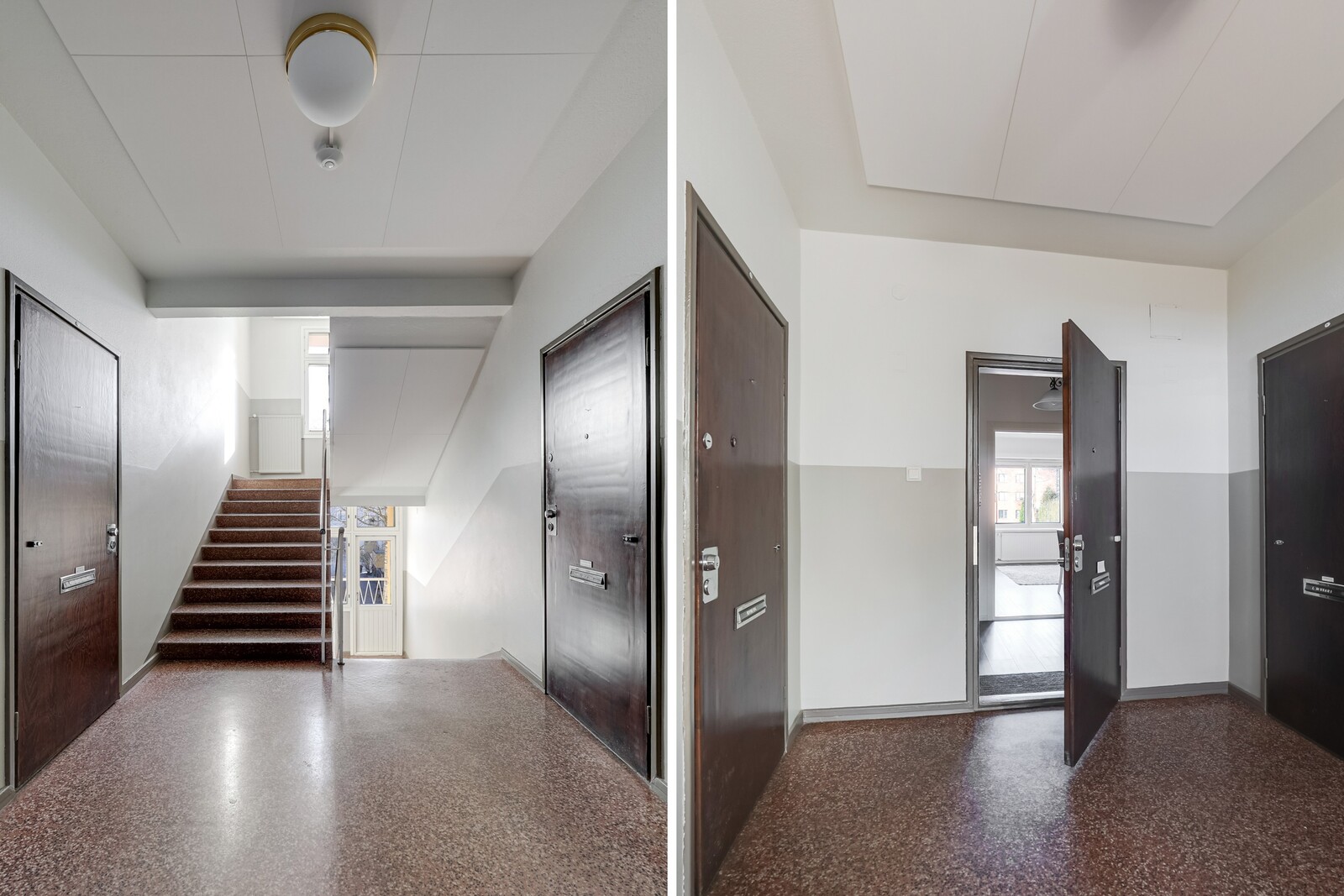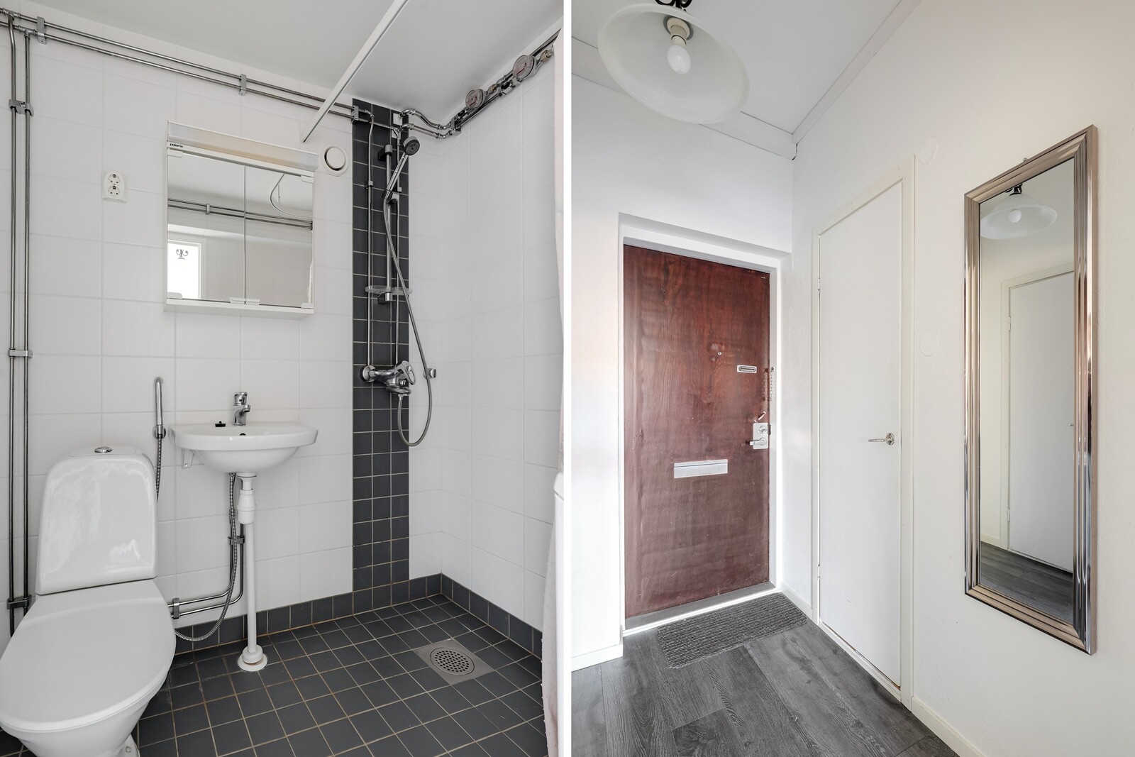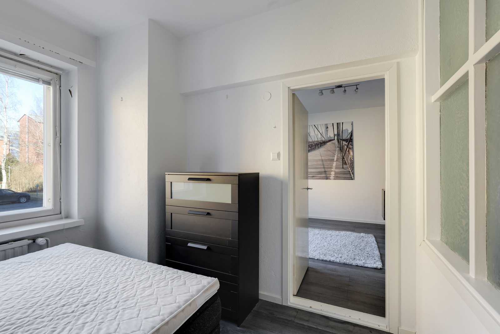 I hallen finns gott om förvaringsutrymme samt ett snyggt badrum som fick nya ytskikt i samband med rörsaneringen 2011. Det ljusa och rymliga vardagsrummet i kombination med matplatsen utgör hemmets hjärta och erbjuder gott om plats för umgänge. Det prydliga, kompakta men funktionella kokvrån har allt som behövs, och ett stort fönster släpper in fint med dagsljus. Sovrummet är i behaglig storlek och rymmer även en mindre arbetsplats.