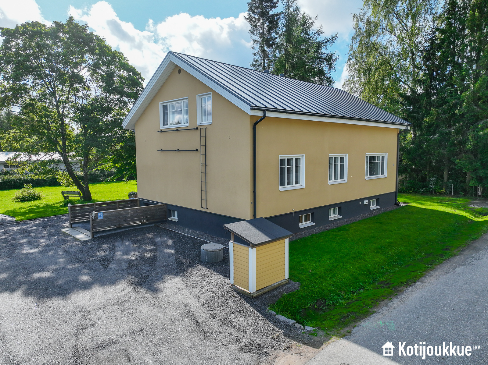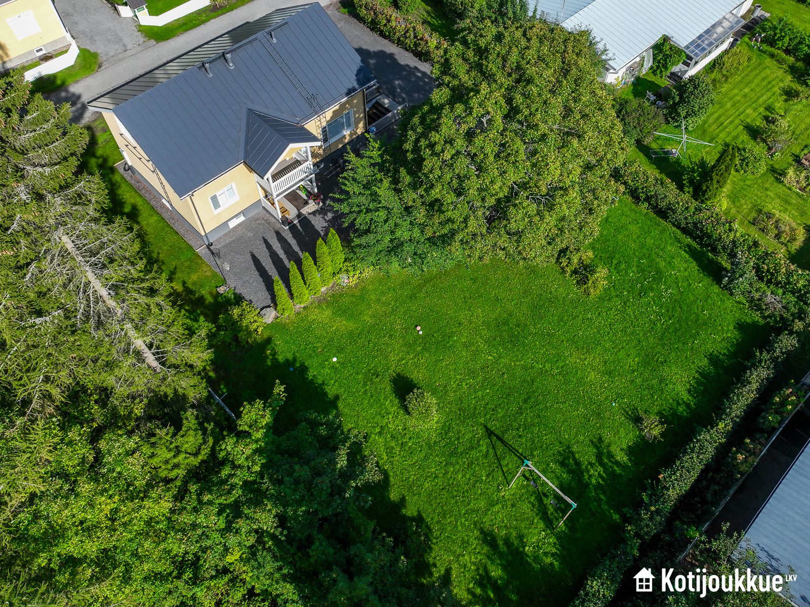 Egen tomt och bekymmersfri fjärrvärme garanterar förmånliga boendekostnader året runt. Grönskande gårdsplan, träd och buskar. Tomten omges helt av en skyddande häck, vilket garanterar ett bra insynsskydd mot grannarna. Den rymliga gårdsplanen är en trygg plats för barnens lek ¬– utan att glömma husdjuren. På tomten finns även gott om plats för blomplanteringar, en solterrass eller ett potatisland. Det finns också bygglov för en garagebyggnad (våningsyta 63 m2/total yta 117 m2).