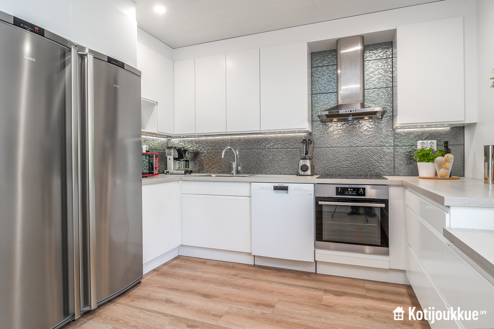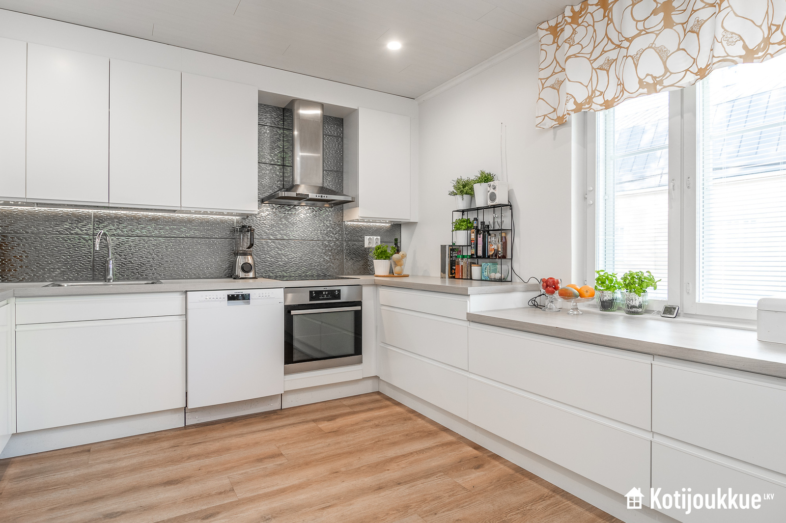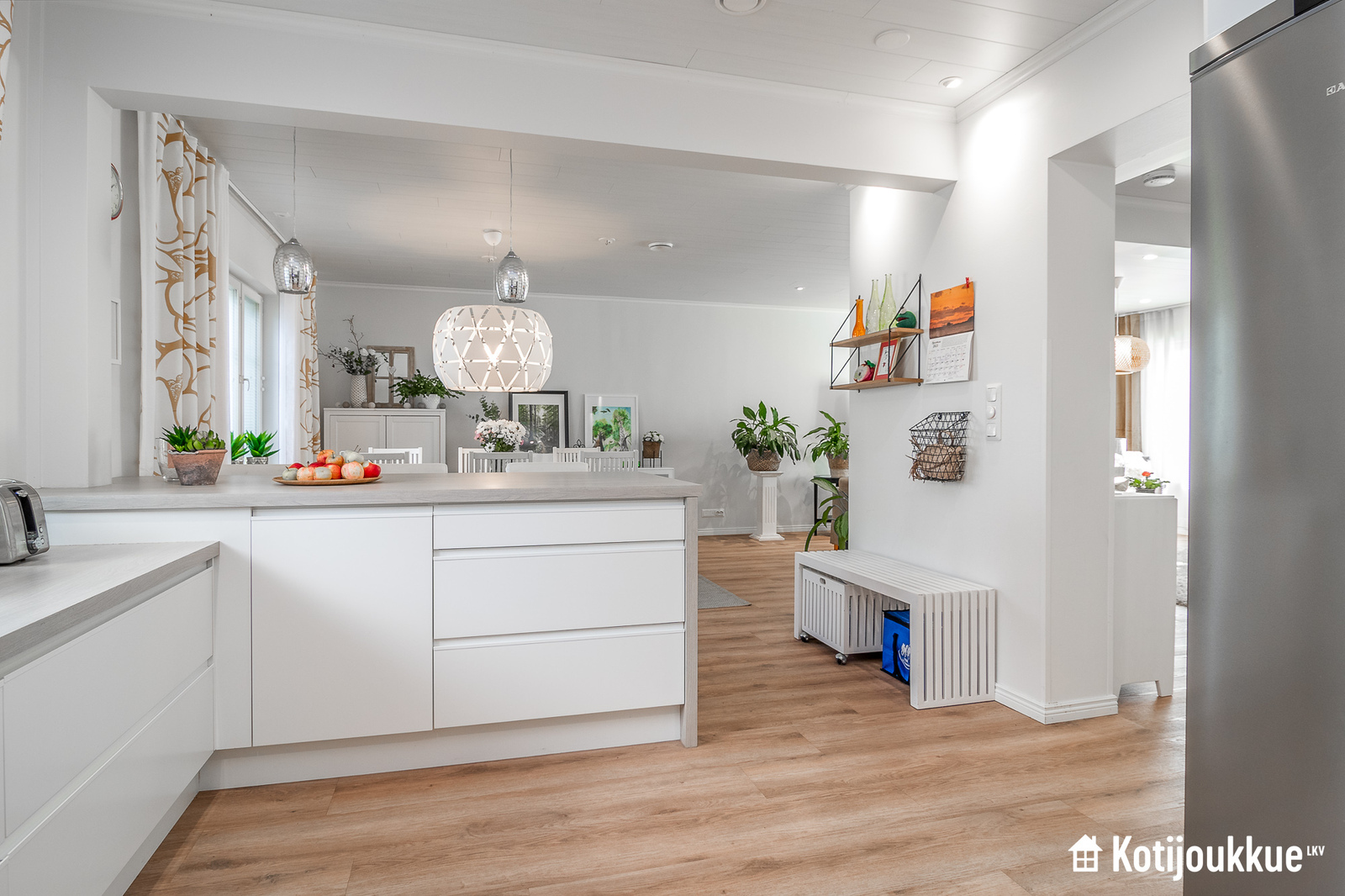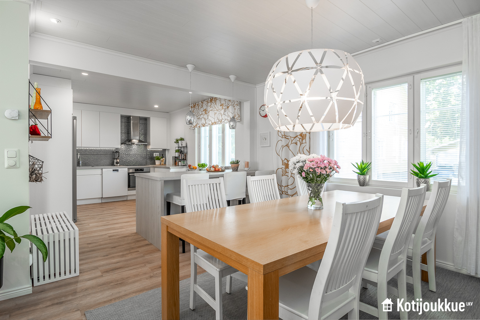 Perheen oleskelun keskipisteenä oleva olohuone-ruokailu-keittiö on avara ja valoisa kokonaisuus, jonka laadukas keittiö saarekkeineen hurmaa käyttäjänsä – kiitos runsaiden säilytystilojen, tasokkaiden kodinkoneiden ja tyylikkään yleisilmeen.