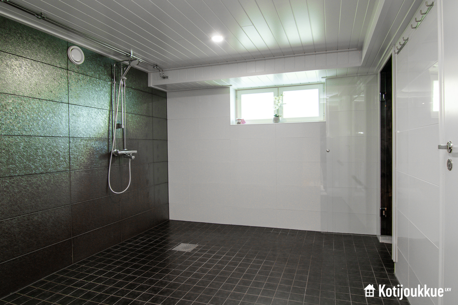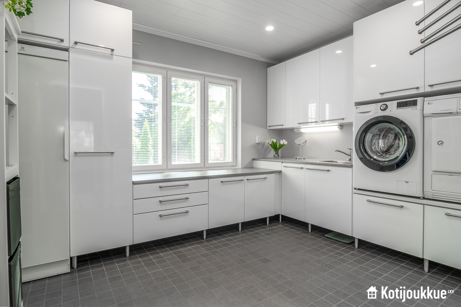 Perheen arkea helpottavat käytännönläheiset ratkaisut, kuten tilava ja valoisa kodinhoitohuone, joka sijaitsee sisäänkäynnin välittömässä läheisyydessä. Alakerrassa on myös yksi viidestä makuuhuoneesta.