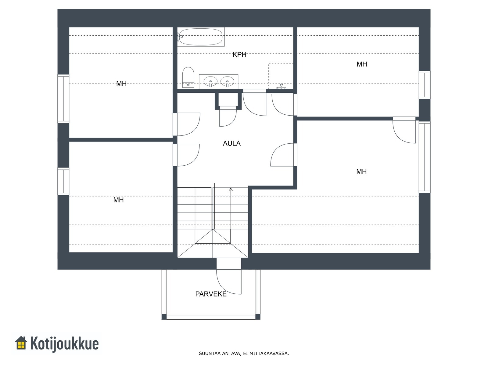 Yläkerrassa sijaitsee neljän makuuhuoneen lisäksi erillinen kylpyhuone kylpyammeella varustettuna.