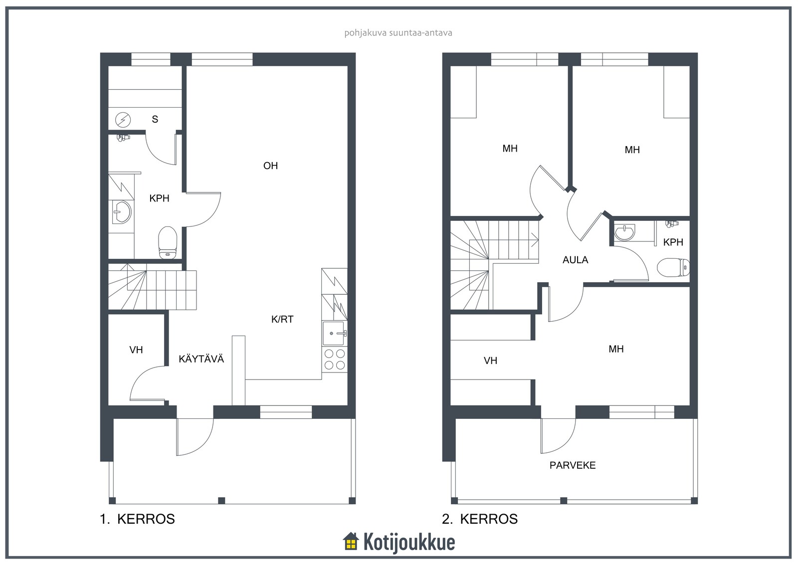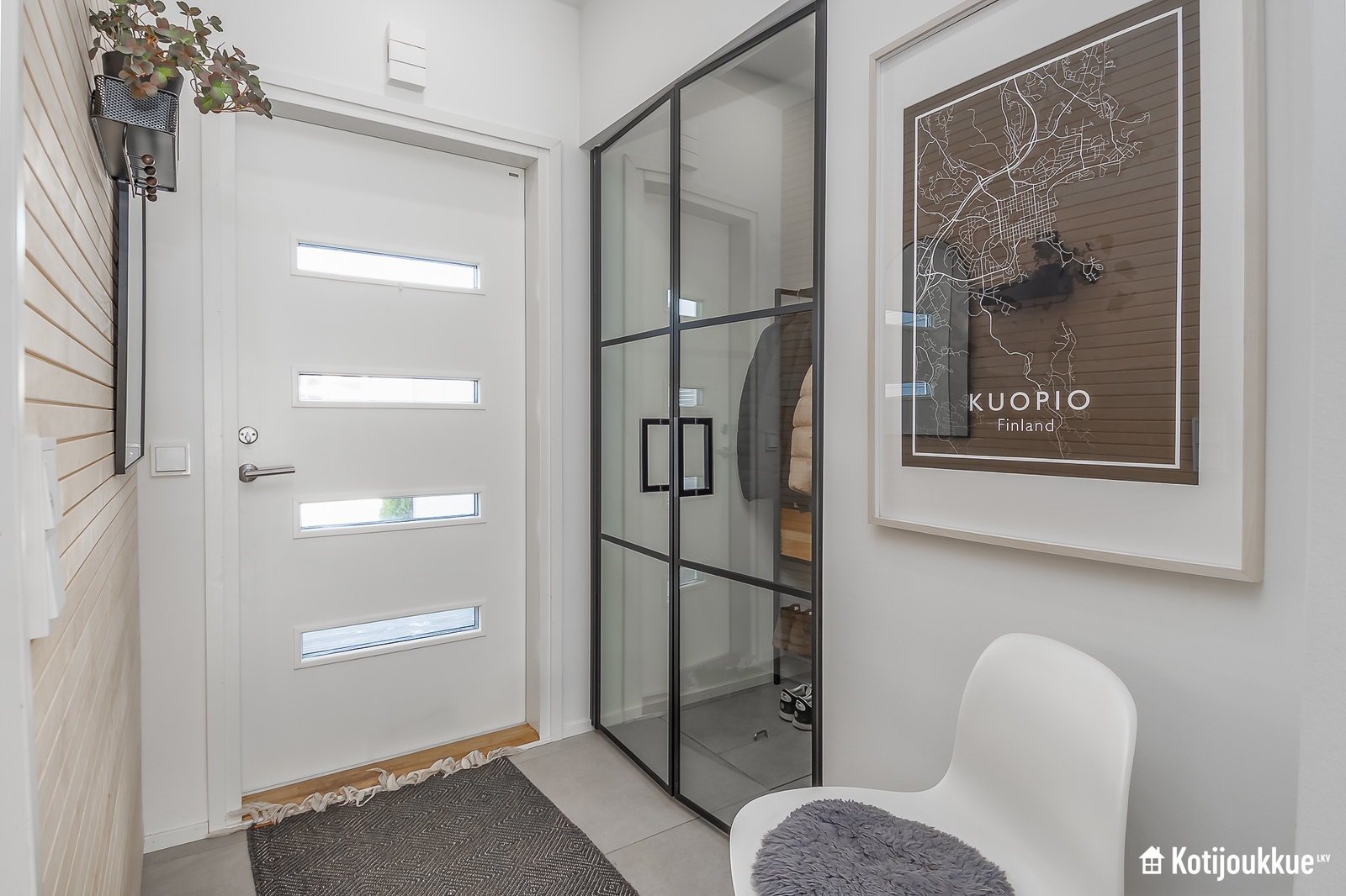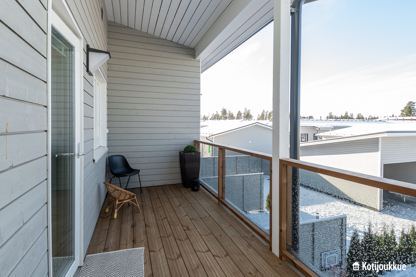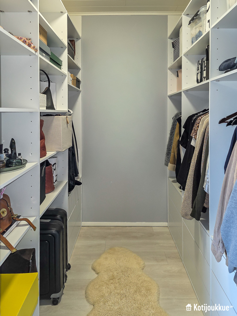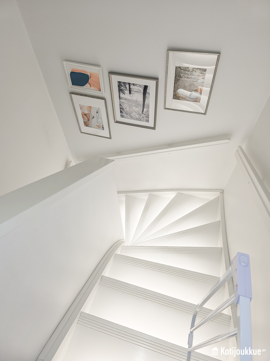 Ensimmäisessä kerroksessa keittiö yhdistyy valoisaan ja avaraan olohuoneeseen. Sauna, kylpyhuone ja kodinhoitohuone samassa tunnelmallisessa tilassa. Yläkerrassa erillinen kylpyhuone/wc, kolme makuuhuonetta joista yksi isolla vaatehuoneella ja omalla parvekkeella. Lisäksi paljon säilytystilaa lisäämässä asumismukavuutta.