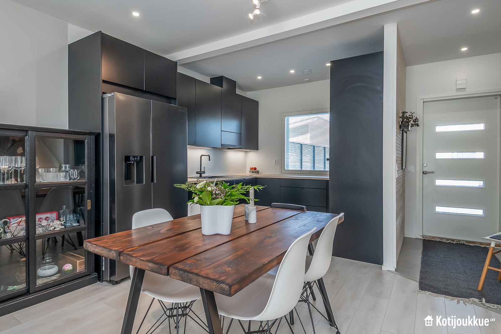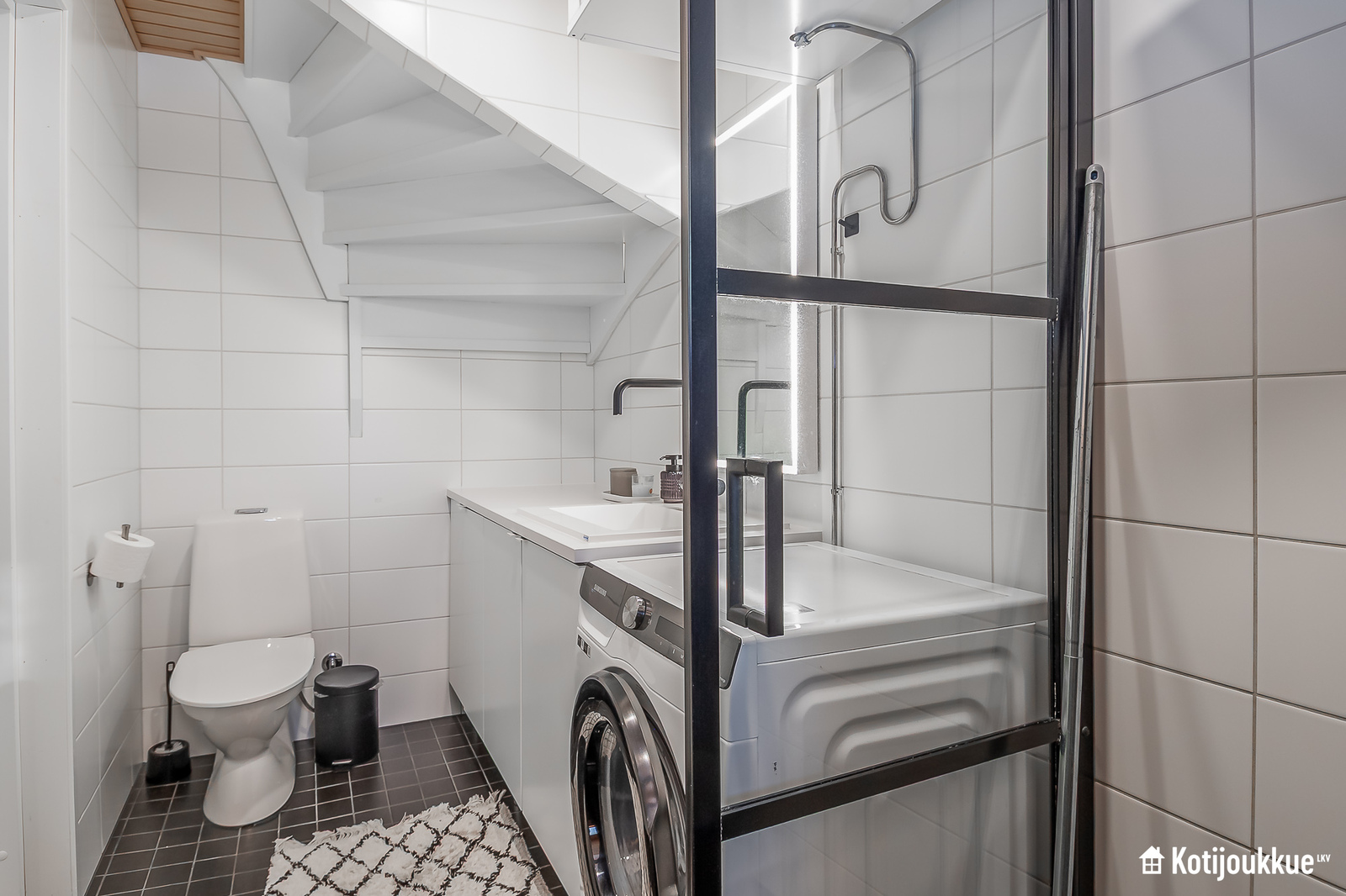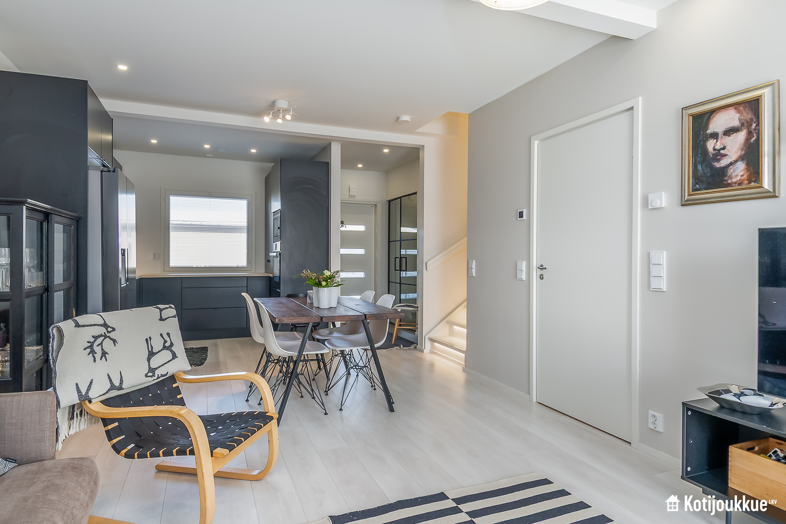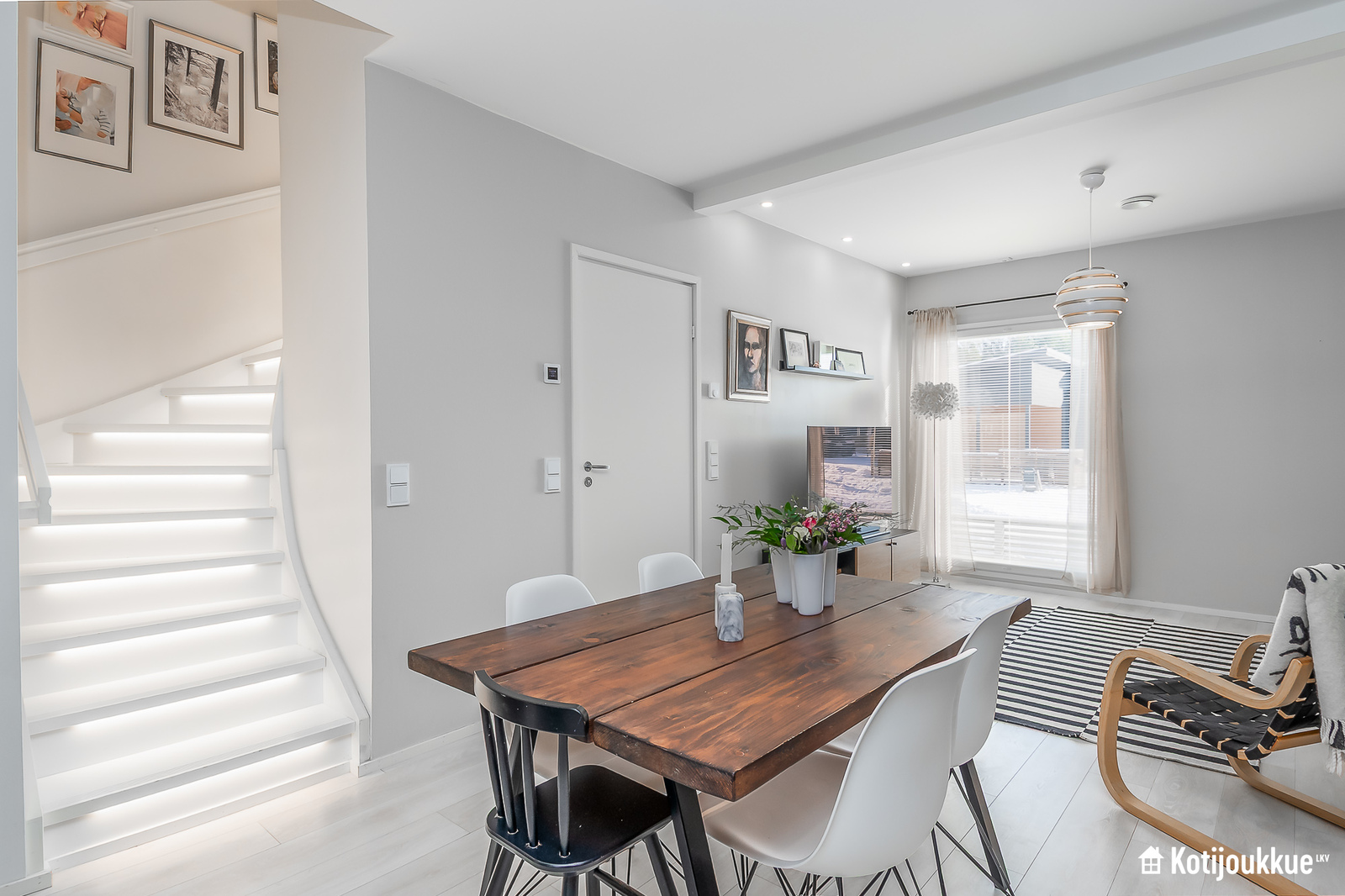 Ensimmäisessä kerroksessa keittiö yhdistyy valoisaan ja avaraan olohuoneeseen. Sauna, kylpyhuone ja kodinhoitohuone samassa tunnelmallisessa tilassa. Yläkerrassa erillinen kylpyhuone/wc, kolme makuuhuonetta joista yksi isolla vaatehuoneella ja omalla parvekkeella. Lisäksi paljon säilytystilaa lisäämässä asumismukavuutta.