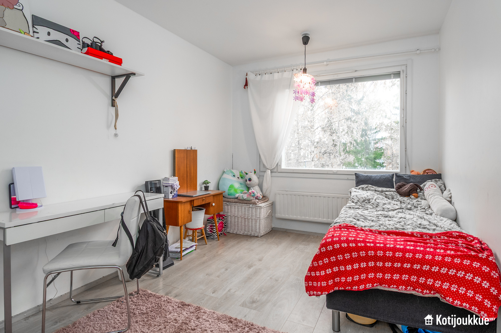 Asunnossa on kolme hyvänkokoista makuuhuonetta, ja toinen wc sijaitsee niiden läheisyydessä.