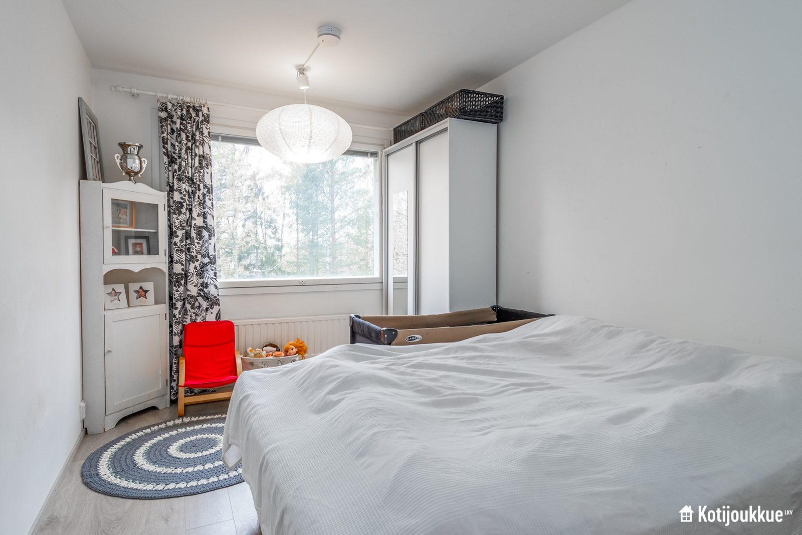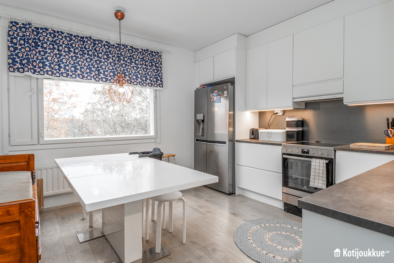 Valoisasta olohuoneesta on suoraan käynti lasitetulle parvekkeelle, josta avautuvat rauhalliset ja vehreät näkymät sisäpihan suuntaan. Keittiöön mahtuu ruokapöytä, ja siellä on runsaasti kaappi- sekä työskentelytilaa. Lisäksi huoneistossa on kolme makuuhuonetta, vaatehuone, kylpyhuone sekä erillinen wc ja tilava eteisaula.