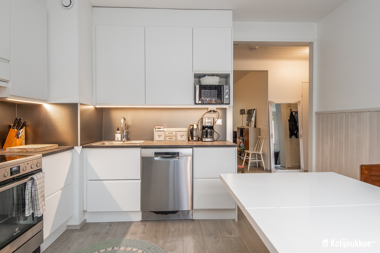 Kaunis vaalea laminaattilattia koko huoneistossa ja maalatut seinät. Koko huoneisto pintaremontoitu vuonna 2020.