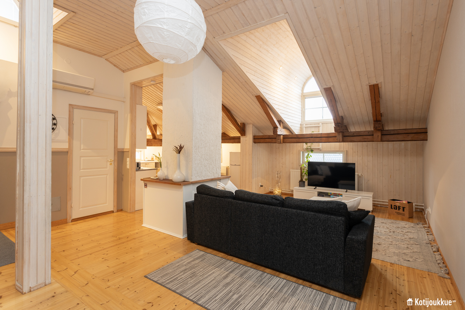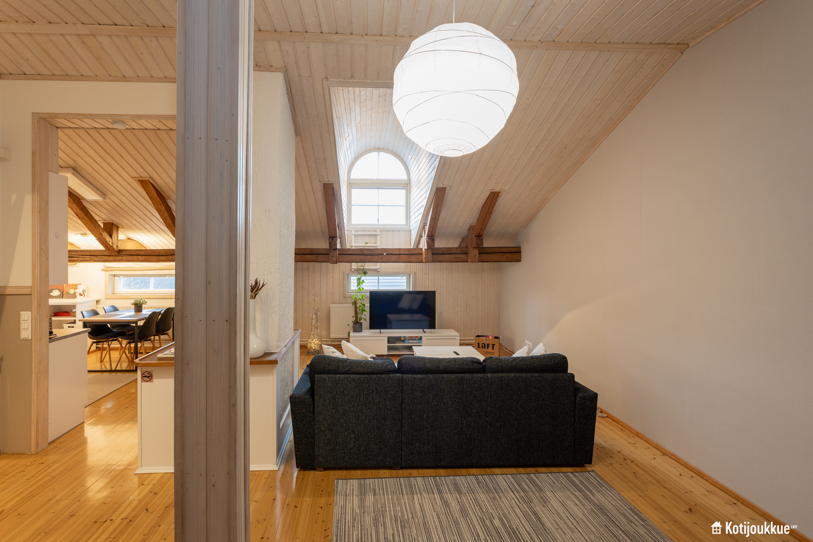 Huoneistossa monipolvinen korkeus 1,6 - n. 3,8 m. Kolmeen ilmansuuntaan avautuva. 2 kaari-ikkunaa.