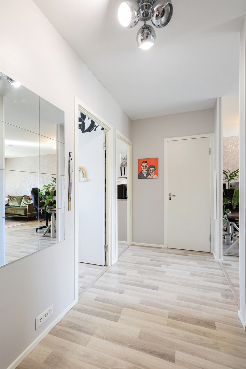 Bostaden har en tydlig och välplanerad planlösning där varje rum är rymligt och stora fönster i två väderstreck skapar en ljus och trivsam helhet. Det vackra ljusa golvet och de harmoniskt tapetserade väggarna tillför en känsla av vardagslyx.