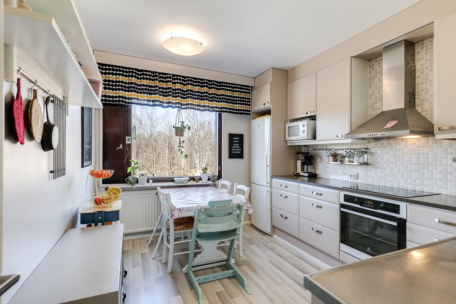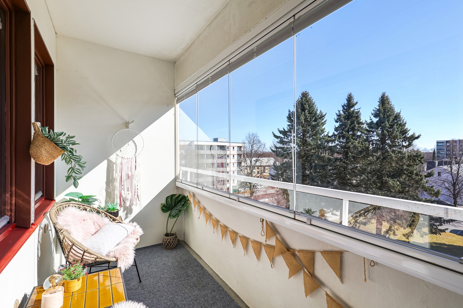 I det separata köket finns en naturlig plats för matbord vid fönstret med lugn utsikt mot innergården. Det stora vardagsrummet ger goda möjligheter till olika inredningslösningar, och den inglasade balkongen skapar extra utrymme för umgänge och avkoppling.