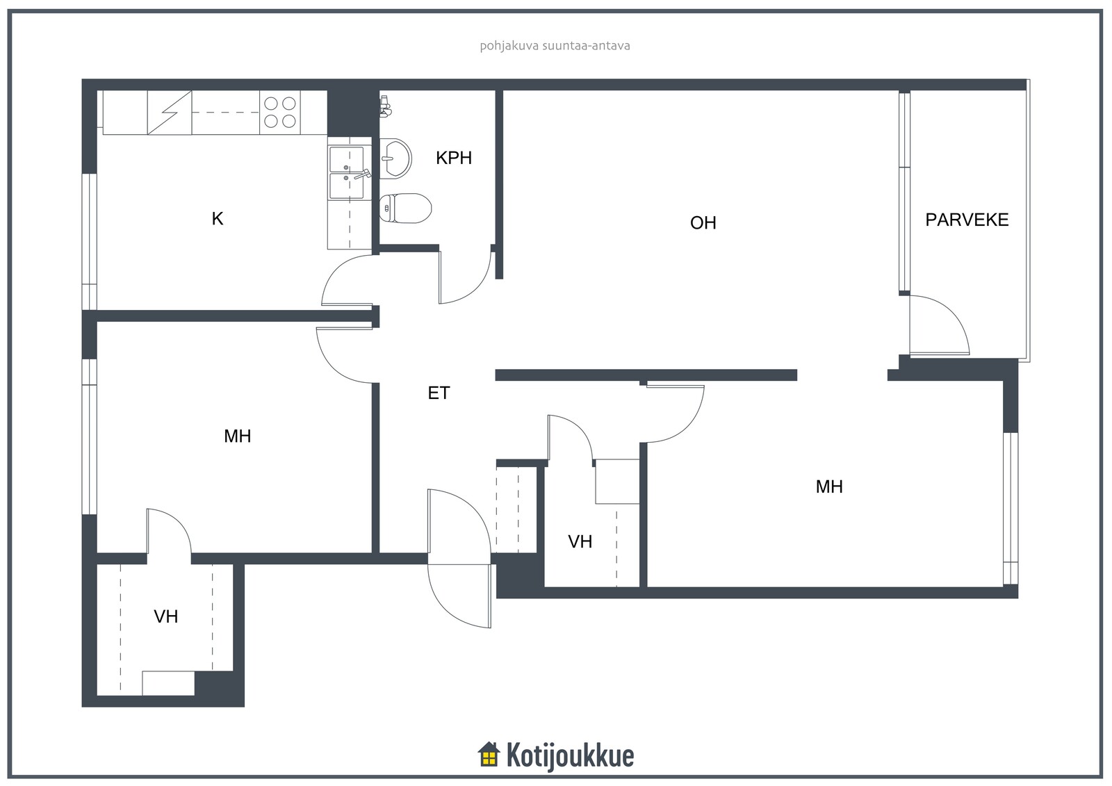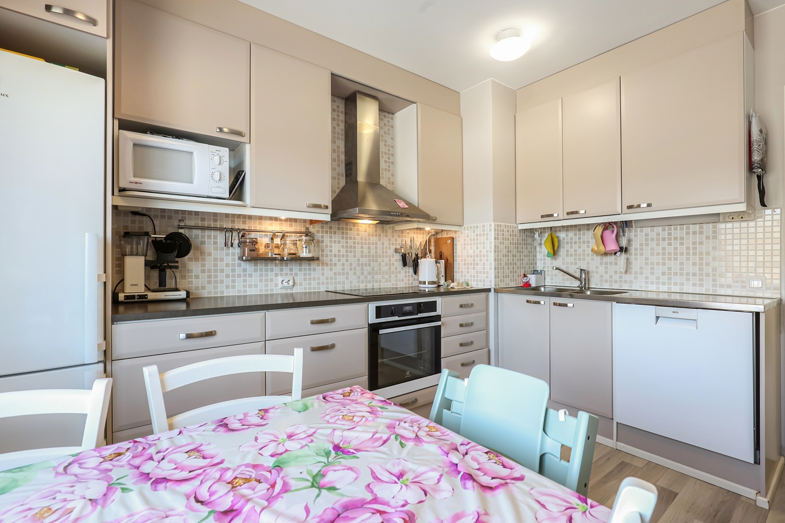 Erillisessä keittiössä on oma paikkansa ruokapöydälle ikkunan äärellä, josta avautuu rauhalliset näkymät sisäpihan suuntaan. Suuri olohuone mahdollistaa erilaiset sisustusratkaisut ja kivaa lisätilaa oleskeluun luo lasitettu parveke.