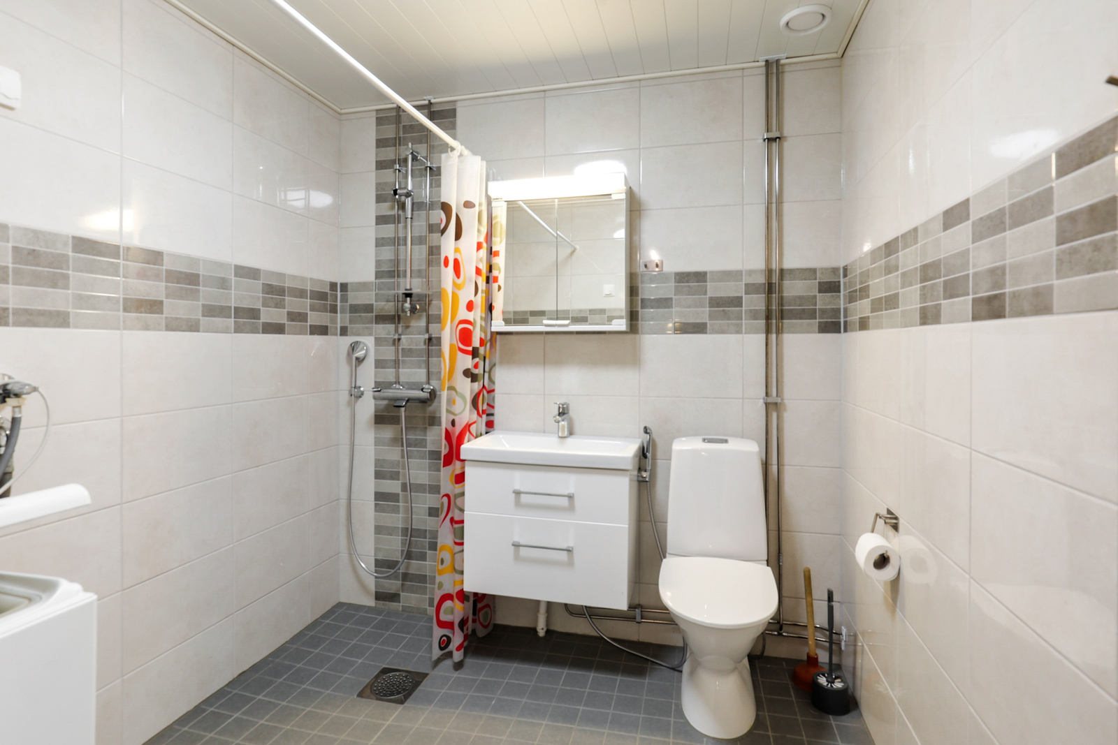 - pesukoneliitäntä, wc-istuin, suihku, peilikaappi, kylpyhuonekaapisto