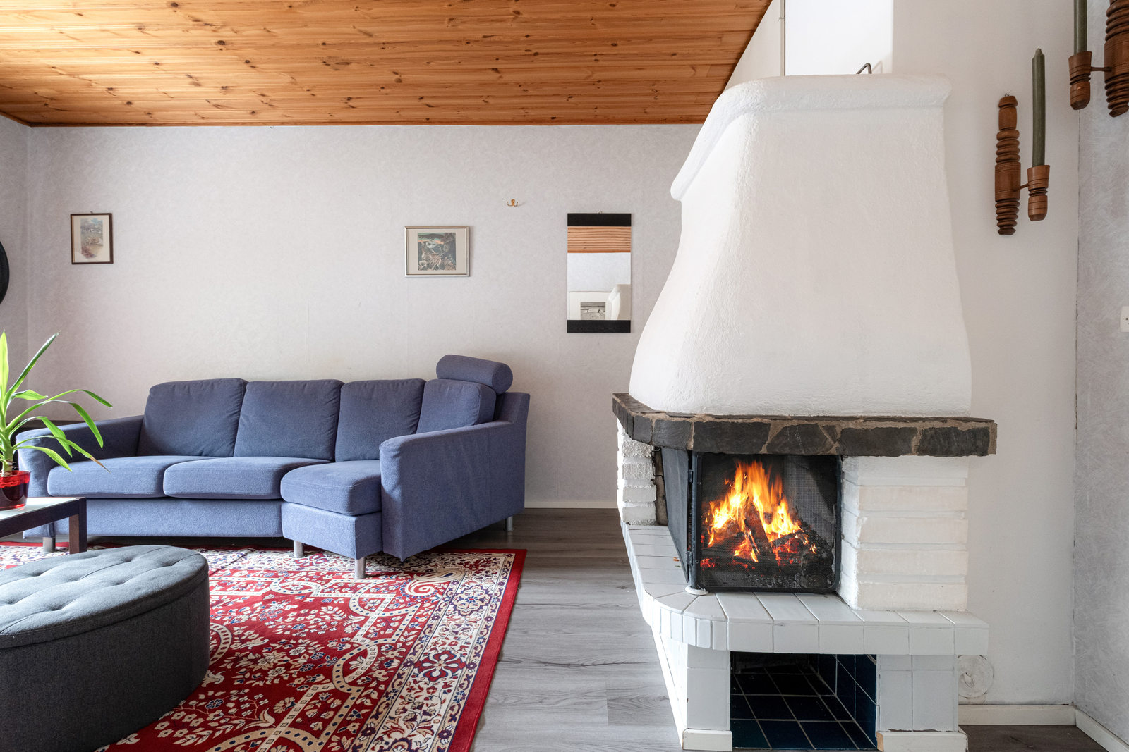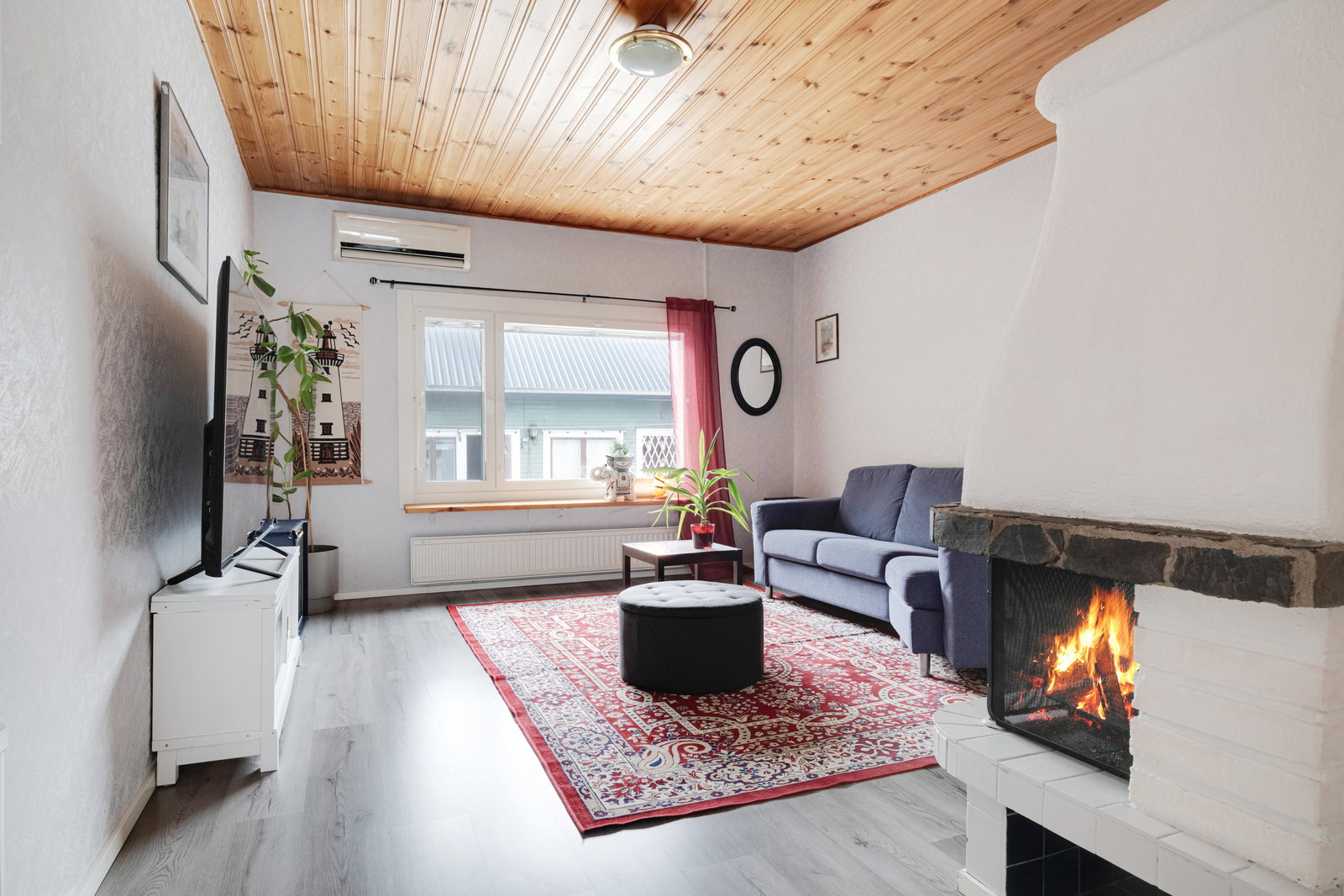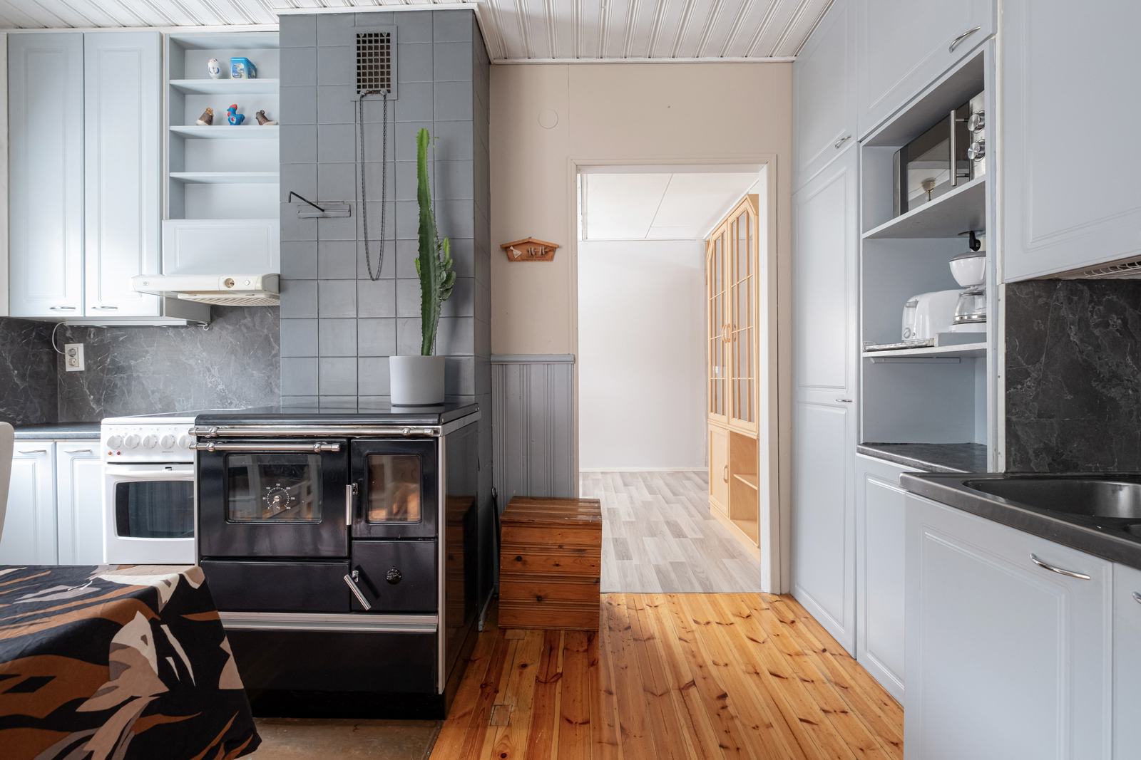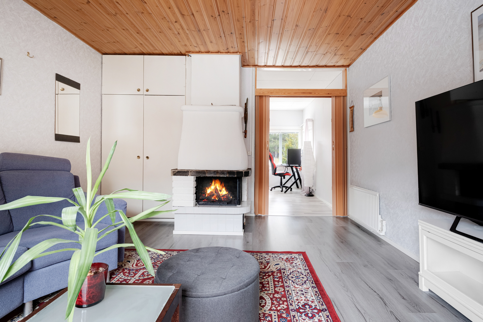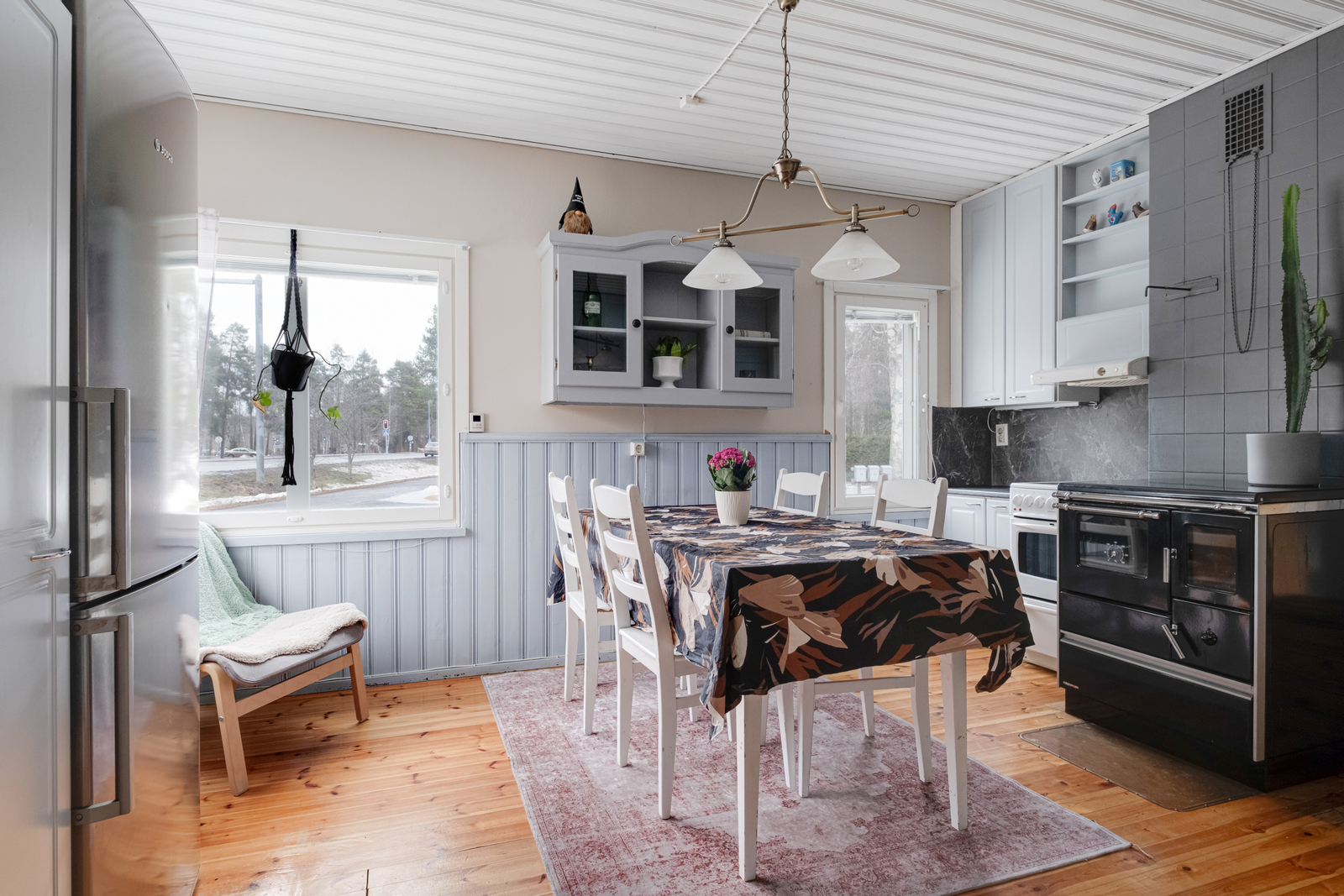 Kodin keittiö hurmaa käytännöllisyydellään. Kaappitilaa on runsaasti, ja arkea helpottaa erillinen aamupalakaappi sekä tunnelmaa tuova puuhella. Tilava olohuone toimii kodin keskipisteenä, jossa takka ja ilmalämpöpumppu tuovat sekä mukavuutta että energiatehokkuutta ympäri vuoden.