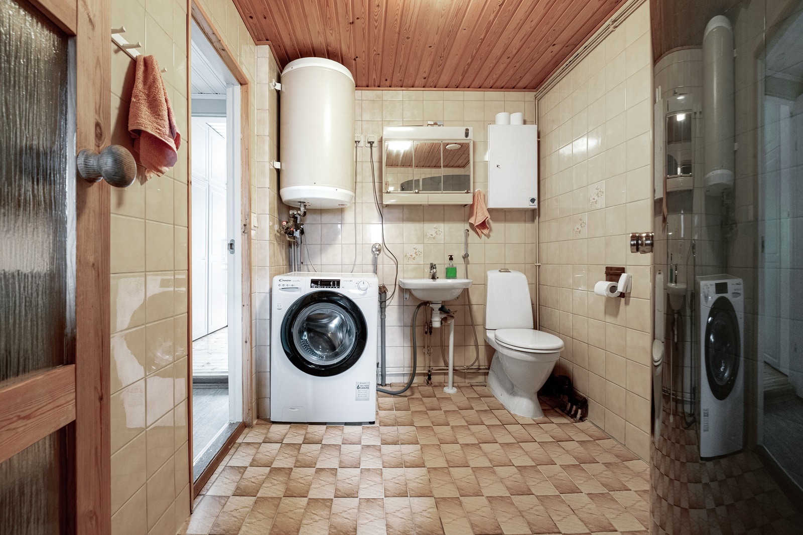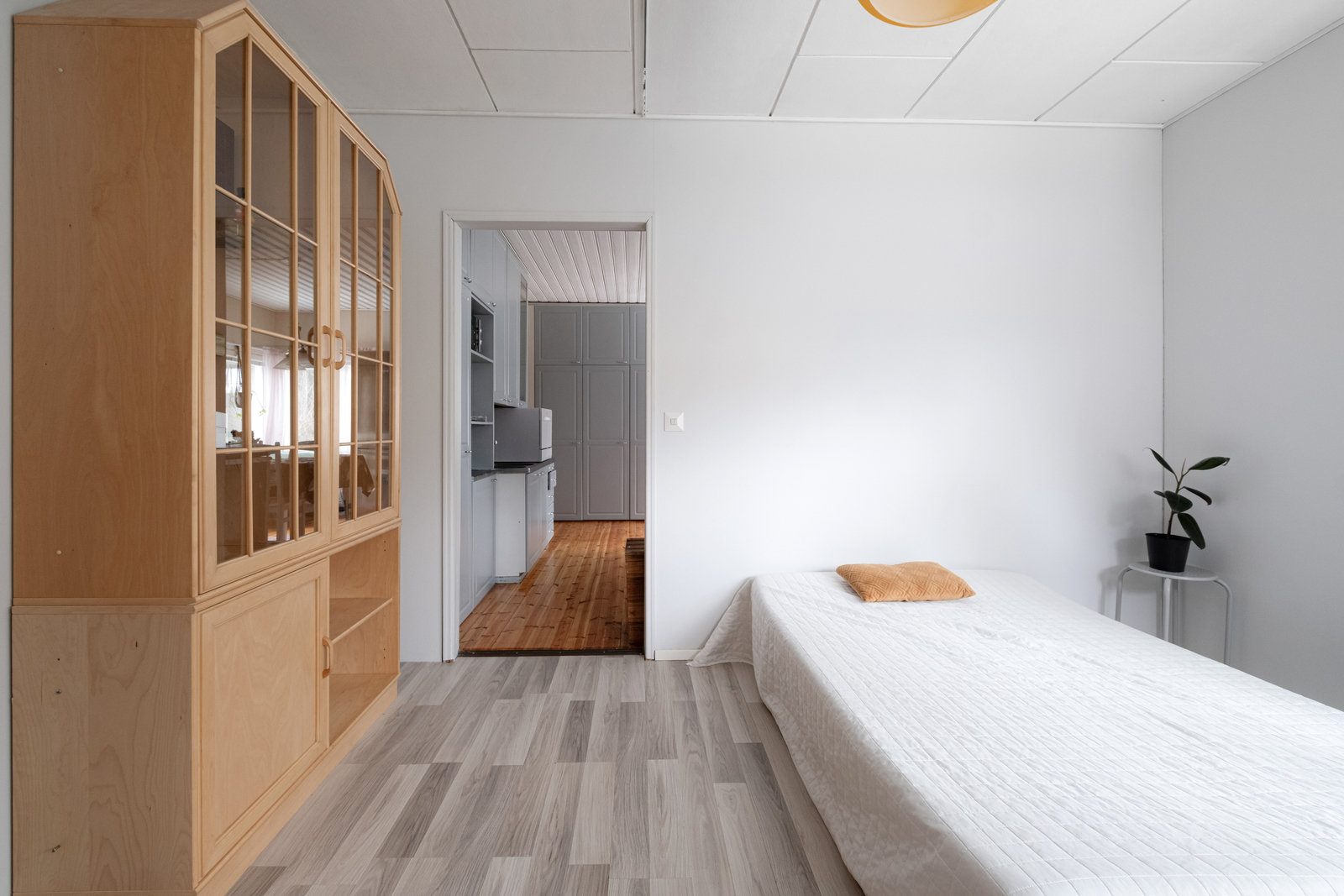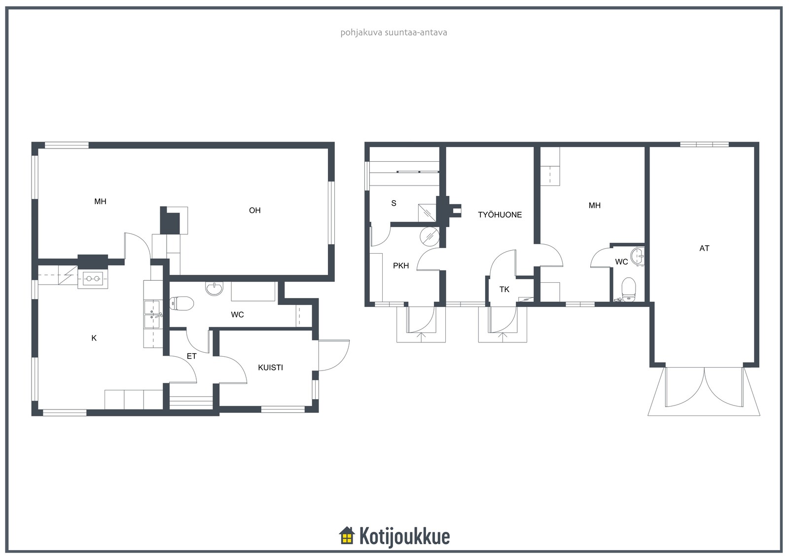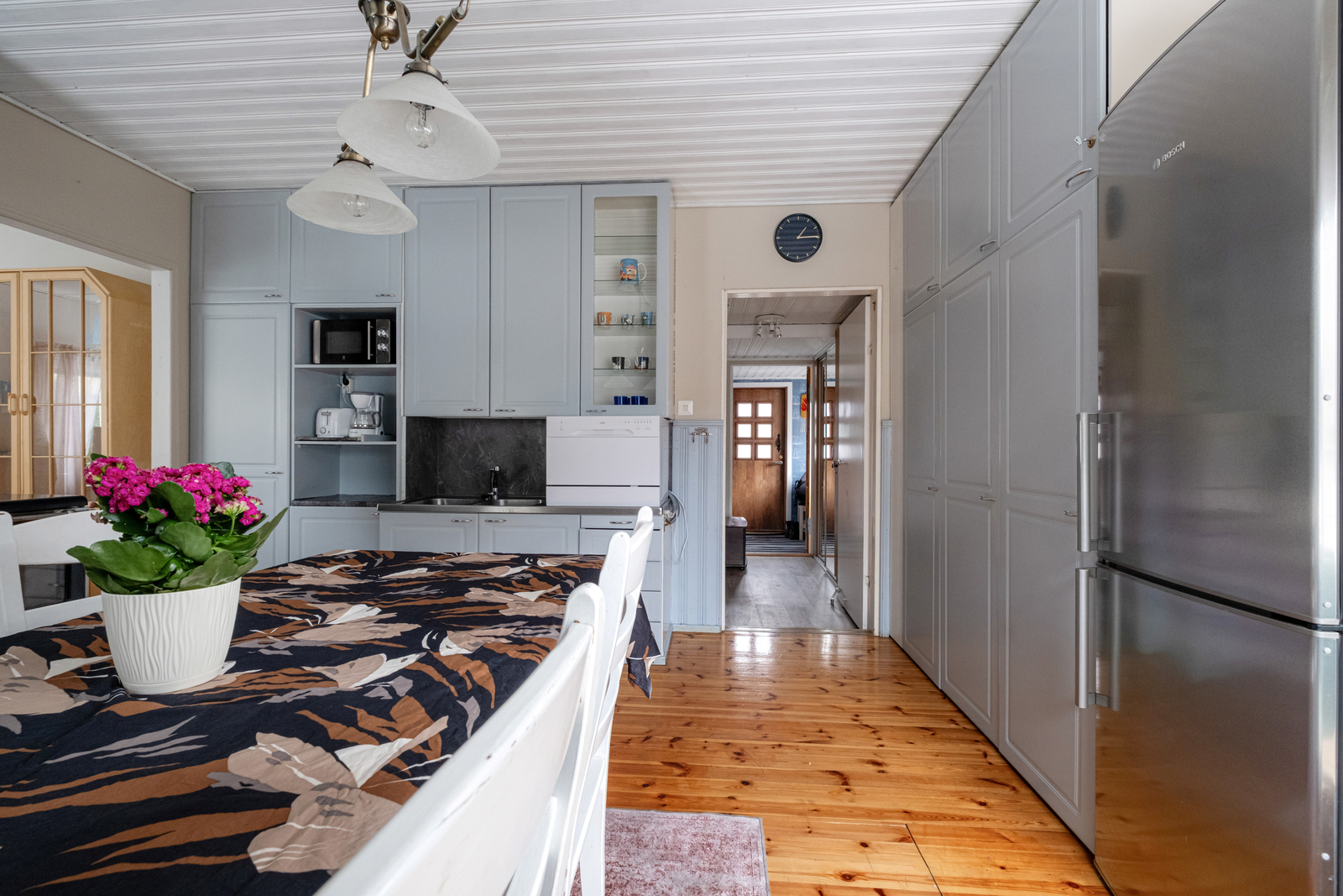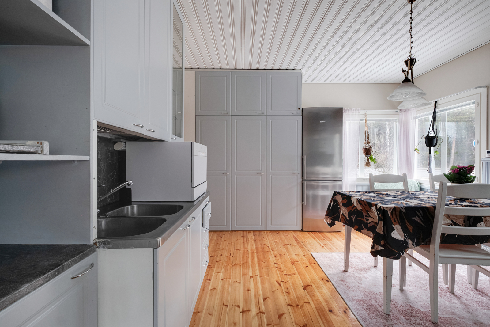 Kodin keittiö hurmaa käytännöllisyydellään. Kaappitilaa on runsaasti, ja arkea helpottaa erillinen aamupalakaappi sekä tunnelmaa tuova puuhella. Tilava olohuone toimii kodin keskipisteenä, jossa takka ja ilmalämpöpumppu tuovat sekä mukavuutta että energiatehokkuutta ympäri vuoden.