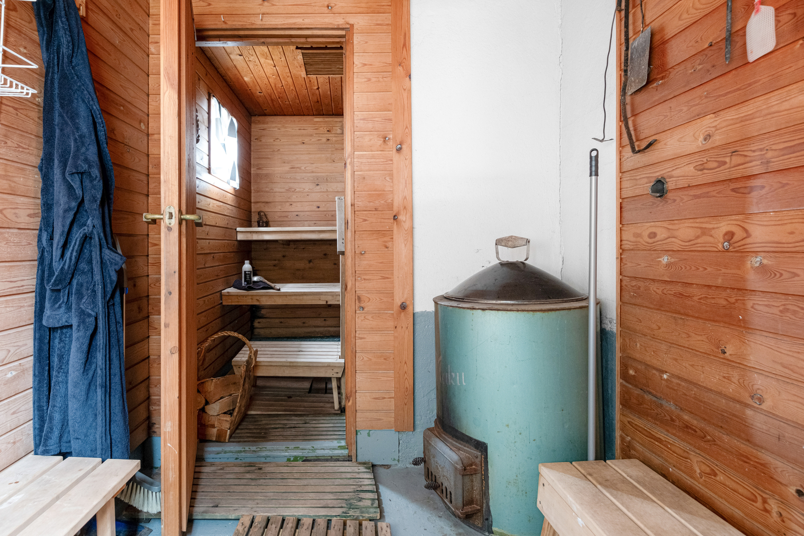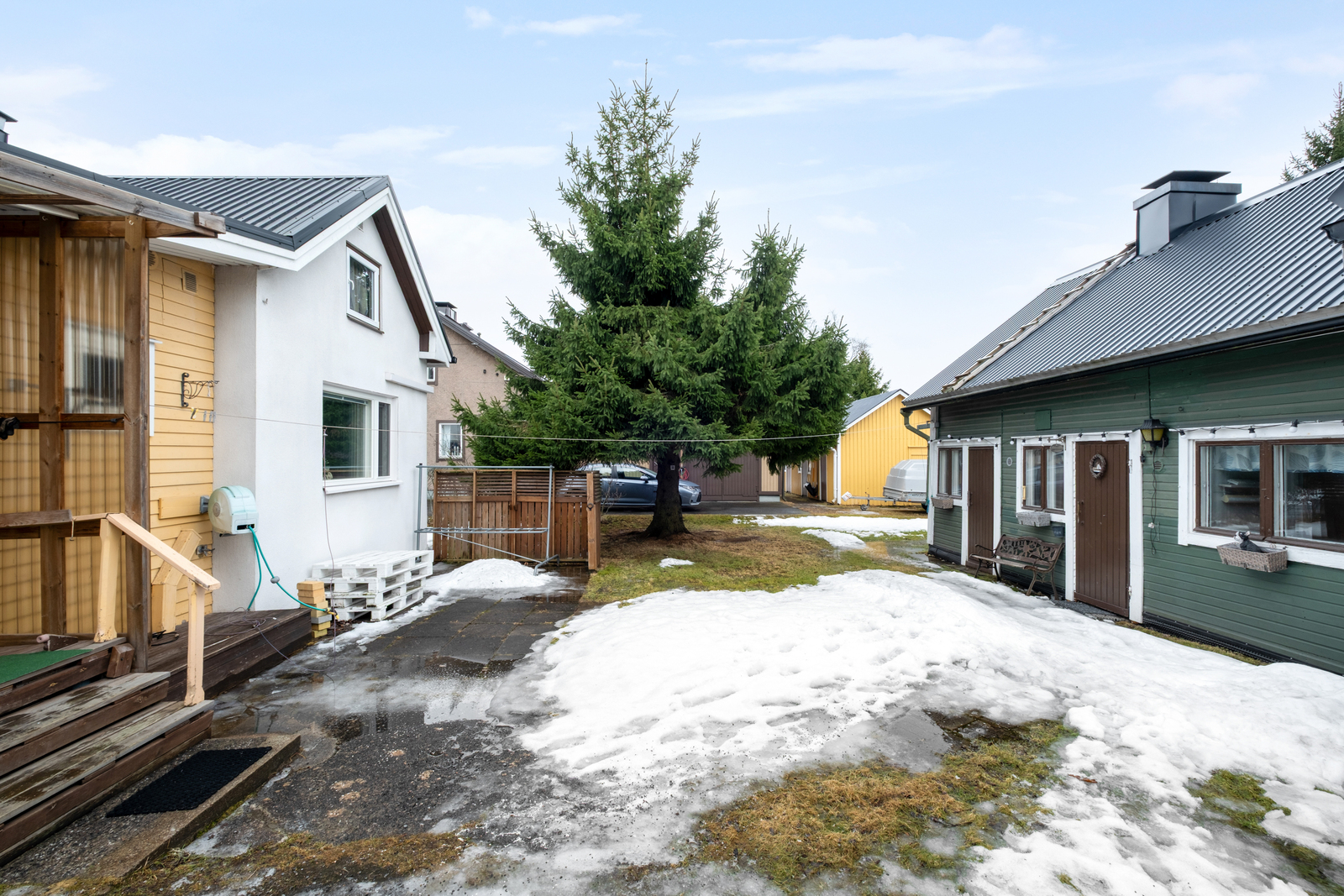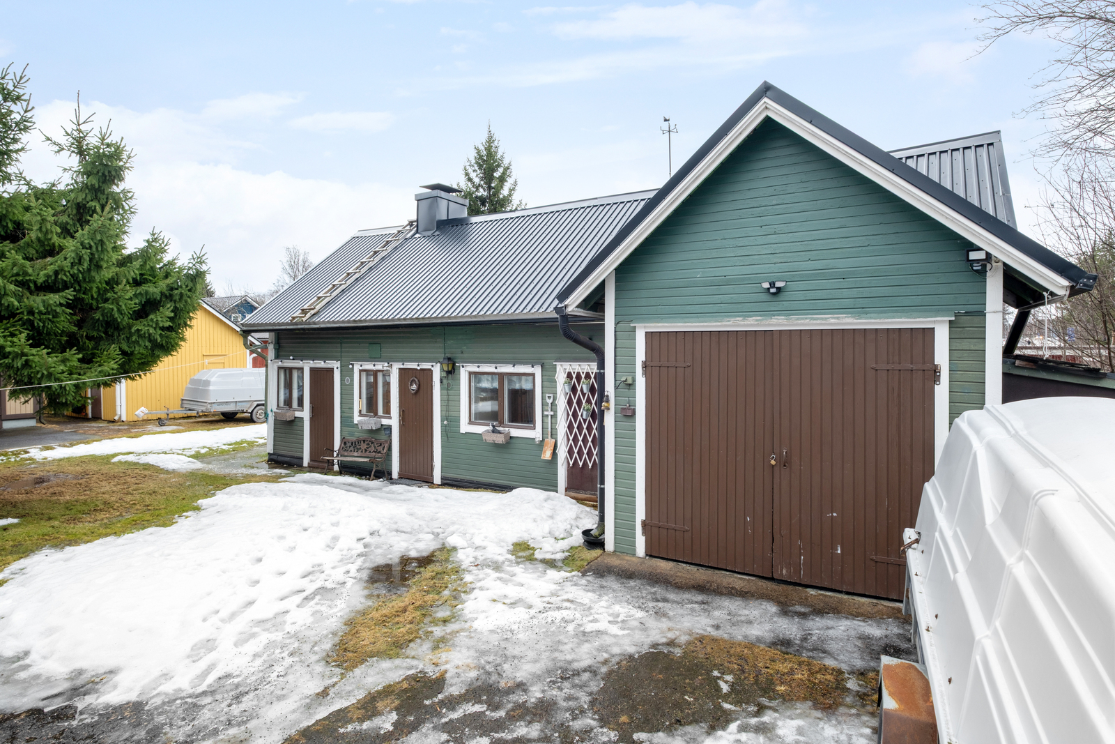 Den lättskötta gårdsplanen erbjuder en trivsam miljö för utevistelse. Gårdsbyggnaden ger mervärde med sina mångsidiga utrymmen. Där finns ett eget sovrum, allrum, wc samt en traditionell vedeldad bastu. På gården finns gott om plats för bilar, och dessutom finns ett garage.