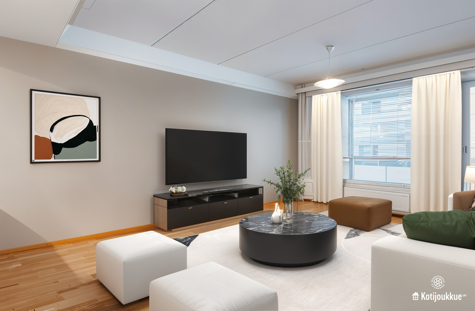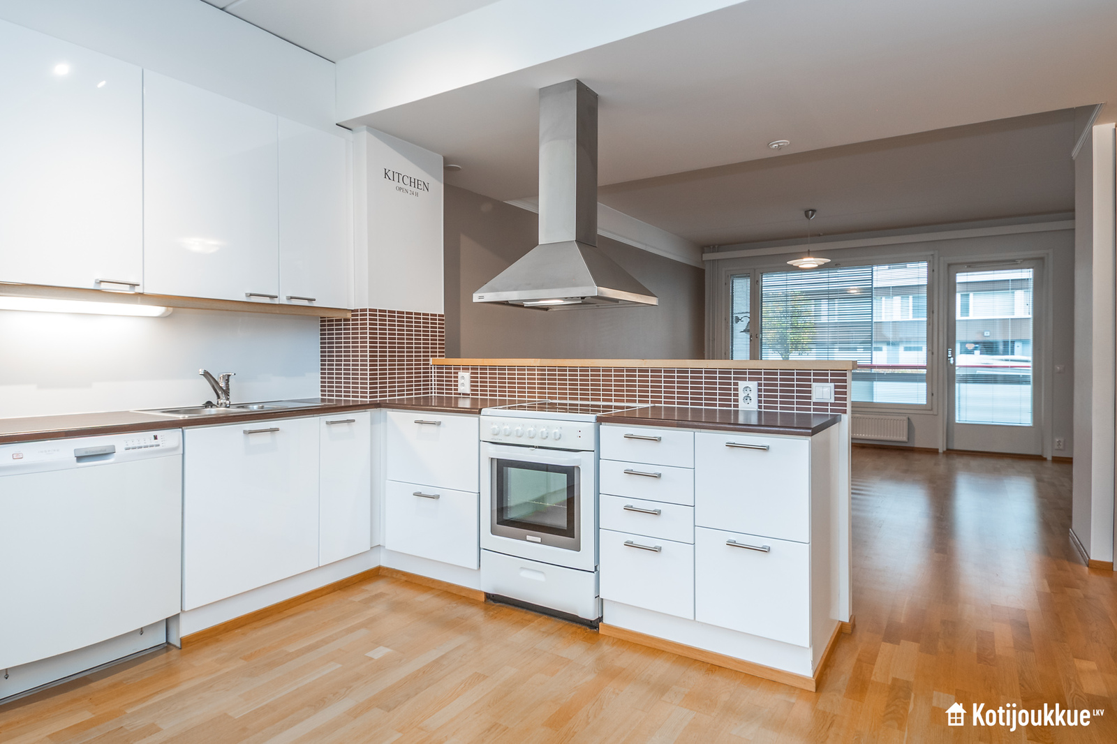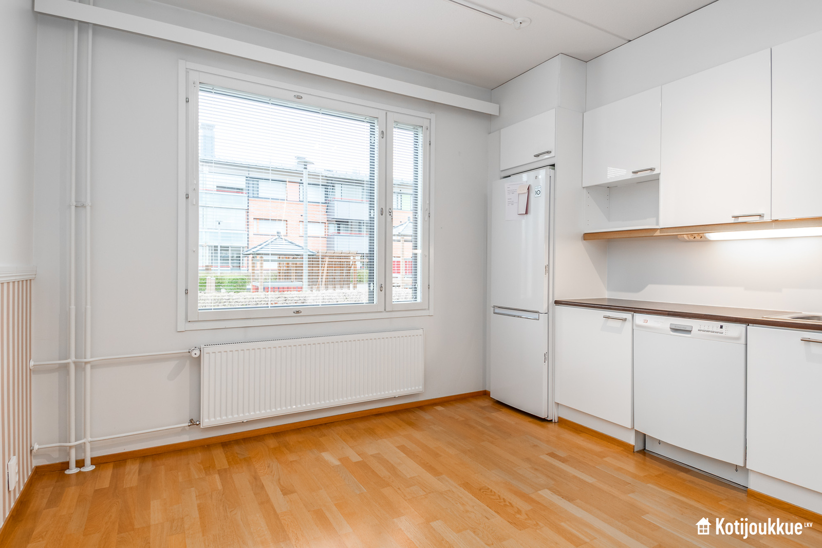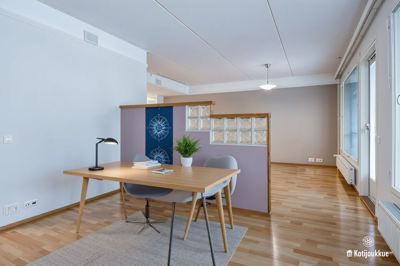 Kodin tyylikäs, vaalea ja harmoninen värimaailma sekä laadukkaat kalusteet luovat hienot puitteet asumiselle. Keittiö ja olohuone muodostavat kauniin, yhtenäisen tilan, jossa paikkansa löytää niin ruokapöytä kuin sohvaryhmäkin. Olohuoneen yhteydessä on pienellä väliseinällä jaettu tila, joka toimii erinomaisesti, vaikka työhuoneena.