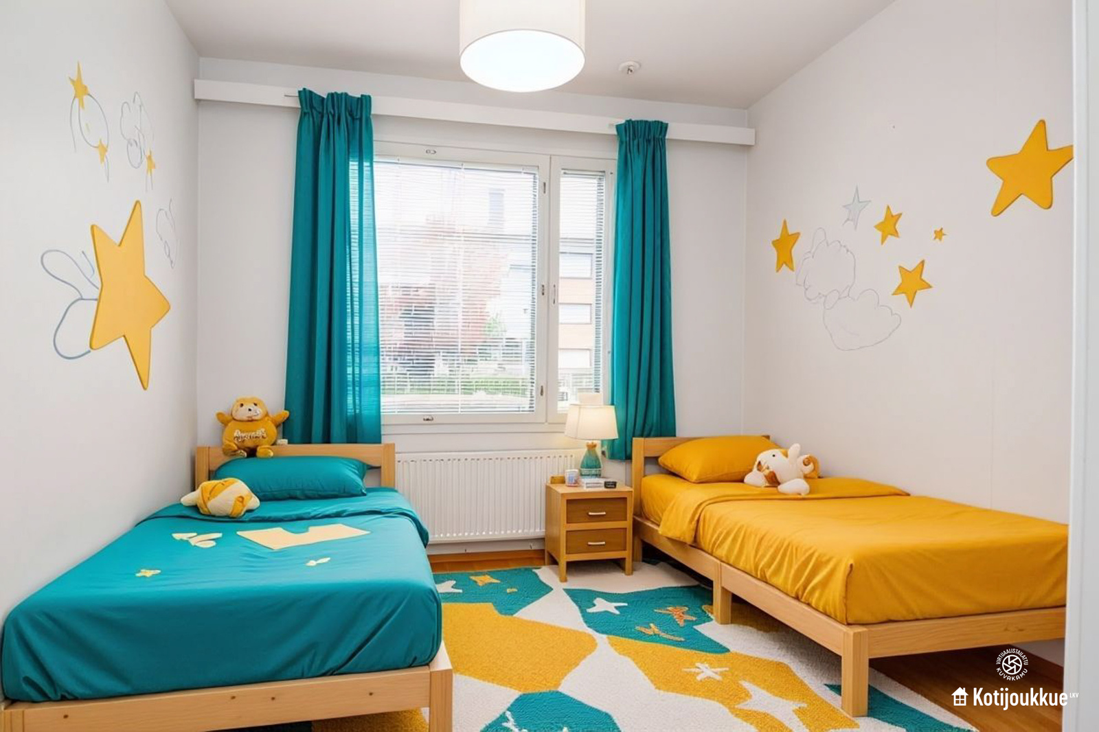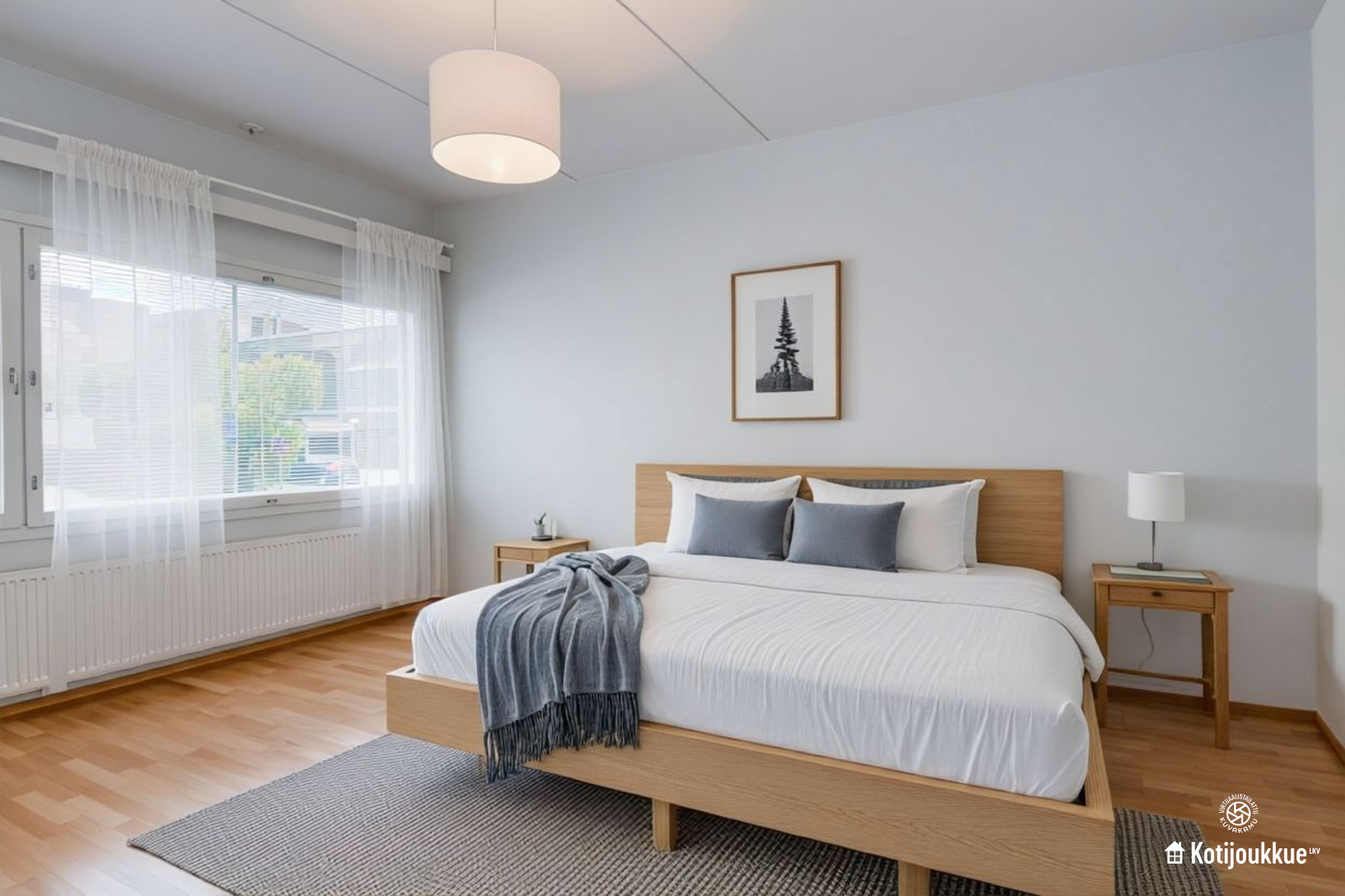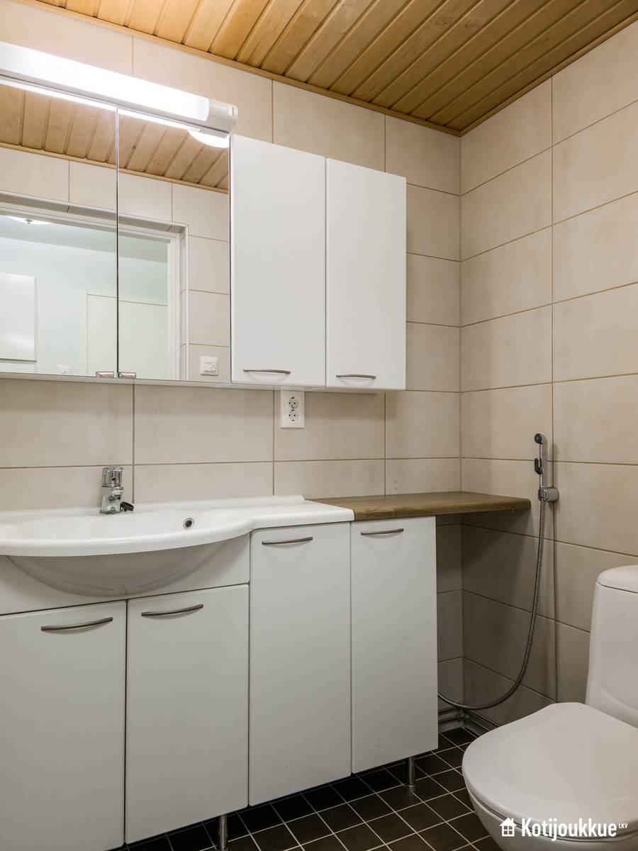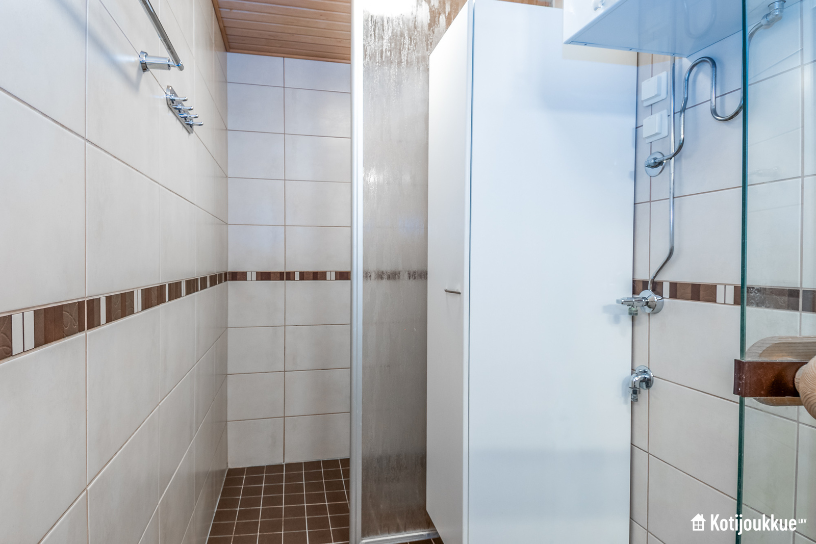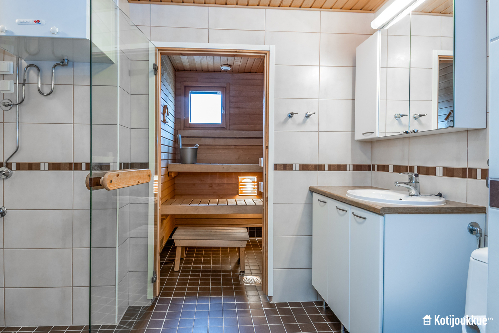 Lisäksi kodista löytyy kaksi hyvänkokoista makuuhuonetta, oma sauna ja toimiva kylpyhuone, joka mahduttaa sisäänsä myös kodinhoitotilat. Erillinen toinen wc tuo sujuvuutta arjen toimintaa.