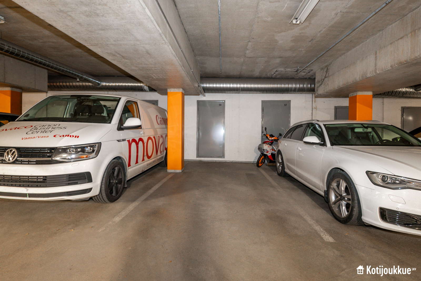 Till bostaden hör även en bilplats i varmgarage (separata aktier, 29 000 €), som dessutom inkluderar ett eget uppvärmt förråd!