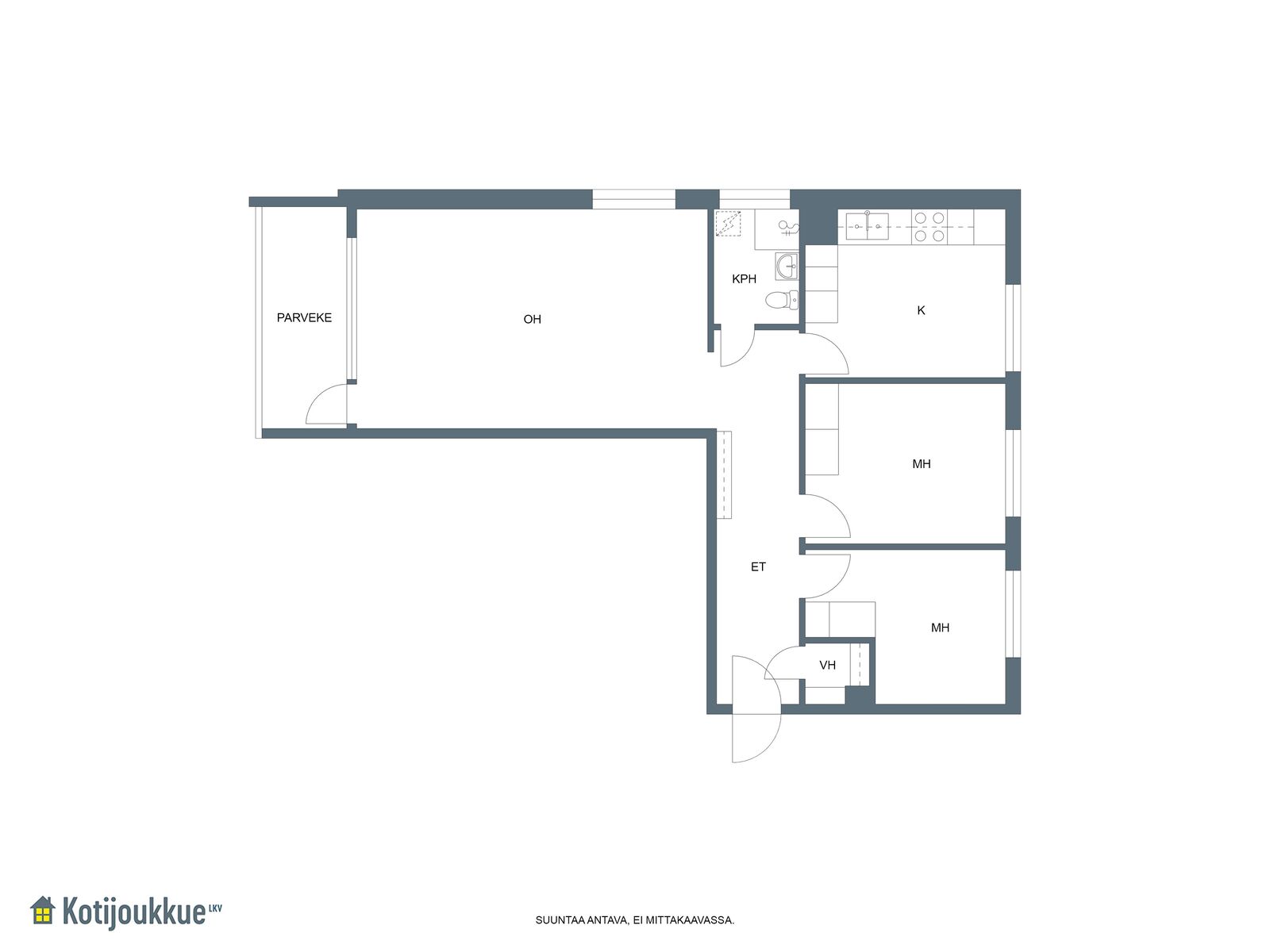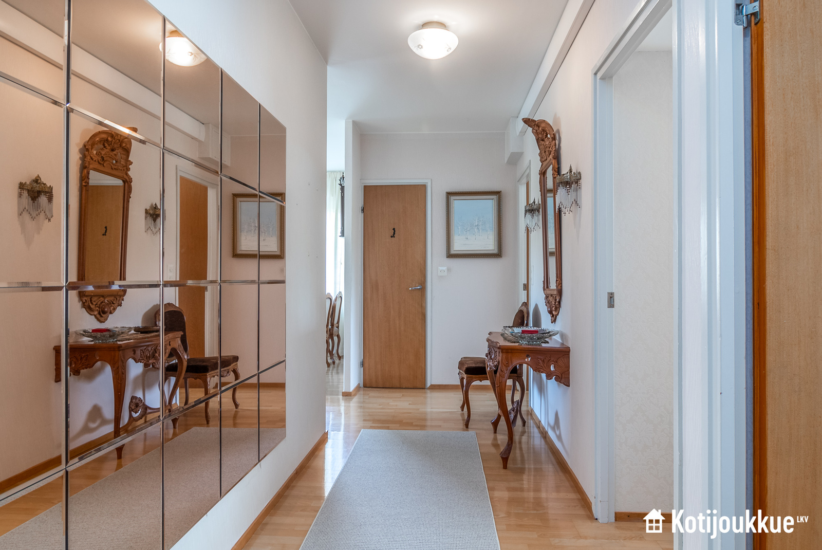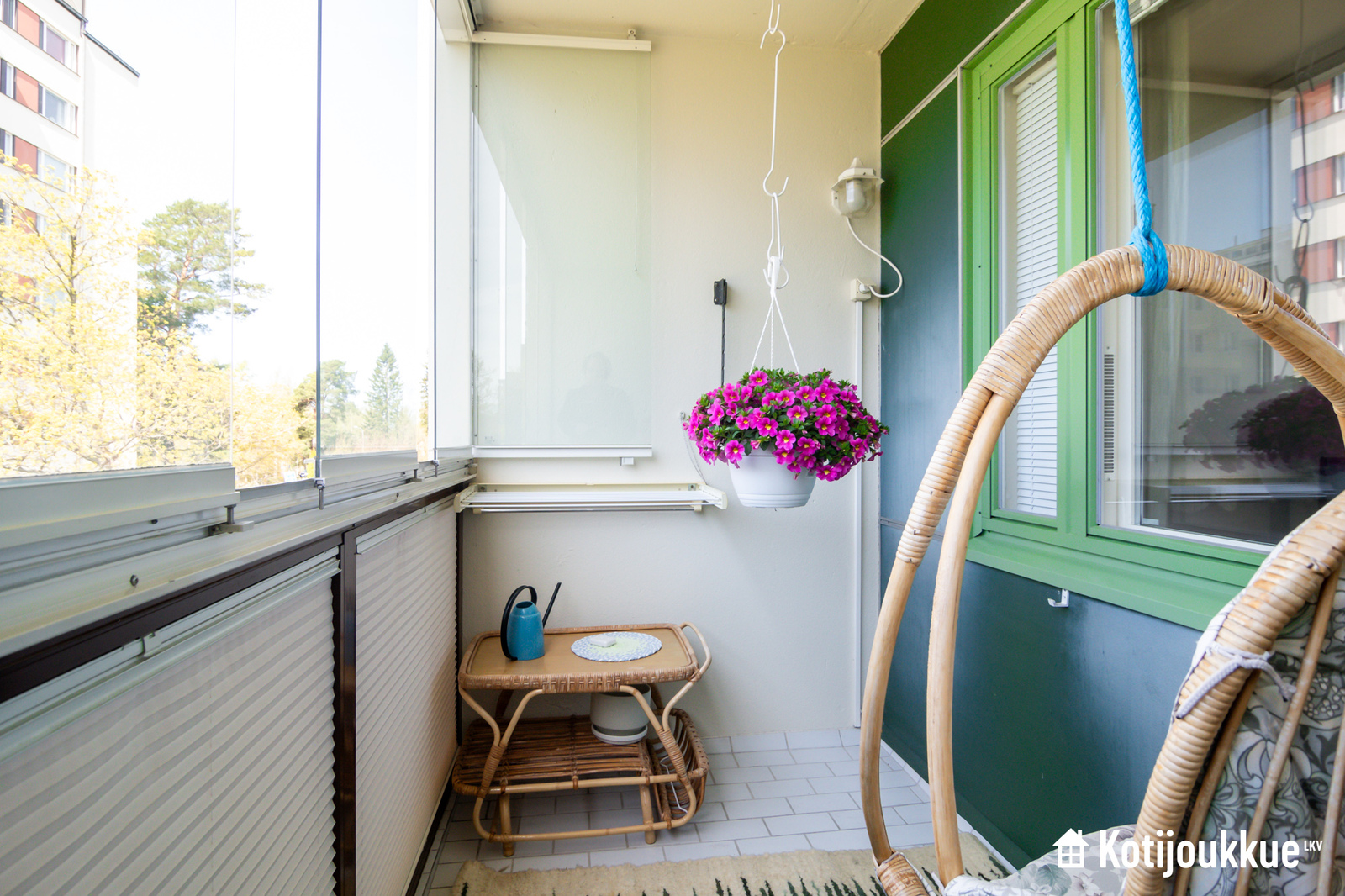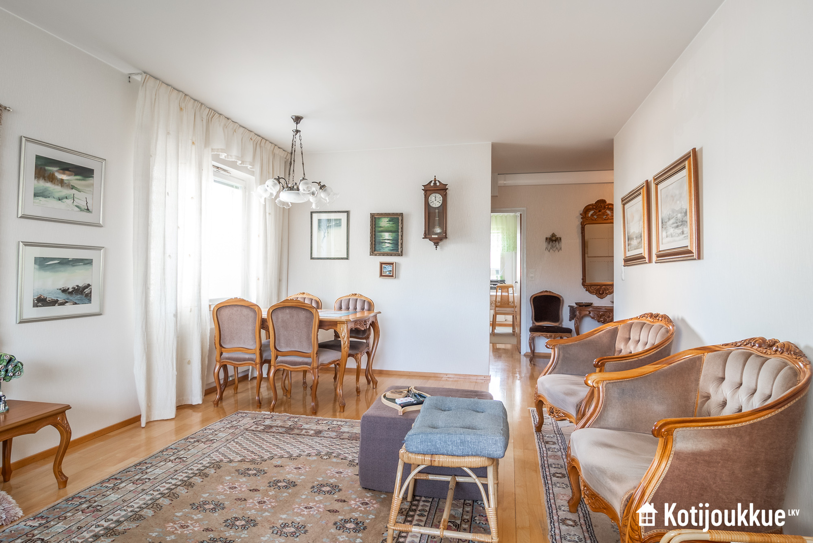 Keittiössä lasku- ja kaappitilaa löytyy mukavasti ja keittiön yhteyteen mahtuu hyvin myös ruokapöytä. Suuri ja valoisa olohuone, jossa on ihana viettää aikaa niin perheen kuin ystävienkin kanssa. Olohuone jatkuu näyttävästi parvekkeelle, joka on kesäaikaan kuin ylimääräinen huone. Myös makuuhuoneet ovat hyvänkokoisia ja helposti kalustettavissa perheen elämäntilanteen mukaan.