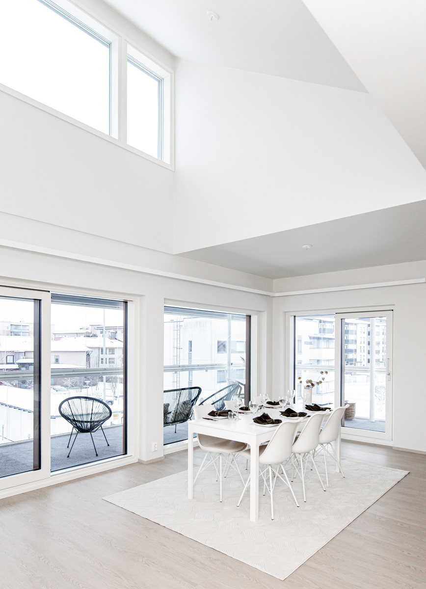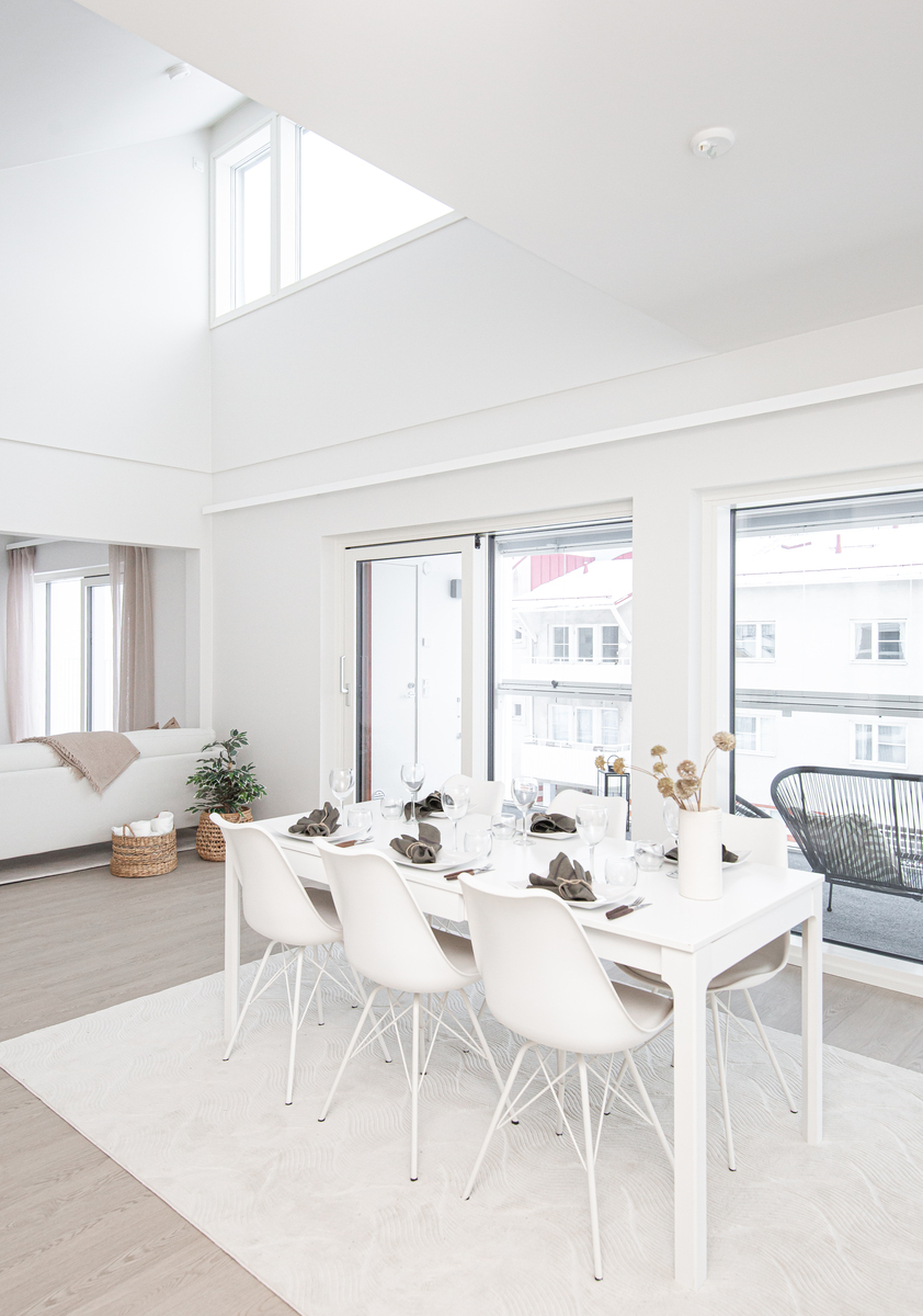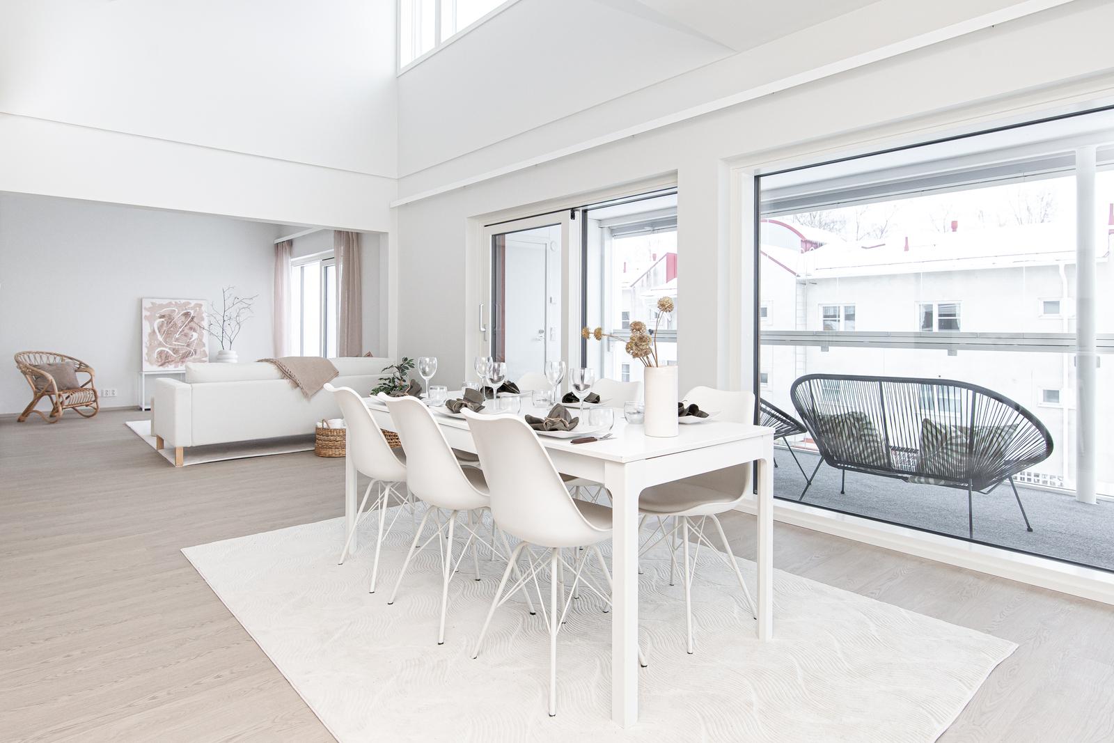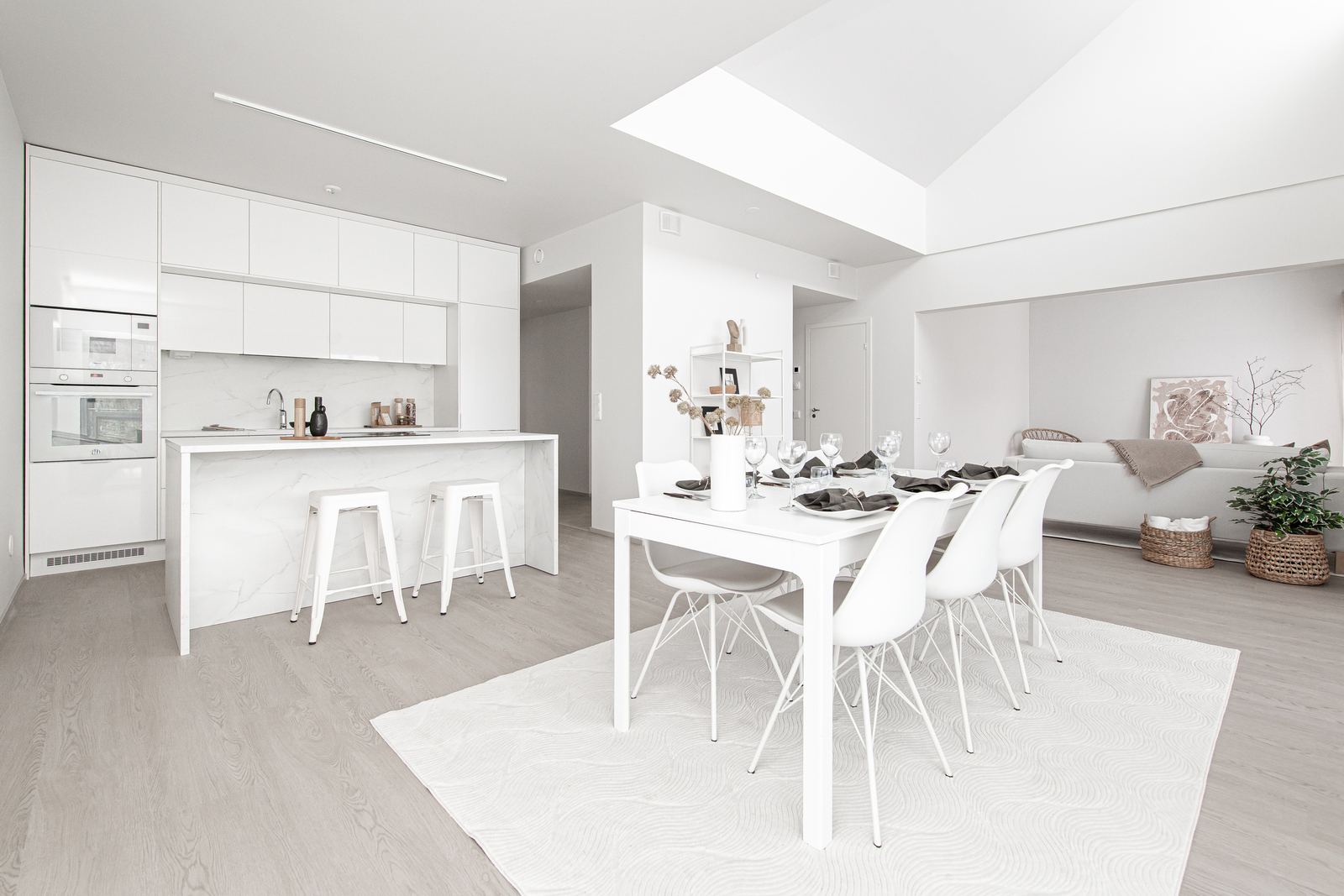 Huoneiston avara oleskelutila hurmaa valoisuudellaan ja selkeällä pohjaratkaisullaan. Suuret ikkunapinnat tuovat runsaasti luonnonvaloa ja korostavat tilan ilmavuutta. Arkkitehtoniset yksityiskohdat ja laadukkaat materiaalivalinnat tekevät kokonaisuudesta tyylikkään ja ajattoman.