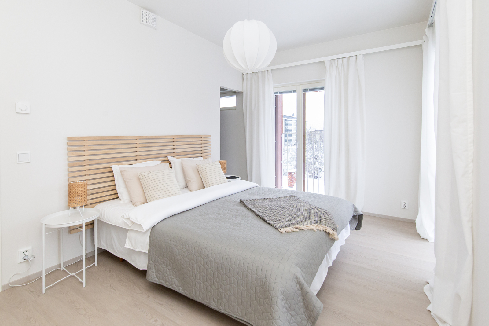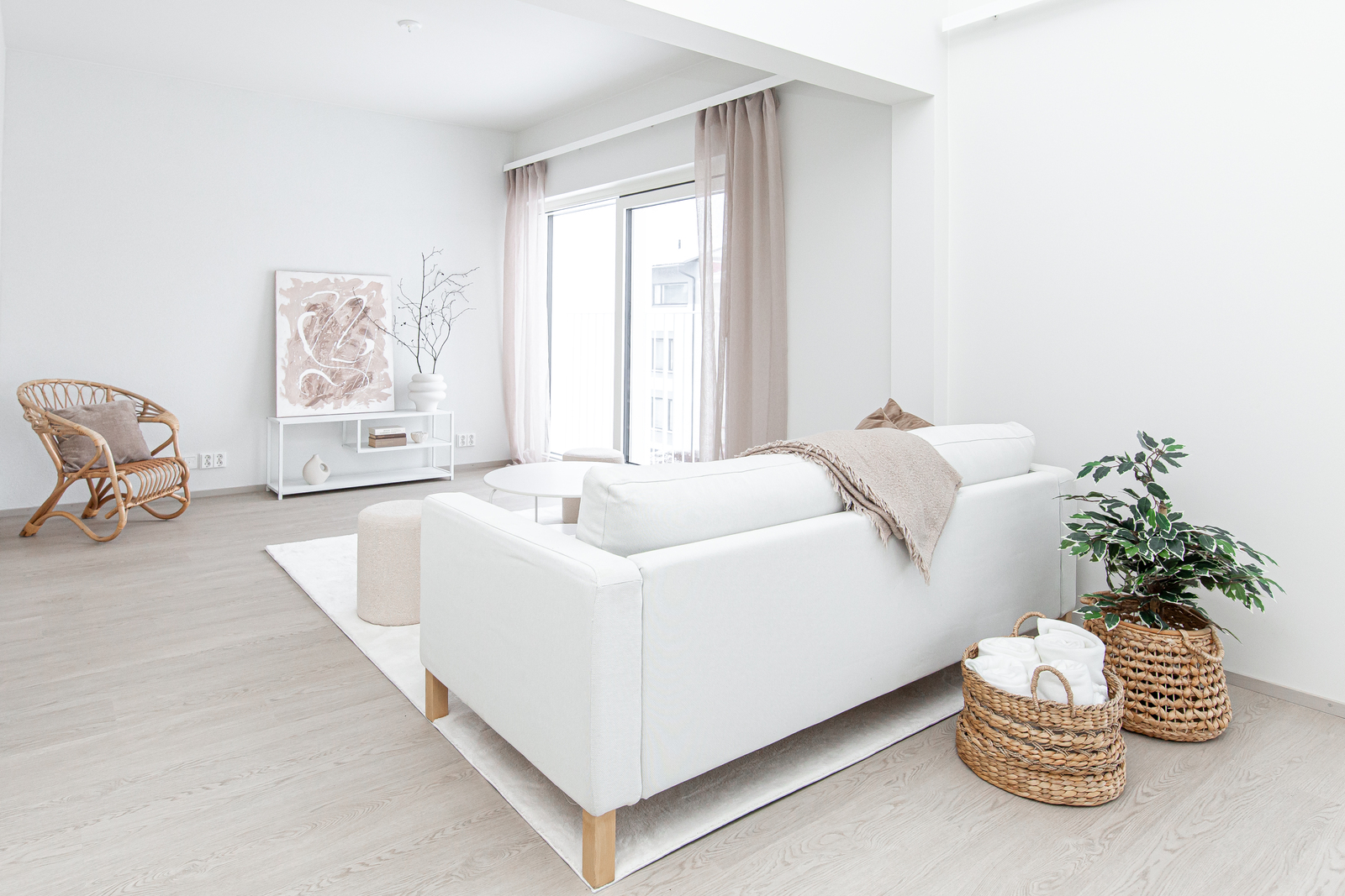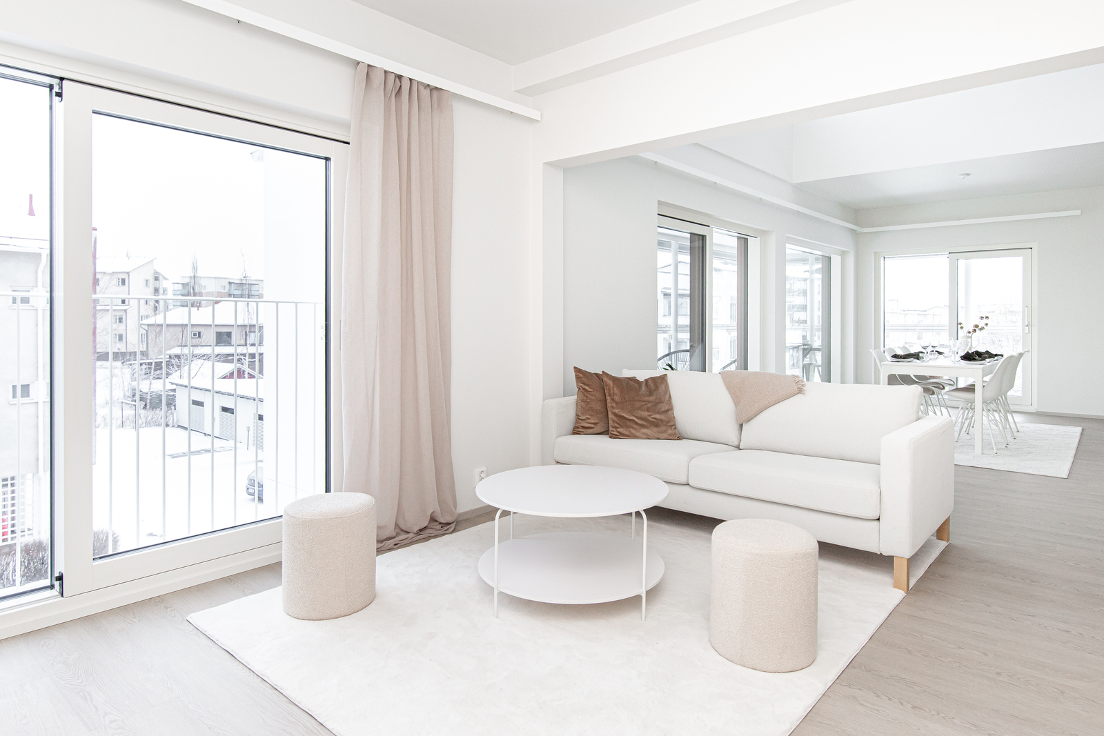 Huoneiston avara oleskelutila hurmaa valoisuudellaan ja selkeällä pohjaratkaisullaan. Suuret ikkunapinnat tuovat runsaasti luonnonvaloa ja korostavat tilan ilmavuutta. Arkkitehtoniset yksityiskohdat ja laadukkaat materiaalivalinnat tekevät kokonaisuudesta tyylikkään ja ajattoman.