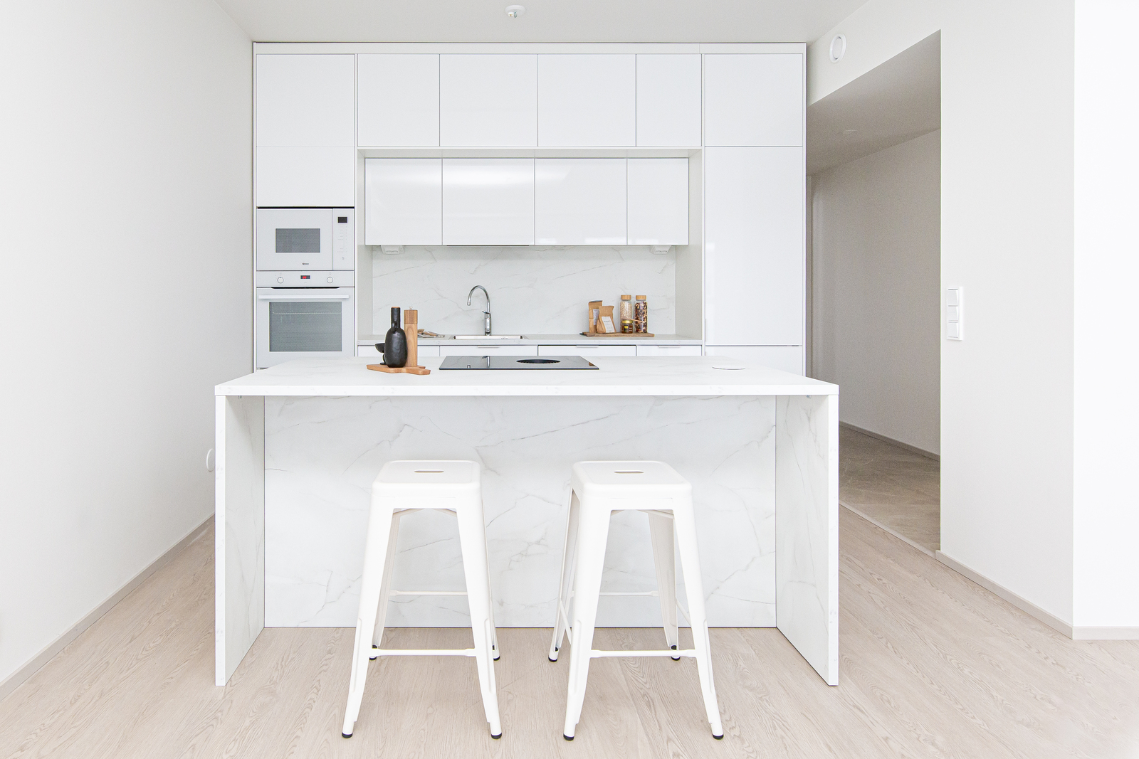 Keittiö ja olohuone muodostavat yhtenäisen, toimivan tilan, joka soveltuu niin arjen sujuvuuteen kuin juhlavampaan yhdessäoloon.