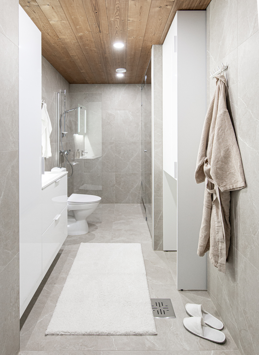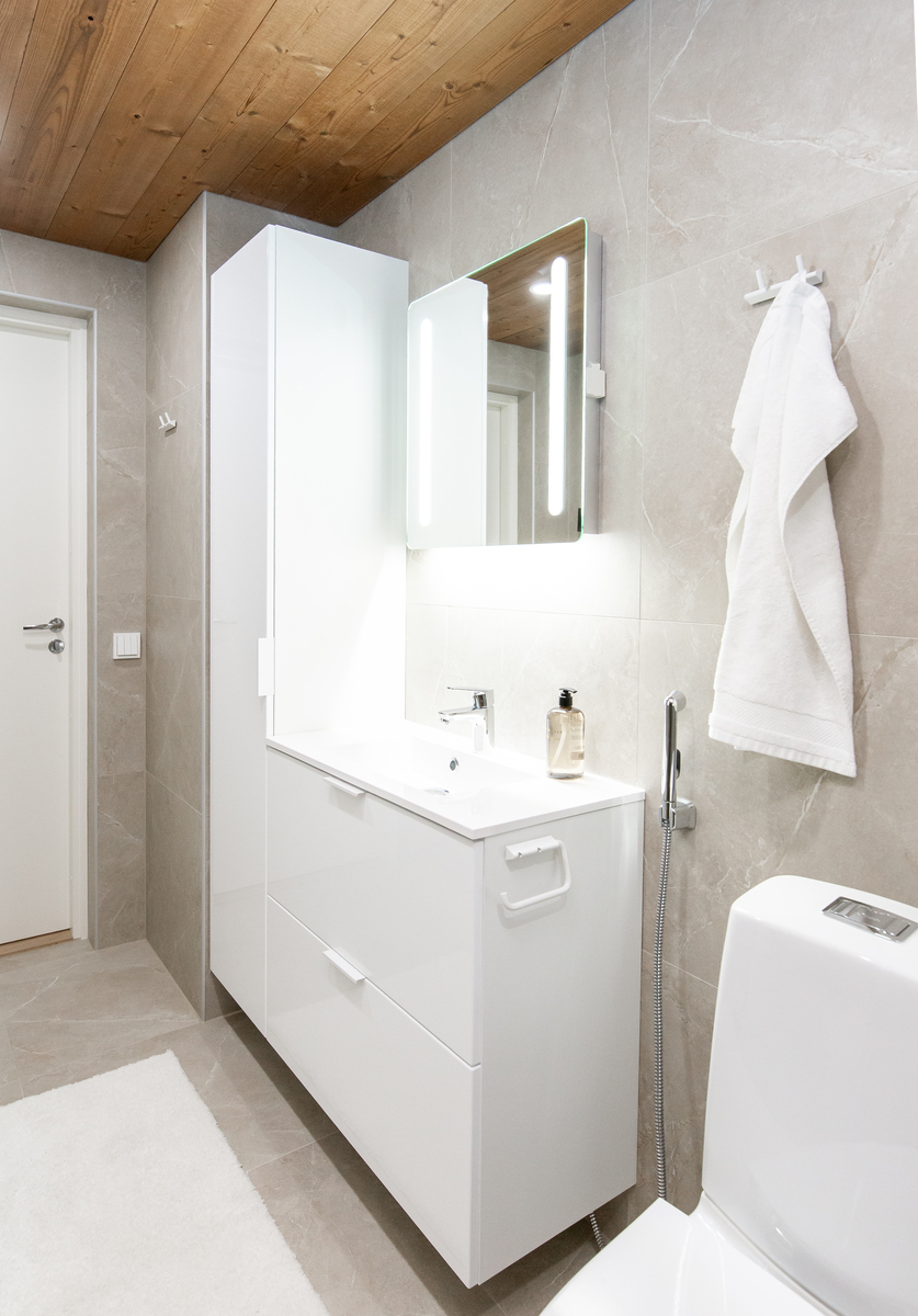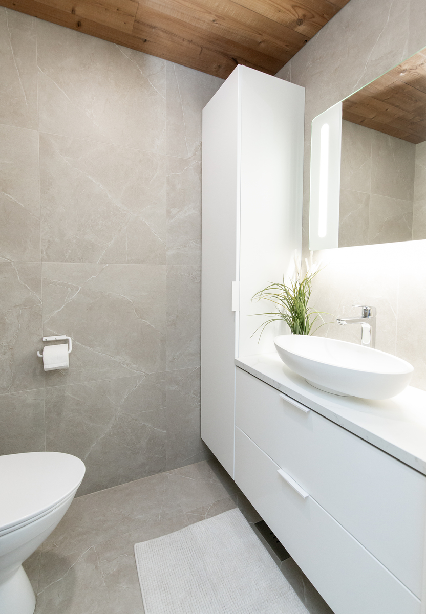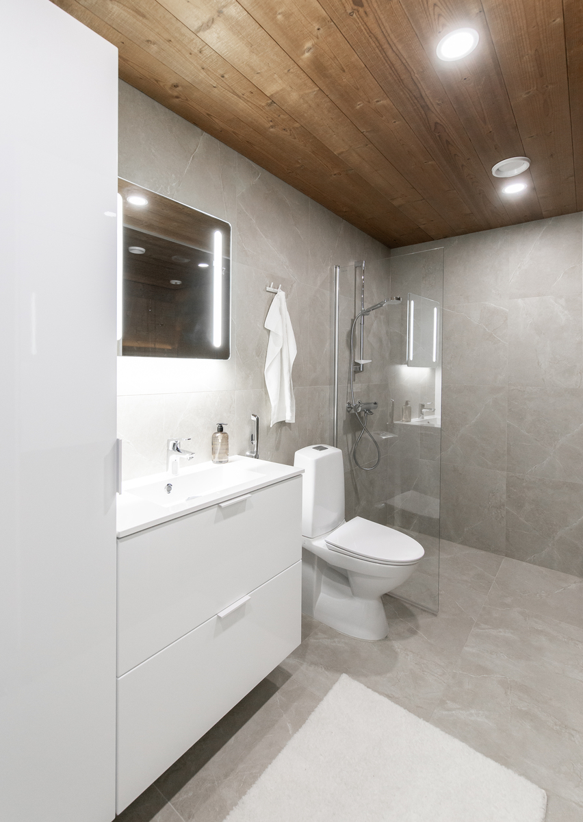 wc-istuin, peili, kiinteät valaisimet, kylpyhuonekaapisto