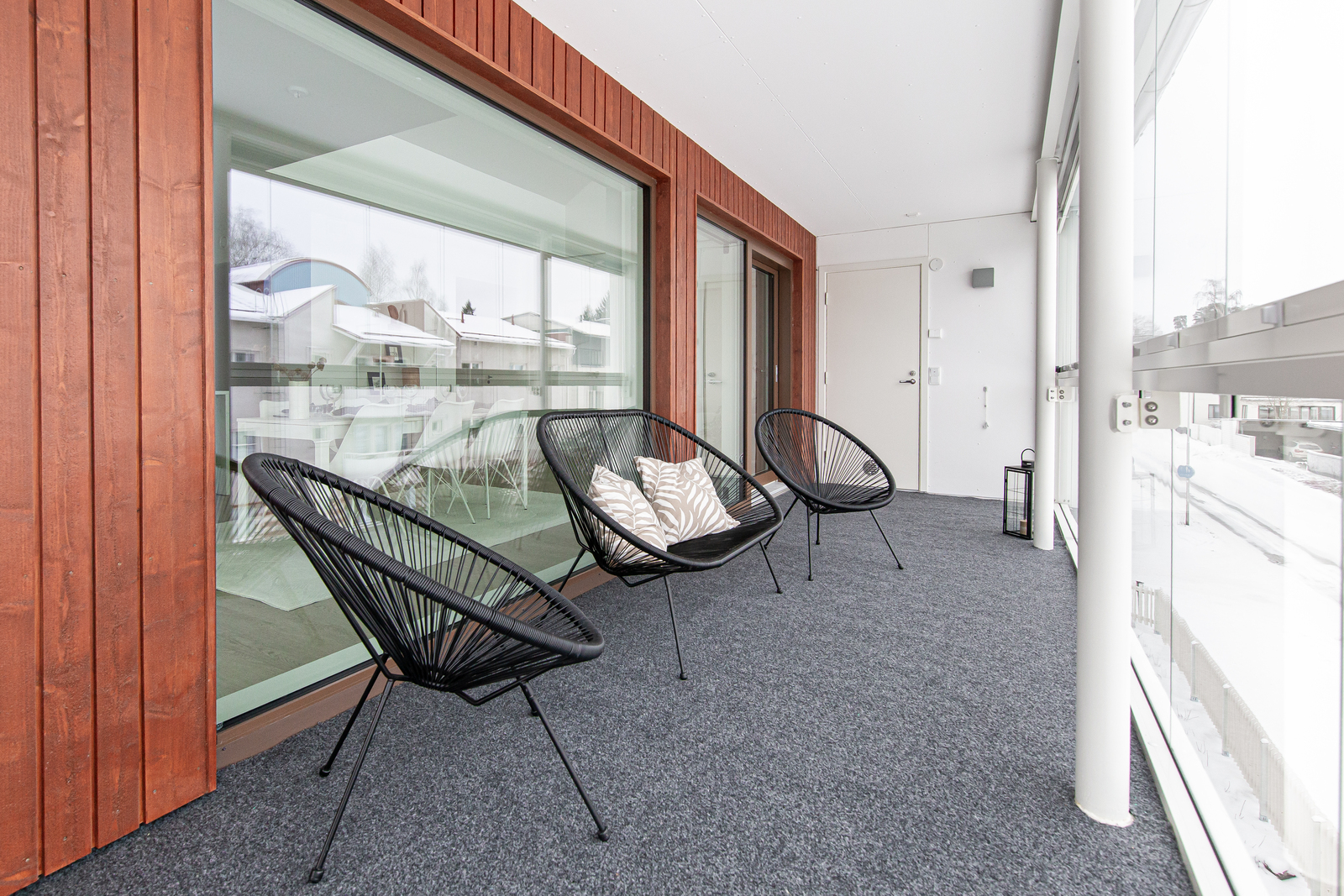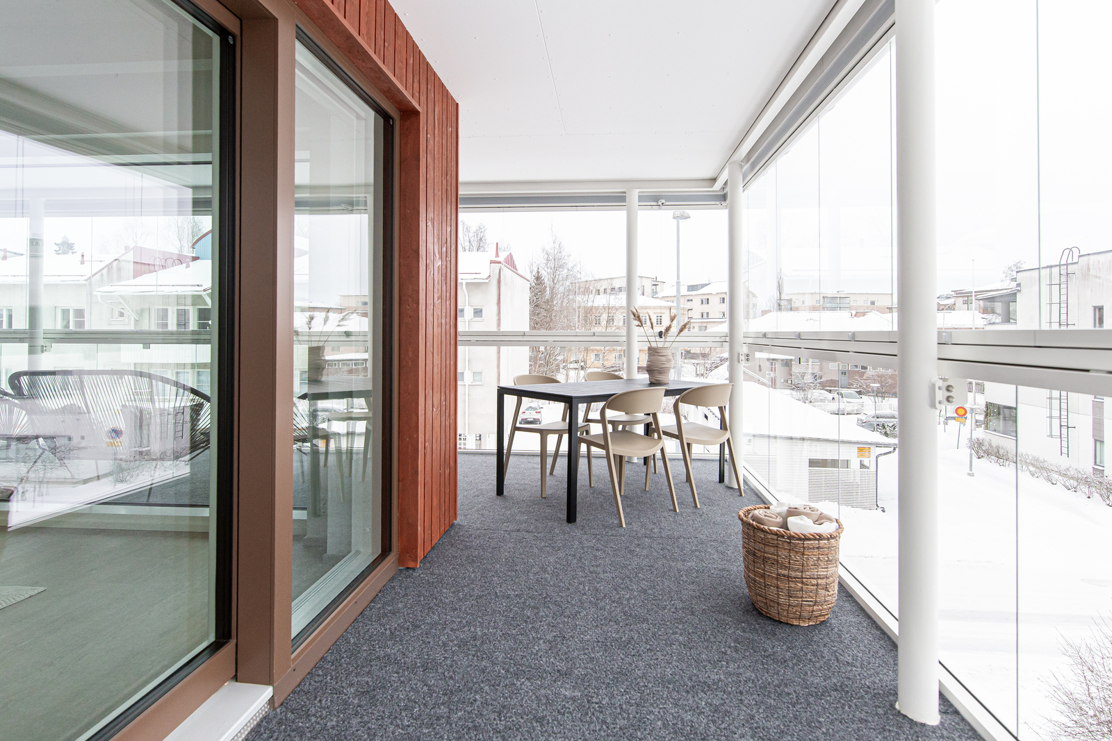 Kodin ehdoton helmi on tilava, lasitettu parveke kahteen suuntaan. Tämä harvinainen ratkaisu tarjoaa valoa ja näkymiä eri ilmansuunnista sekä mahdollistaa parvekkeen käytön pitkälle syksyyn. Ylimmän kerroksen sijainti takaa rauhallisuuden ja yksityisyyden, täällä asut omassa rauhassasi kaupungin yläpuolella.