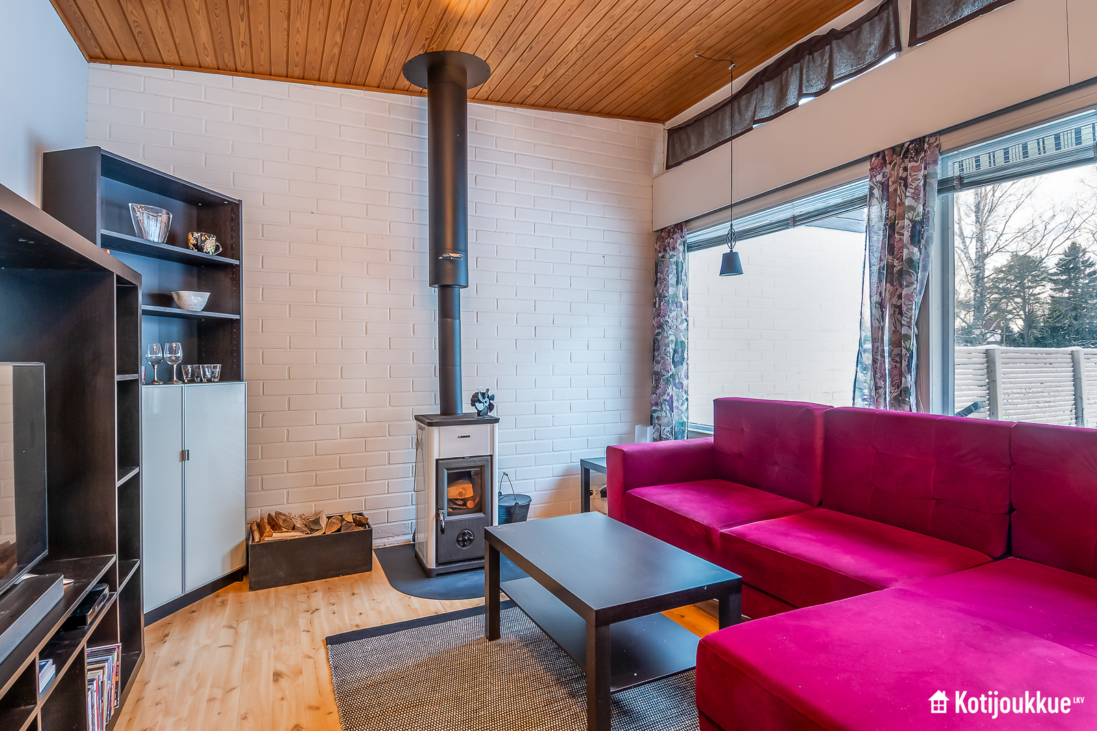 Tunnelmaa ja asuinmukavuutta tuovat asunnon normaalia korkeampi huonekorkeus, ilmalämpöpumppu sekä olohuoneen takkakamiina.