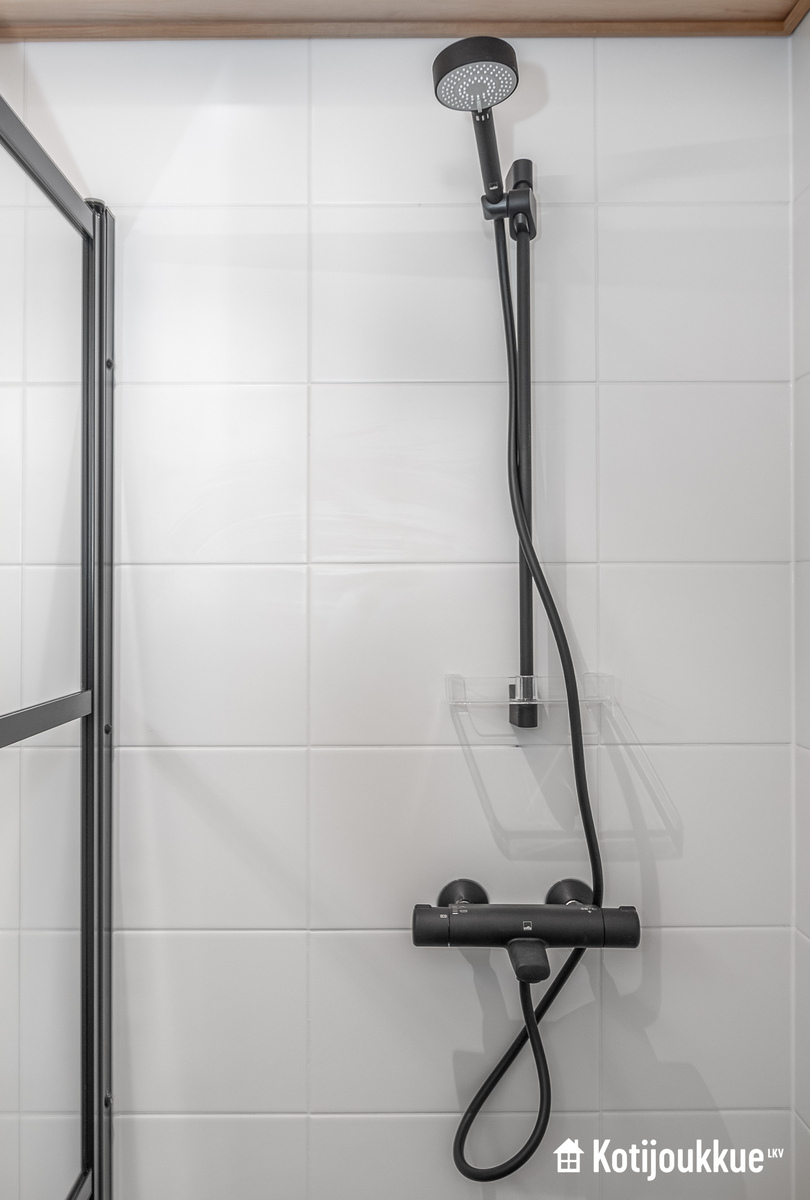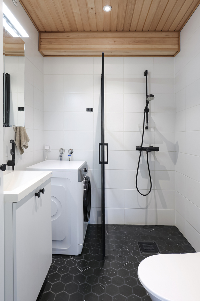 suihkuseinä, pesukoneliitäntä, lattialämmitys, wc-istuin, suihku, peilikaappi, kiinteät valaisimet, kylpyhuonekaapisto