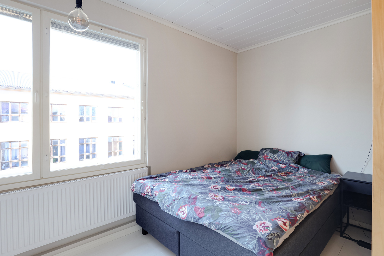 Valoisa olohuone ja alkovi. Ikkunat kahteen suuntaan. / Ljust vardagsrum och alkov. Fönster mot två väderstreck