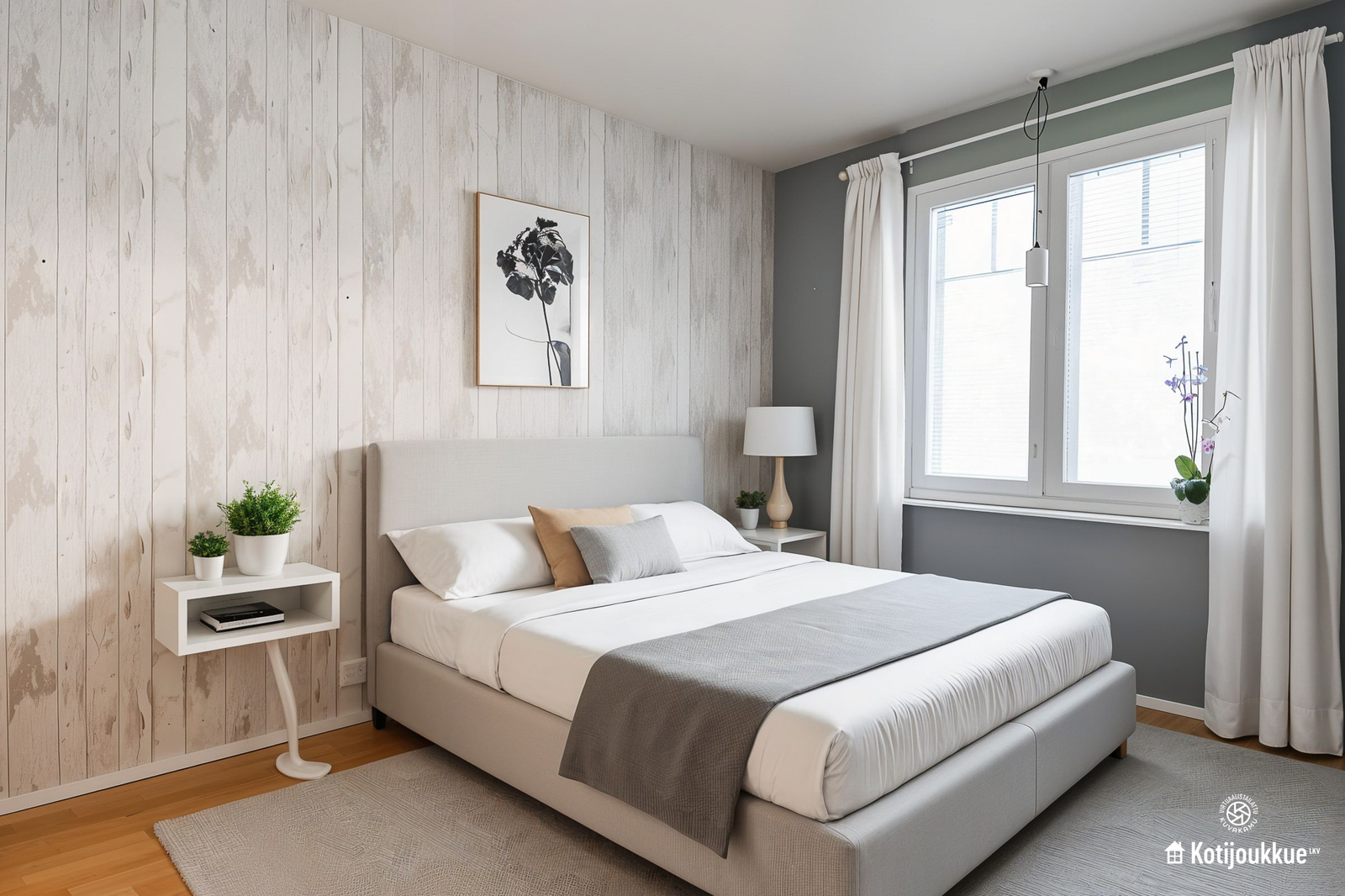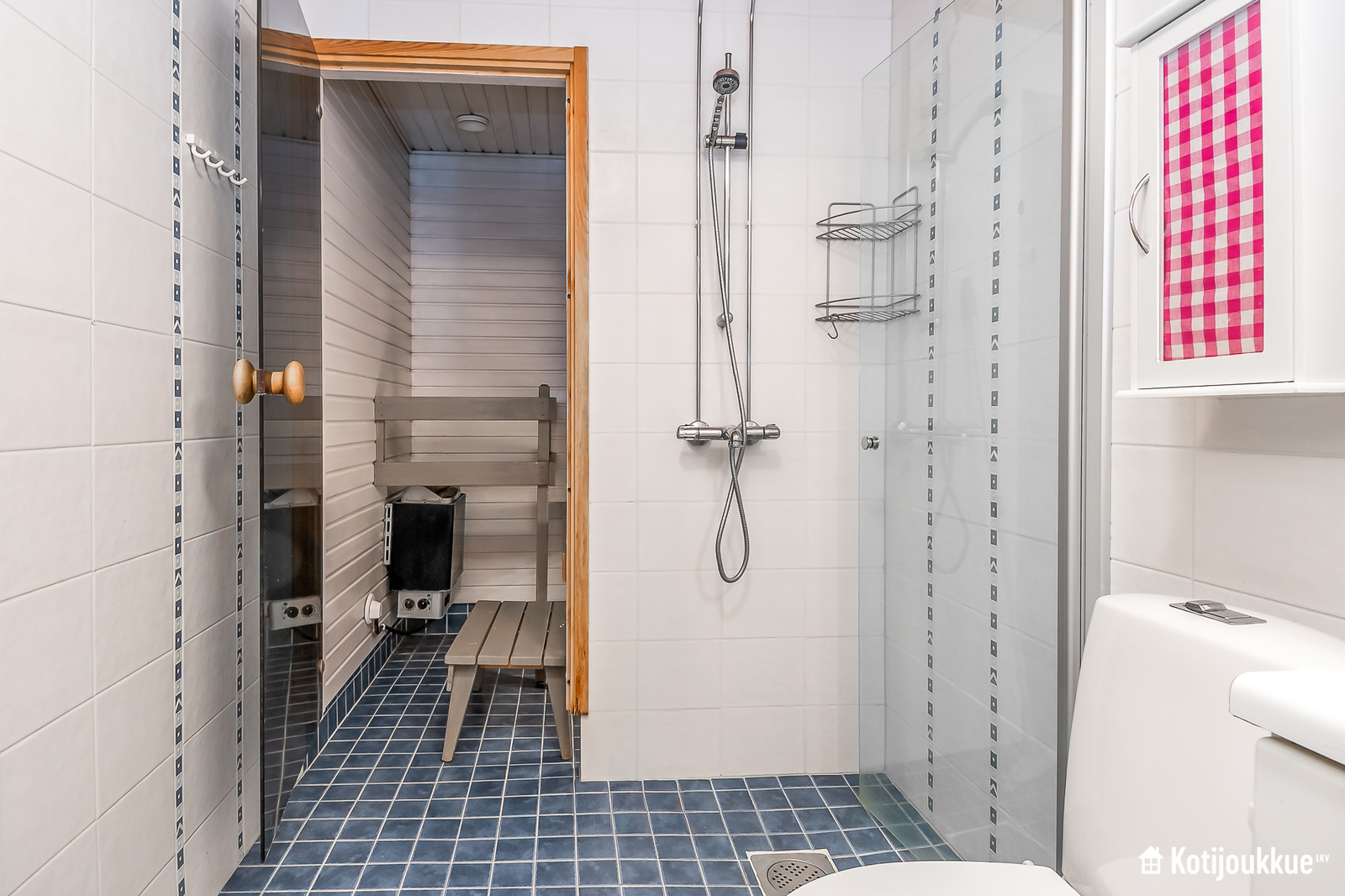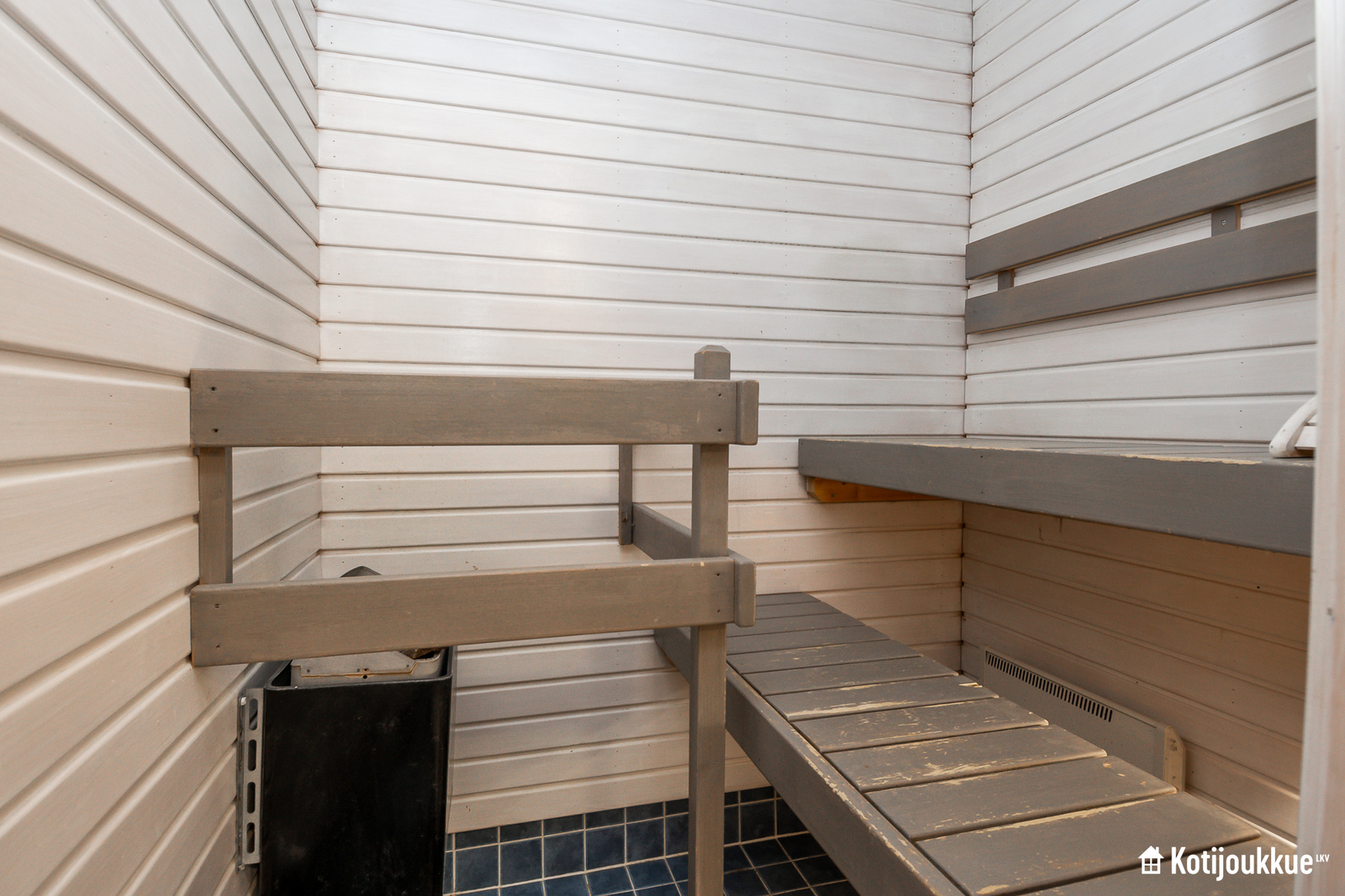 Makuuhuone on sijoitettu eteiskäytävän varrelle ja täällä on hyvin tilaa niin leveälle sängylle kuin vaikka työpisteelle. Oma sauna tarjoaa pehmeät löylyt ja kylpyhuoneesta löytyy tilat sekä peseytymiselle, että pyykkihuollolle. Myös säilytystilan riittävyydestä on huolehdittu erilaisten kaapistojen muodossa ja lisää tilaa on myös asunnon yhteydessä olevassa ulkovarastossa.