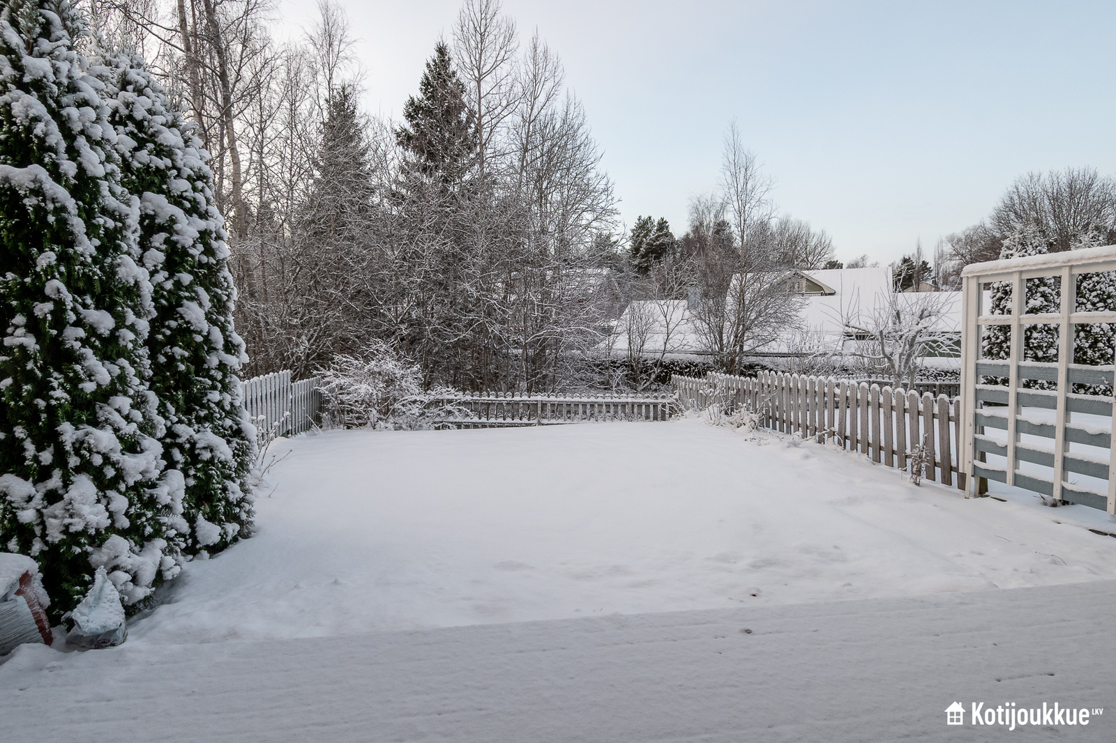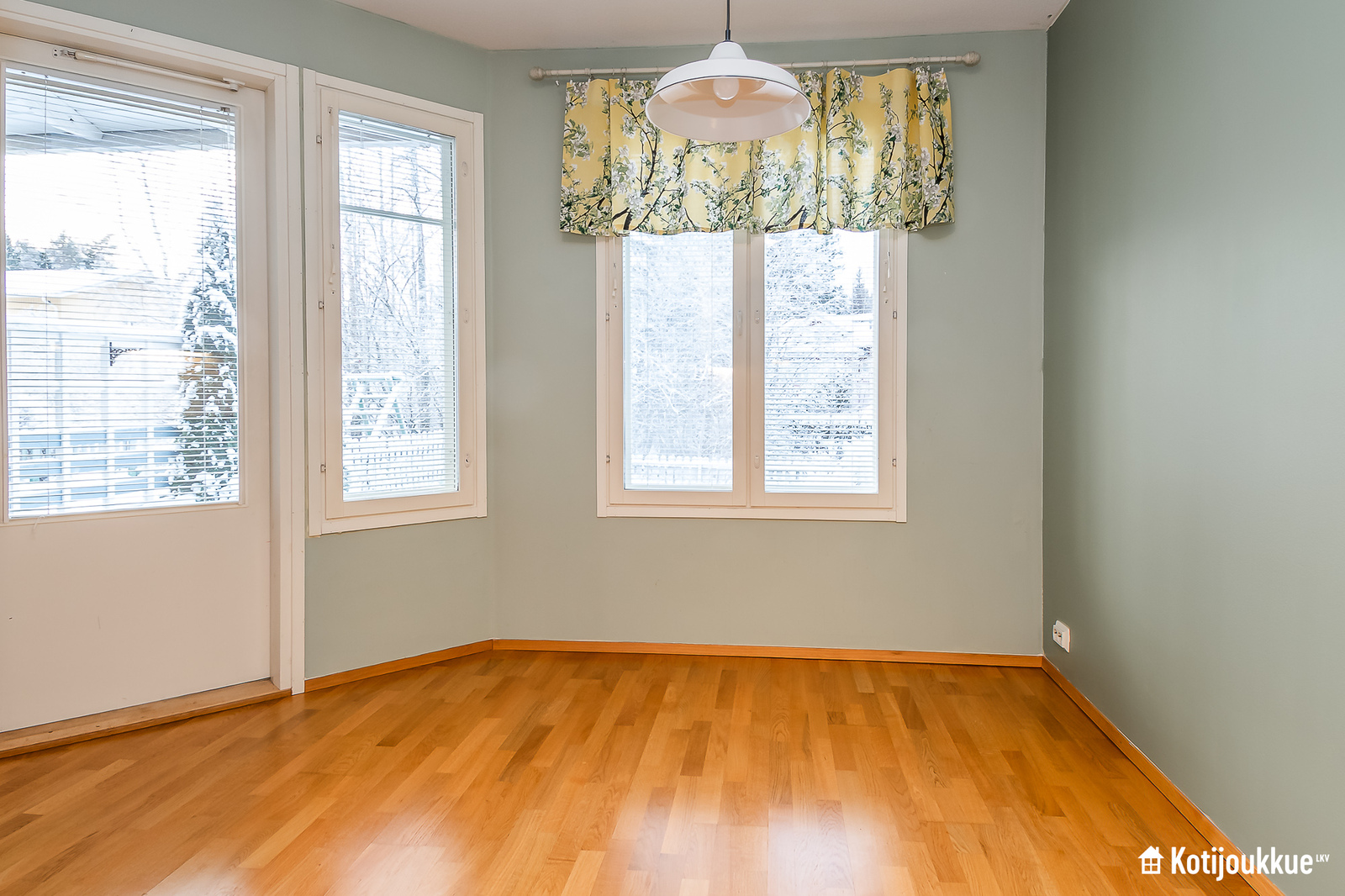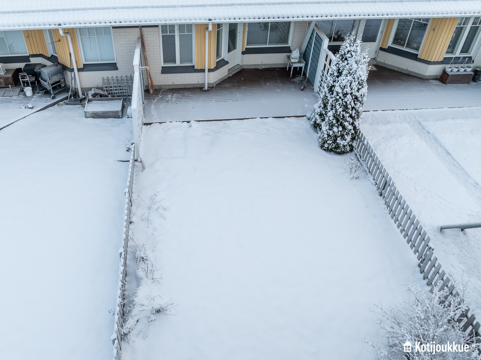 Keittiö yhdistyy ruokailutilan kautta olohuoneeseen, jossa on reilusti tilaa yhdessäololle. Tilan avaruutta ja yhtenäisyyttä korostaa huoneissa käytetty puunsävyinen lattia. Olohuoneesta on käynti edelleen aidatulle takapihalle, jonka terassilla on sopivasti tilaa vaikkapa grillailemiseen ja aurinkoisista päivistä nauttimiseen.
