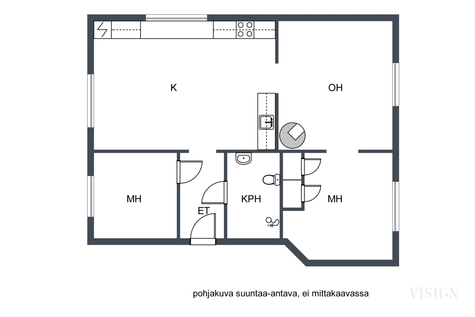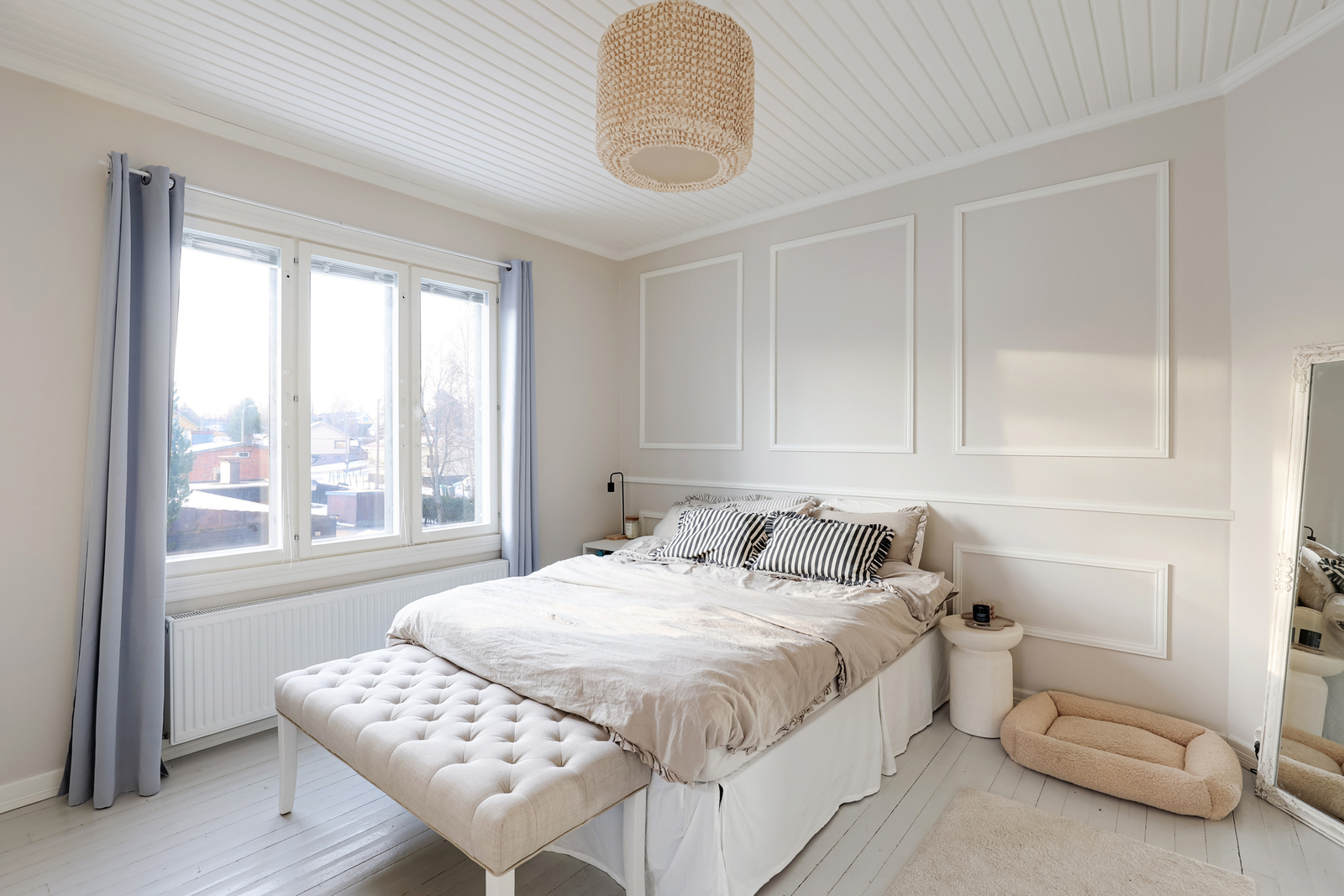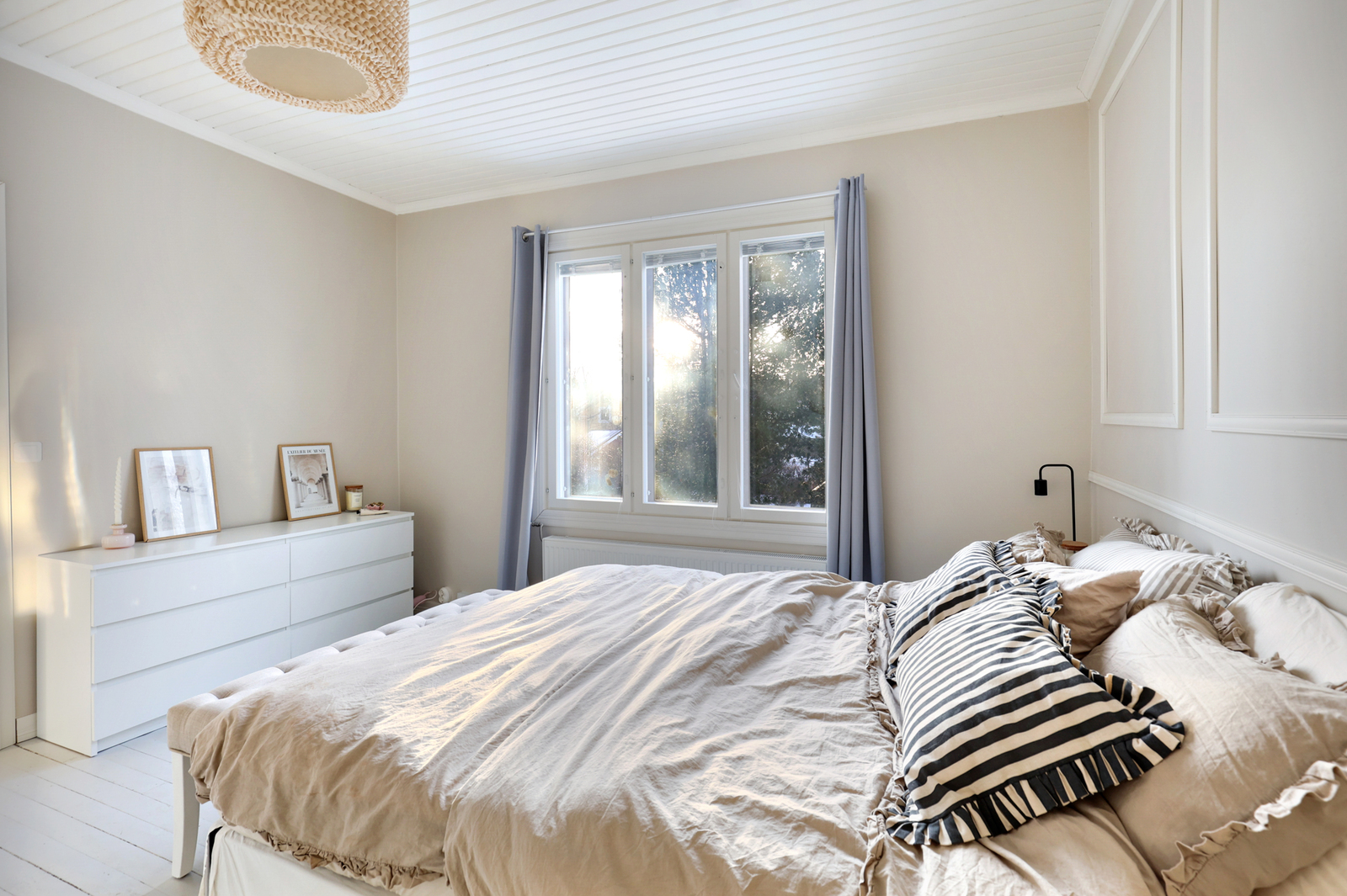 Olohuone on kookas, joten tilaan on helppo sisustaa kaikki arkeen tarvittava. Yhtä lailla myös makuuhuoneet ovat reilunkokoisia ja säilytystilasta huolehtii runsaat kaappitilat. Harmoninen tyylikkyys jatkuu kylpyhuoneen kaluste- ja laattavalinnoissa ja täällä sujuu aamun askareet.