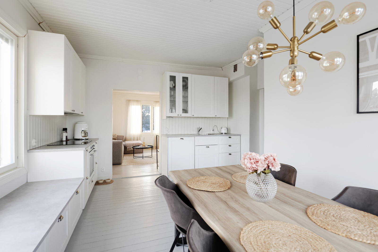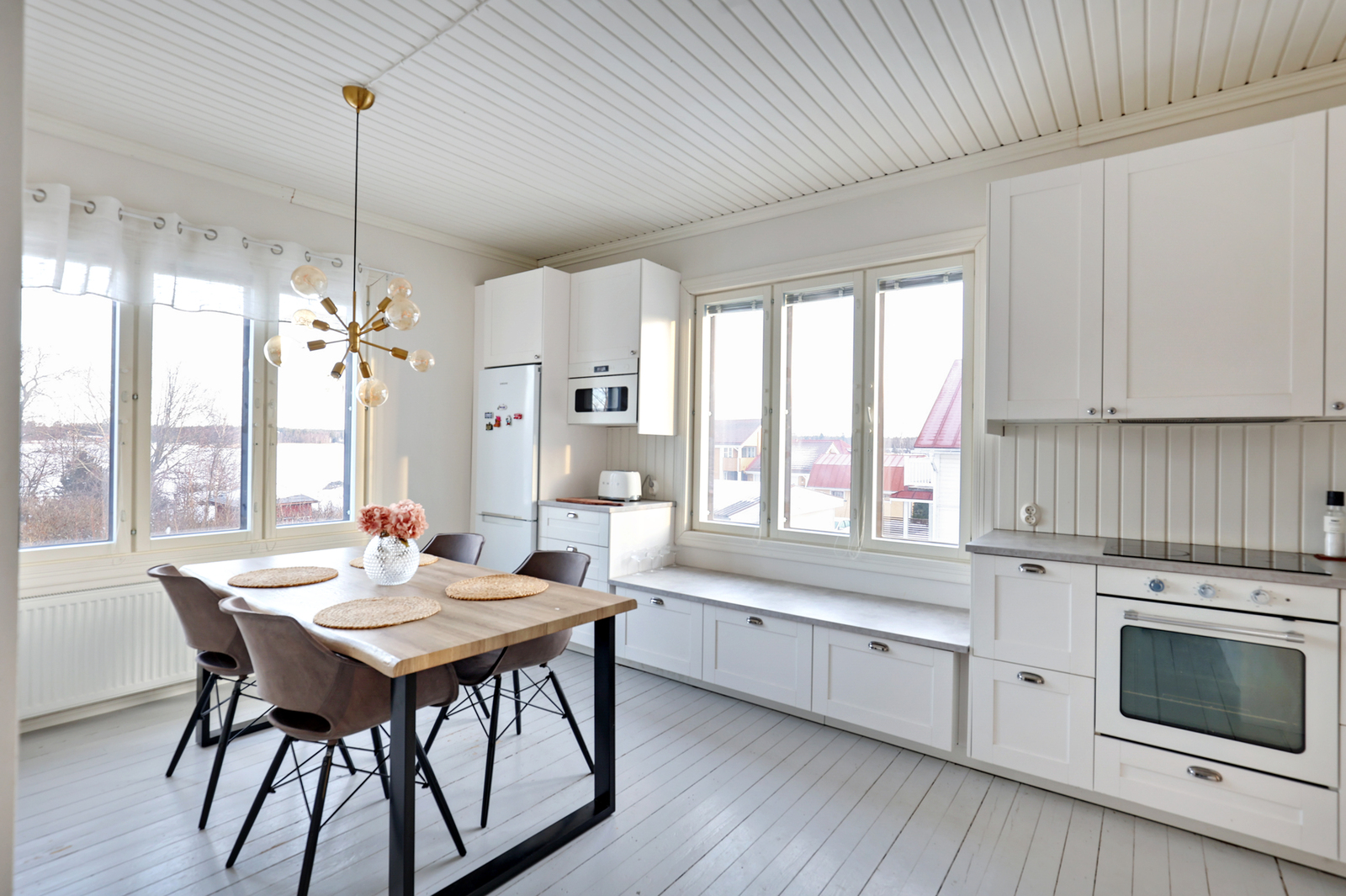 Avara eteinen ohjaa kulun kodin eri tiloihin ja kahteen suuntaan avautuvat ikkunat tuovat päivänvalon kauniisti sisään. Kodin sydän on kaunis keittiö, josta löytyy reilusti säilytys- sekä laskutilaa, joten innokas kotikokki löytää täältä varmasti paikkansa.