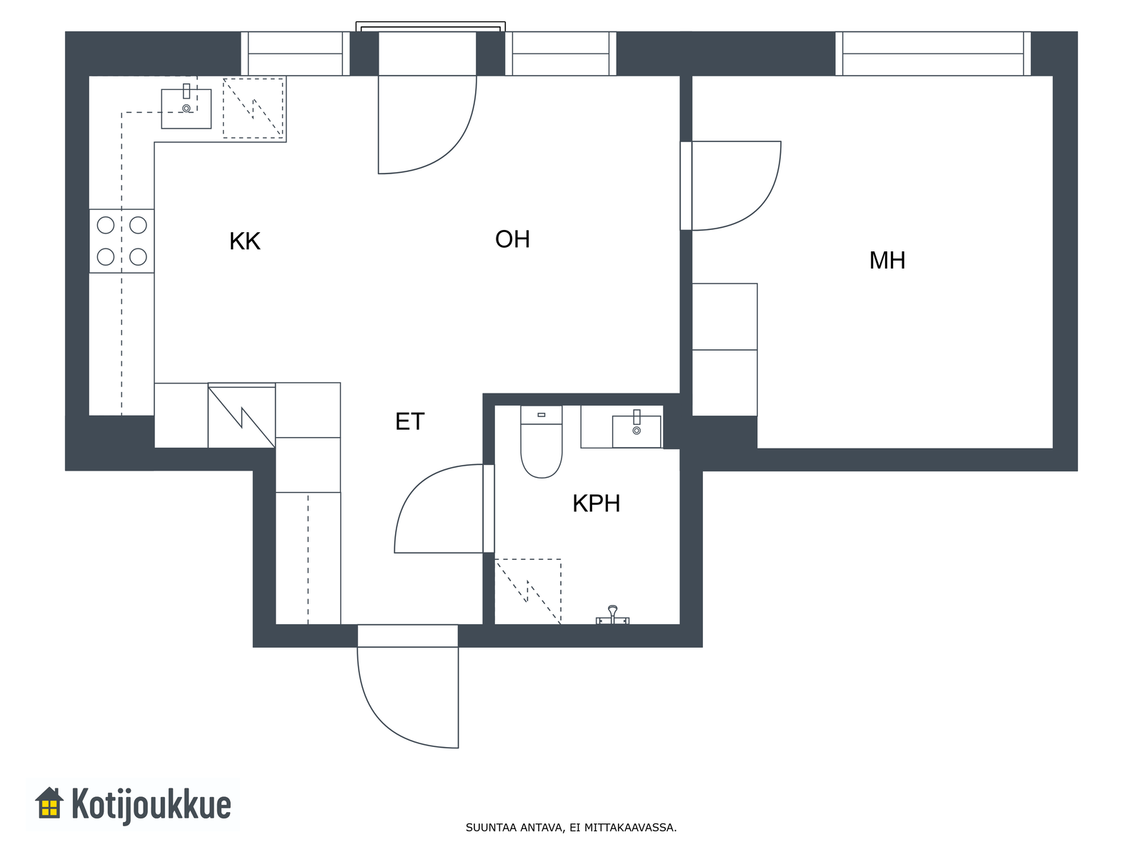 1 h, avokeittiö, kph/wc (yhtiöjärjestyksen mukaan 2h+k+wc)