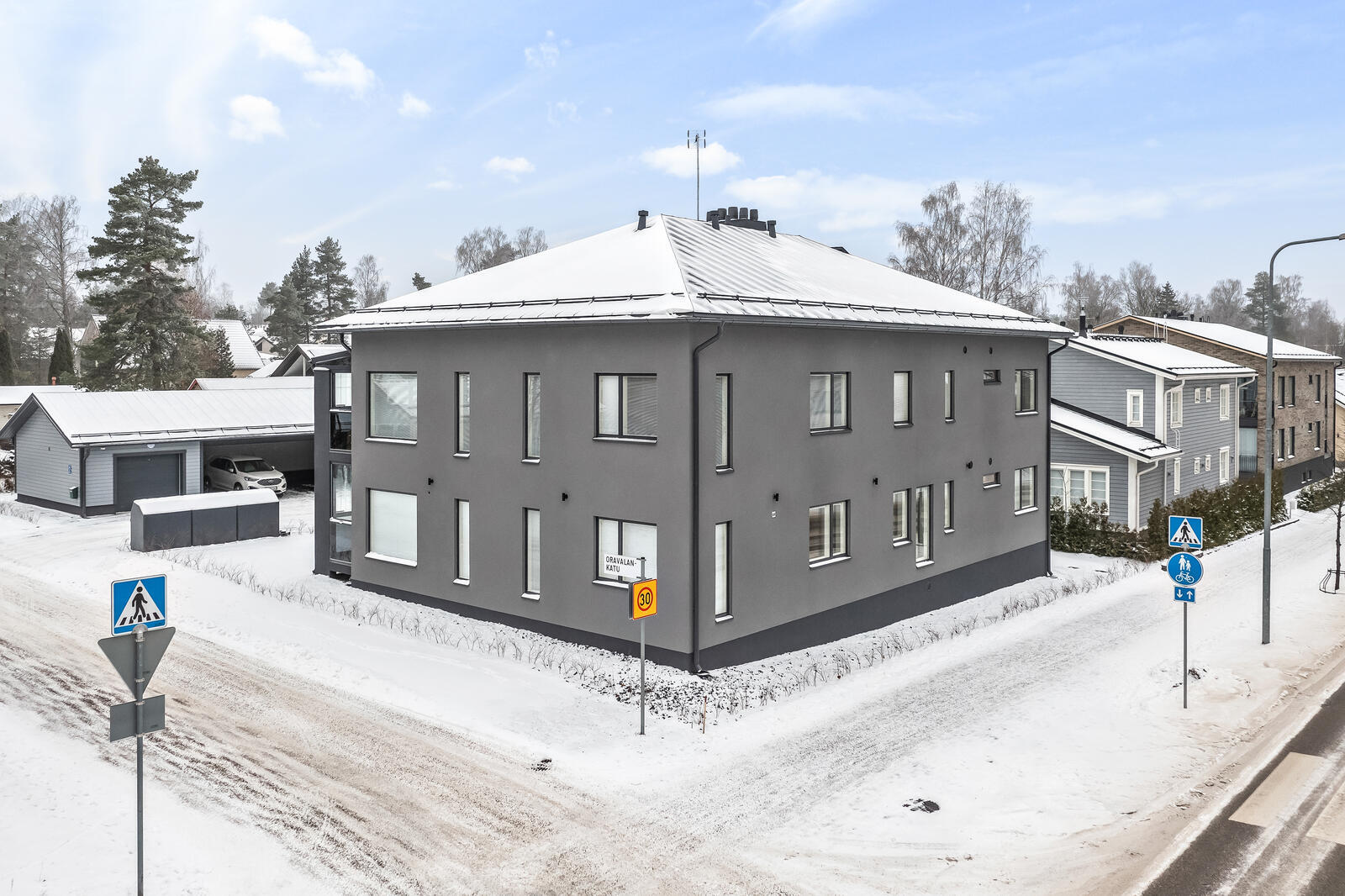 Autotalli erillisenä osakkeena. Kaikkiin huoneistoihin kuuluu yksi autokatospaikka.
