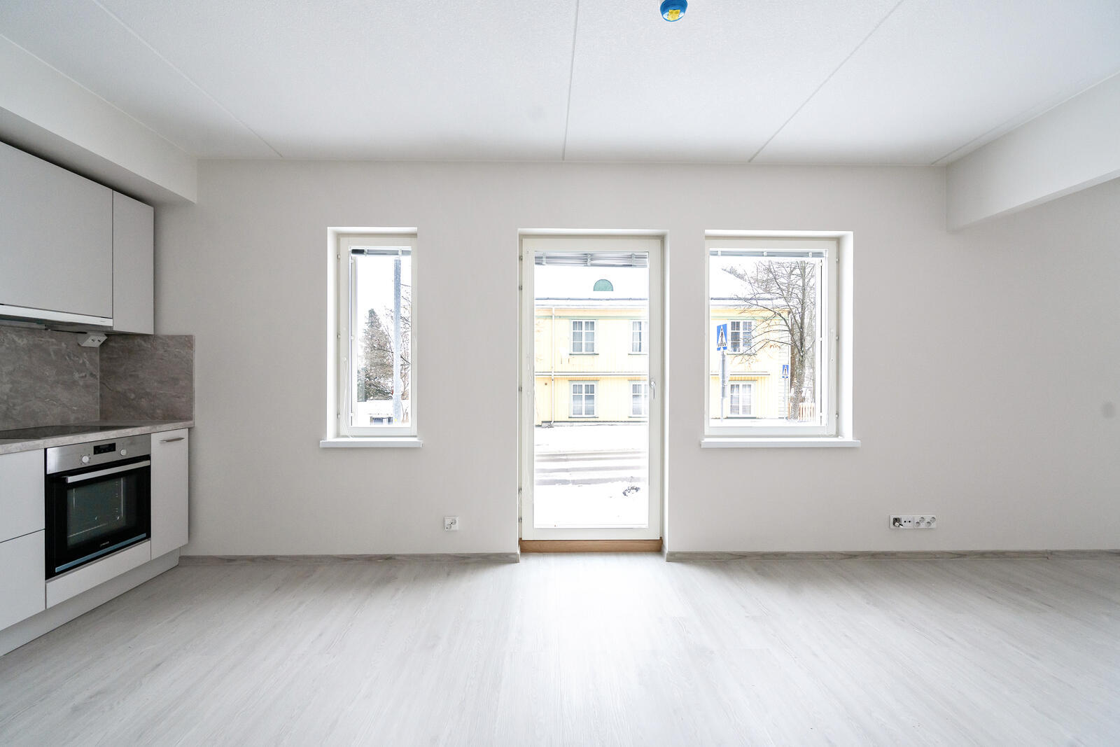 Olohuone ja keittiö yhtenäistä tilaa.